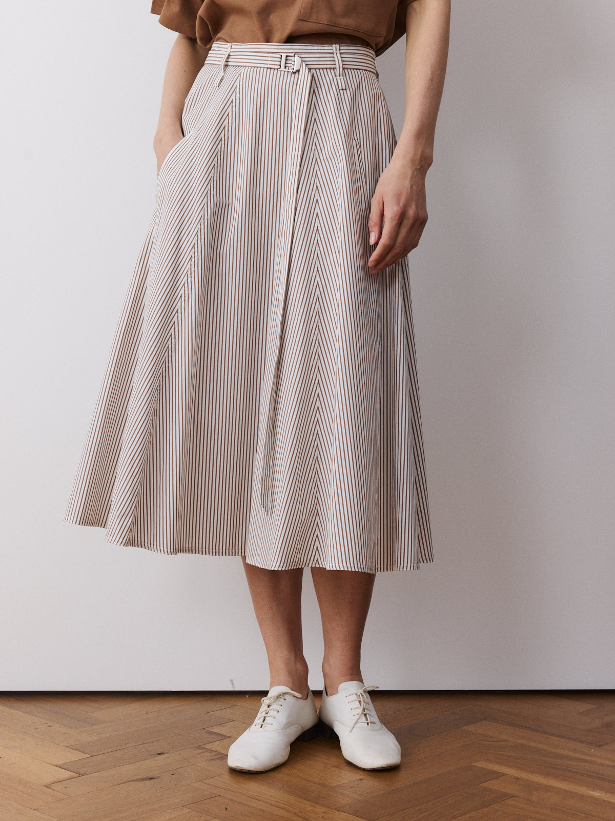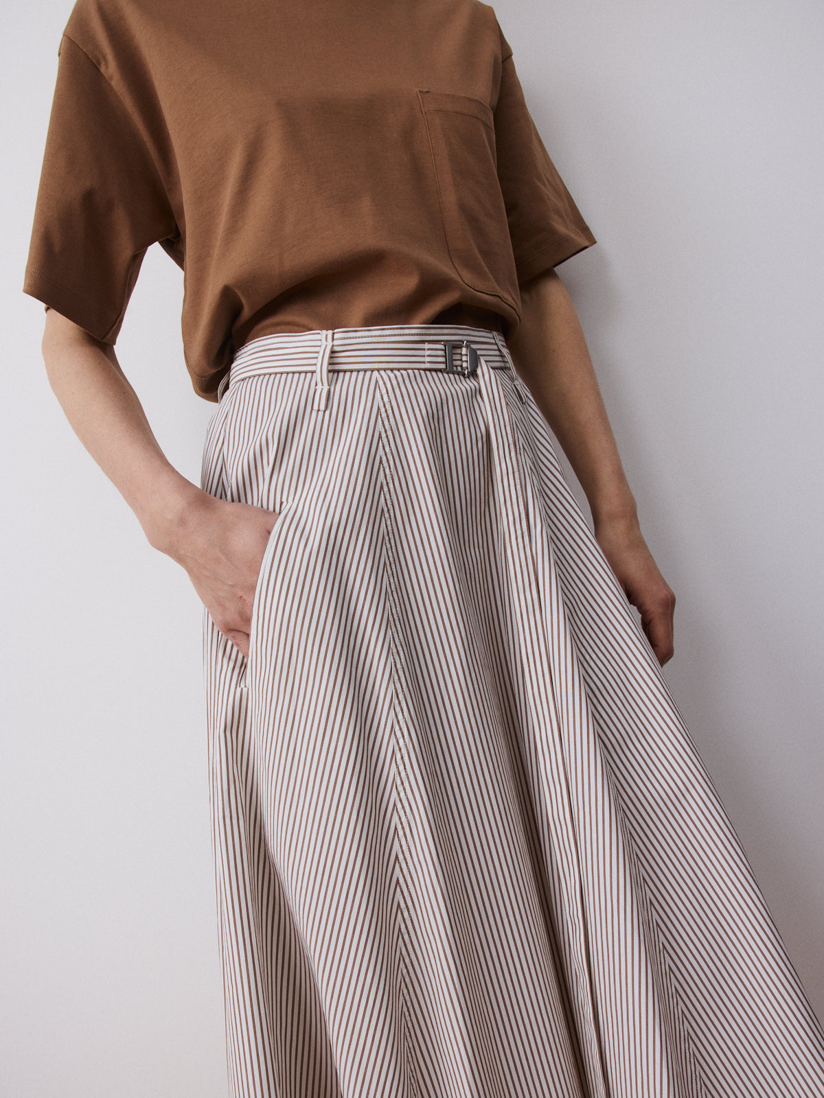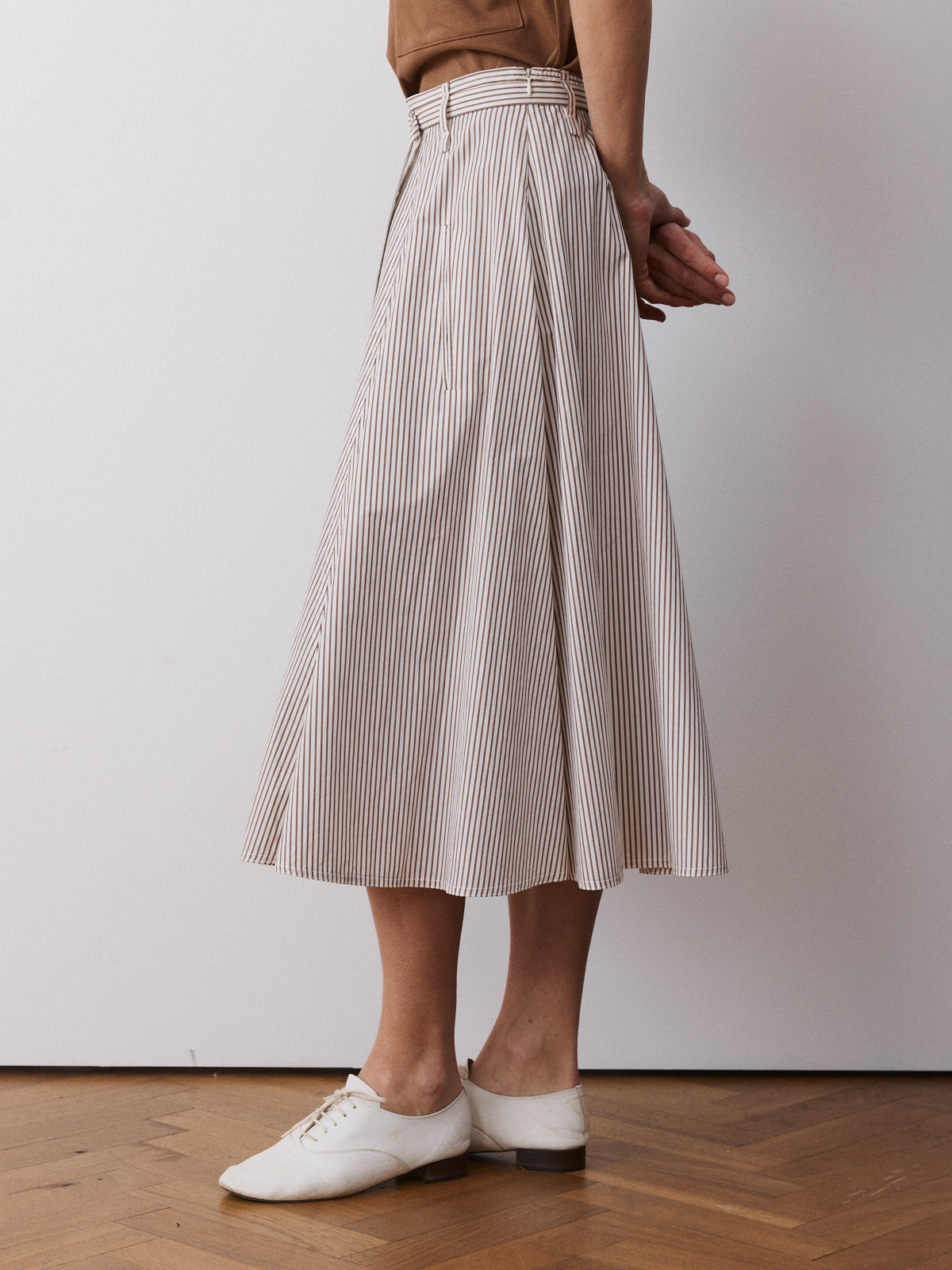Lightweight and expressive, this midi skirt is designed for summer days. Cut with a high-rise and clean lines, it plays with proportion and movement. The ecru base, marked by a fine brown stripe, gives the piece a graphic, summery character.