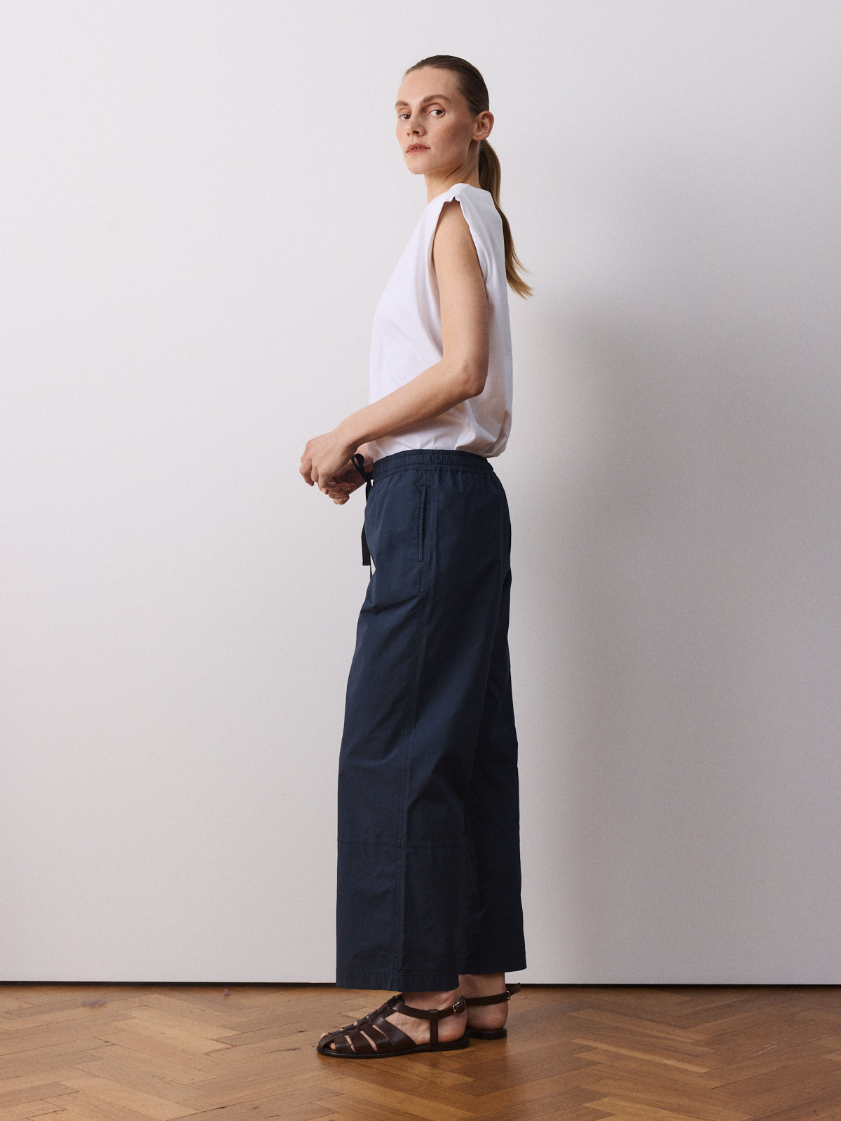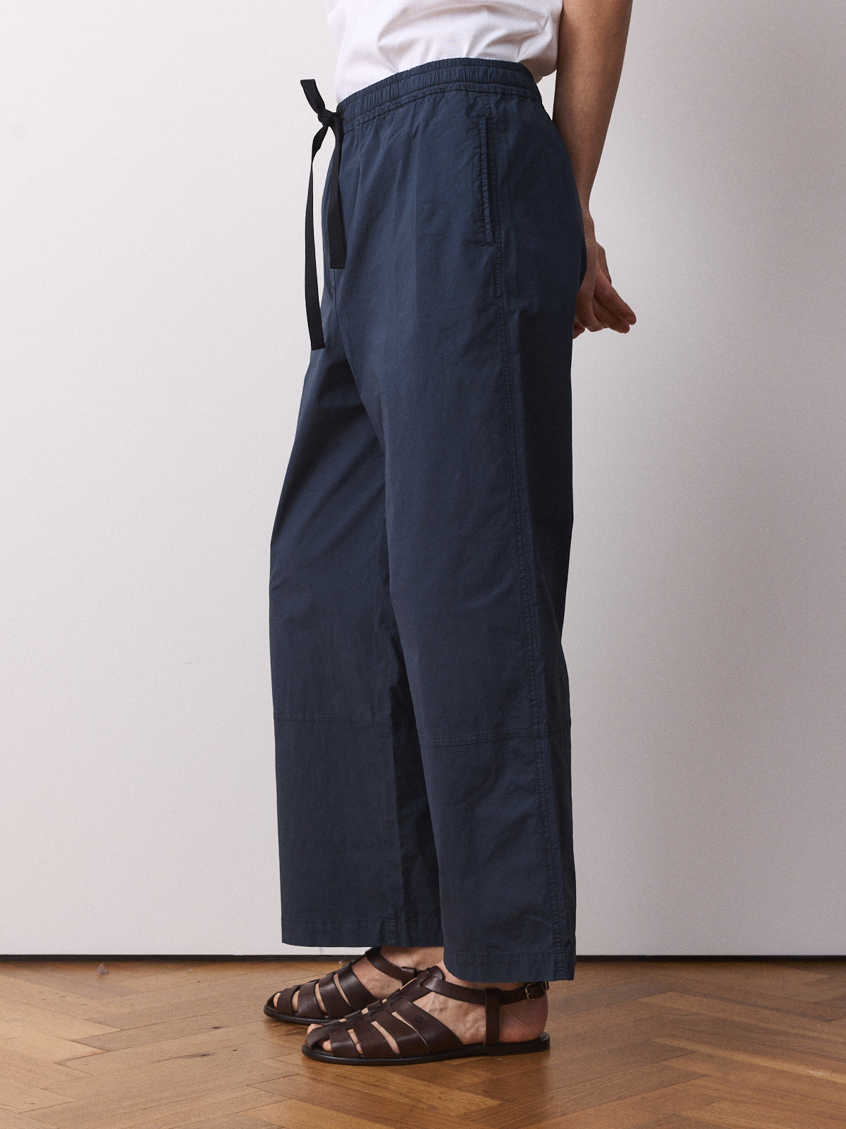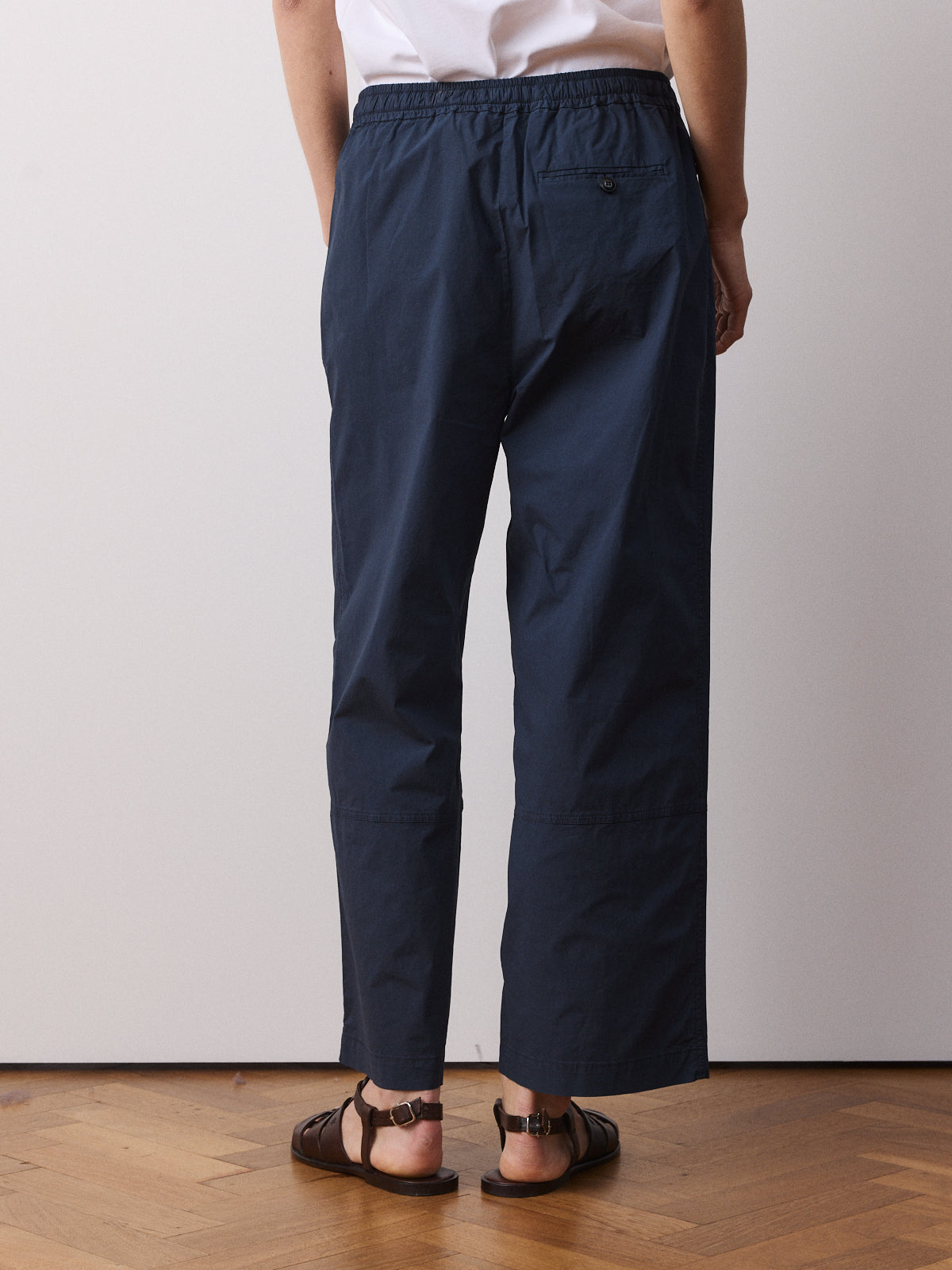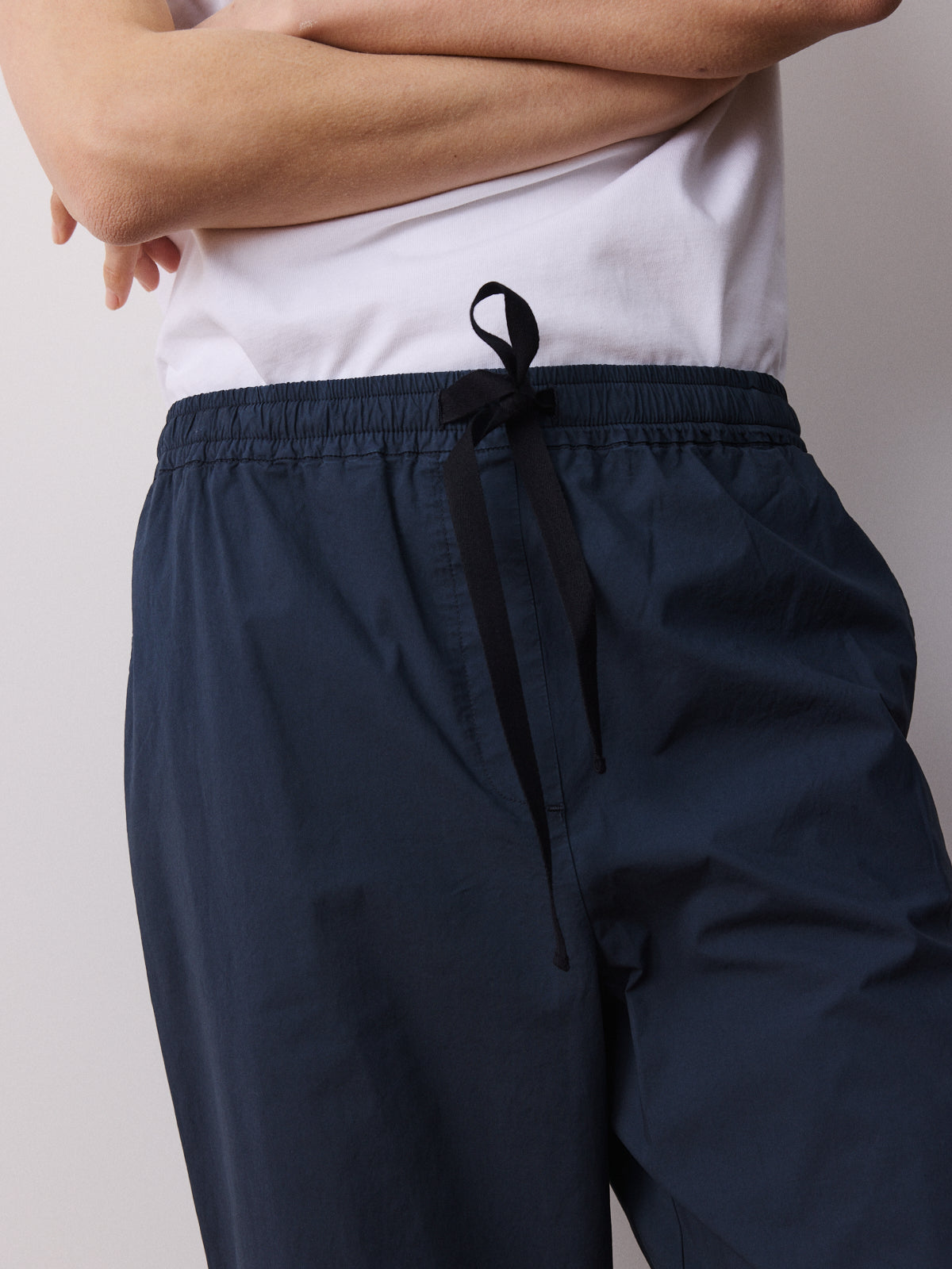 This pair of trousers is a comfortable wardrobe basic. Cut from a garment-dyed woven fabric in deep navy with a matte finish. Designed with a mid-rise, straight leg to the ankle and an elasticated waistband with black drawstring.