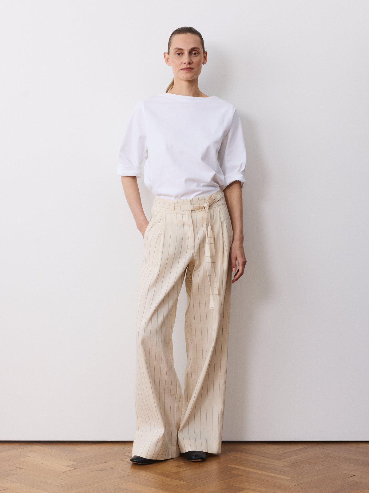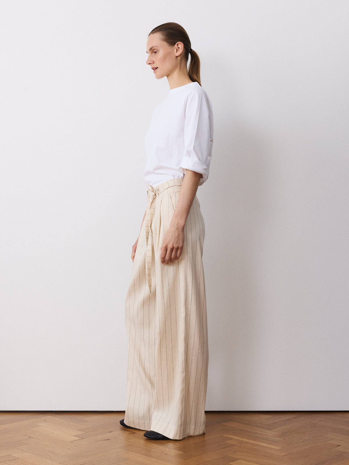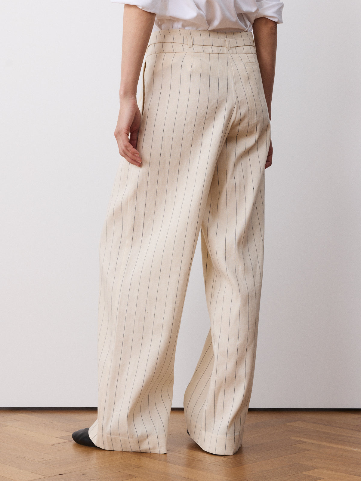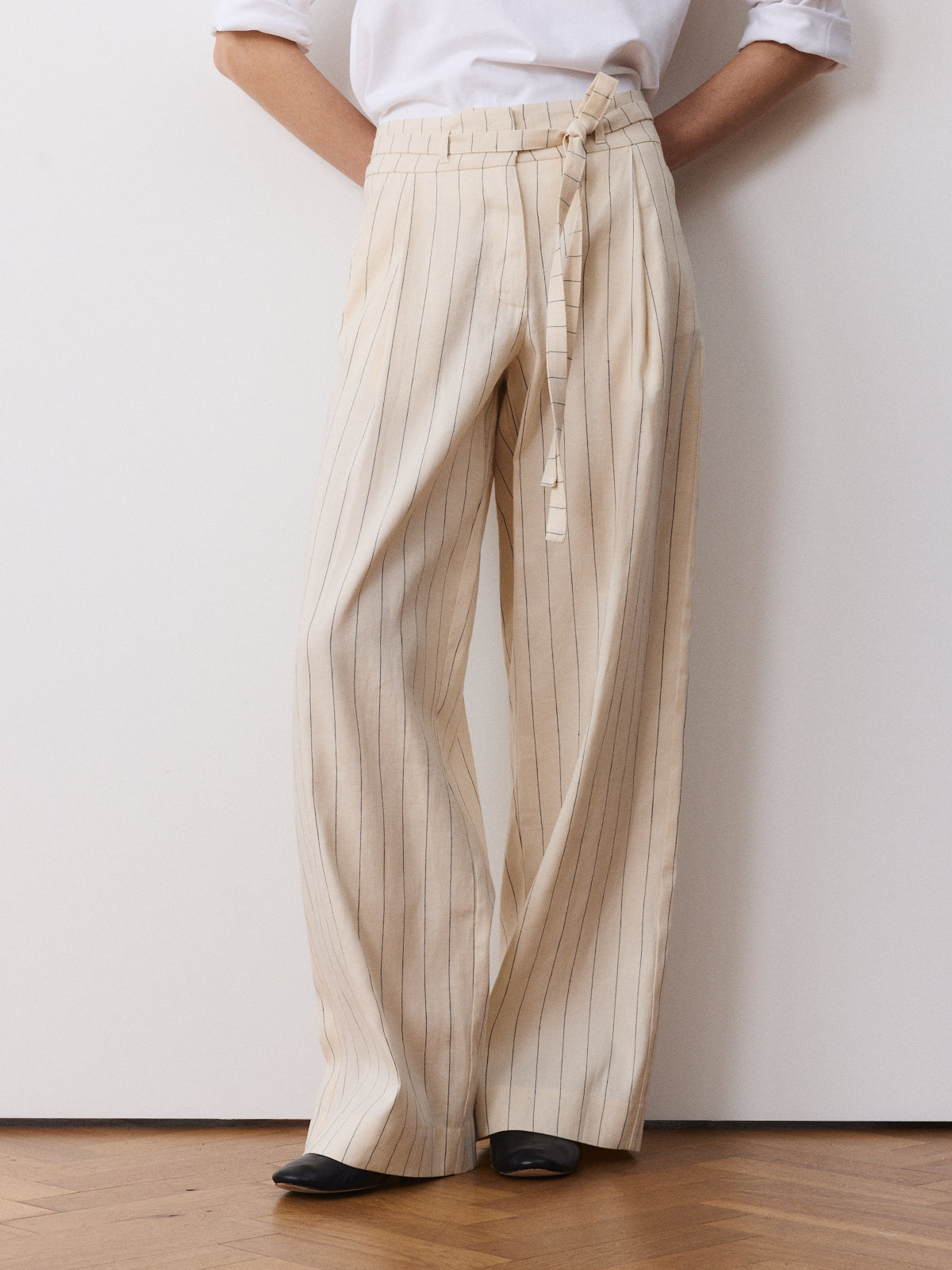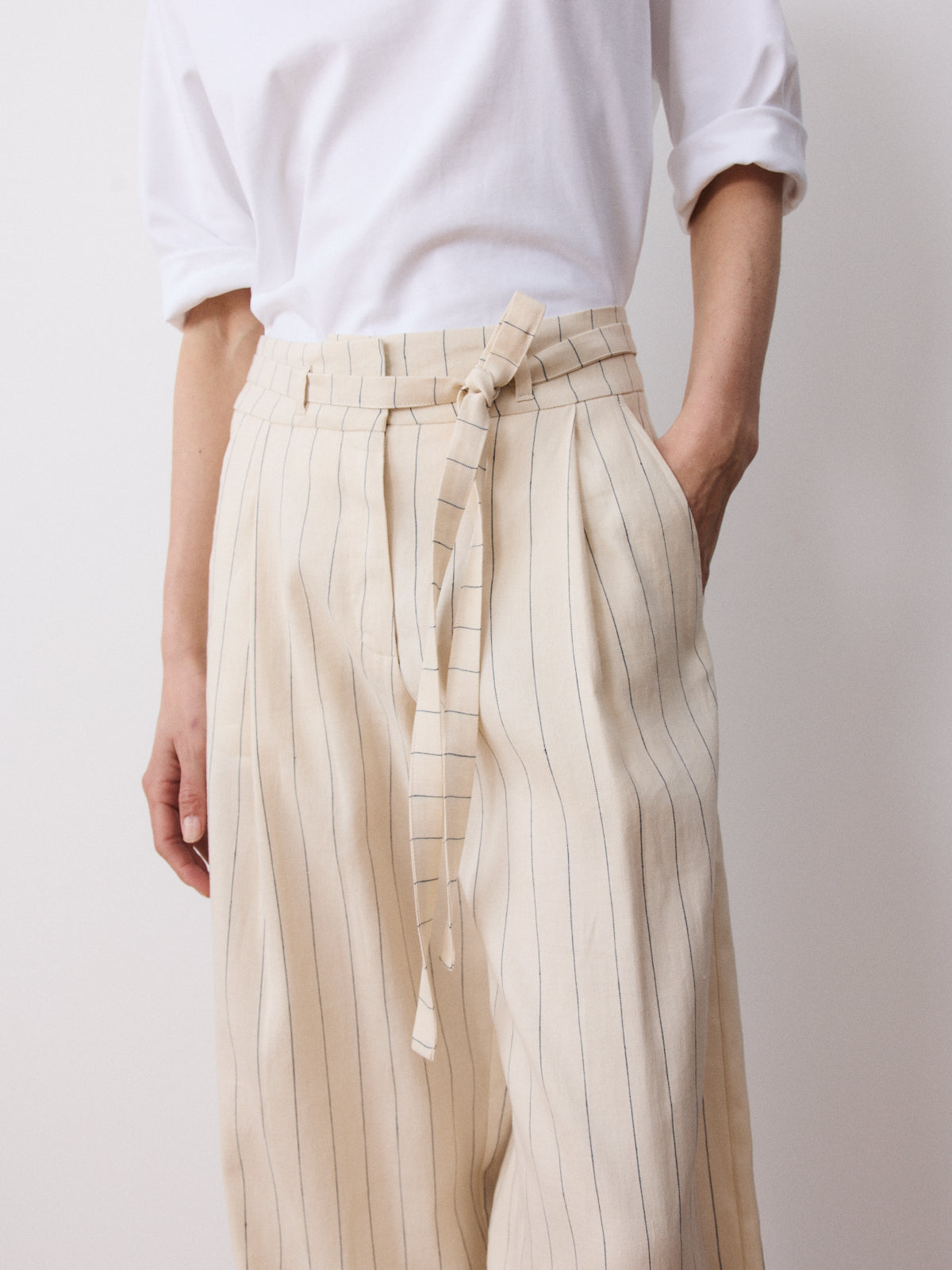 This season’s variation on our bestselling trousers, this wide-leg style returns with a high-rise waist, pleated front and full length. Crafted from a cream linen and cotton fabric with a fine pinstripe.