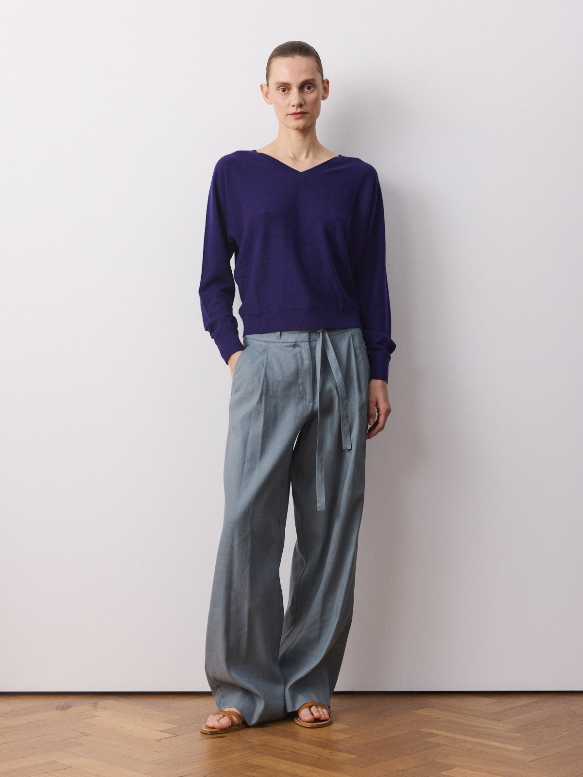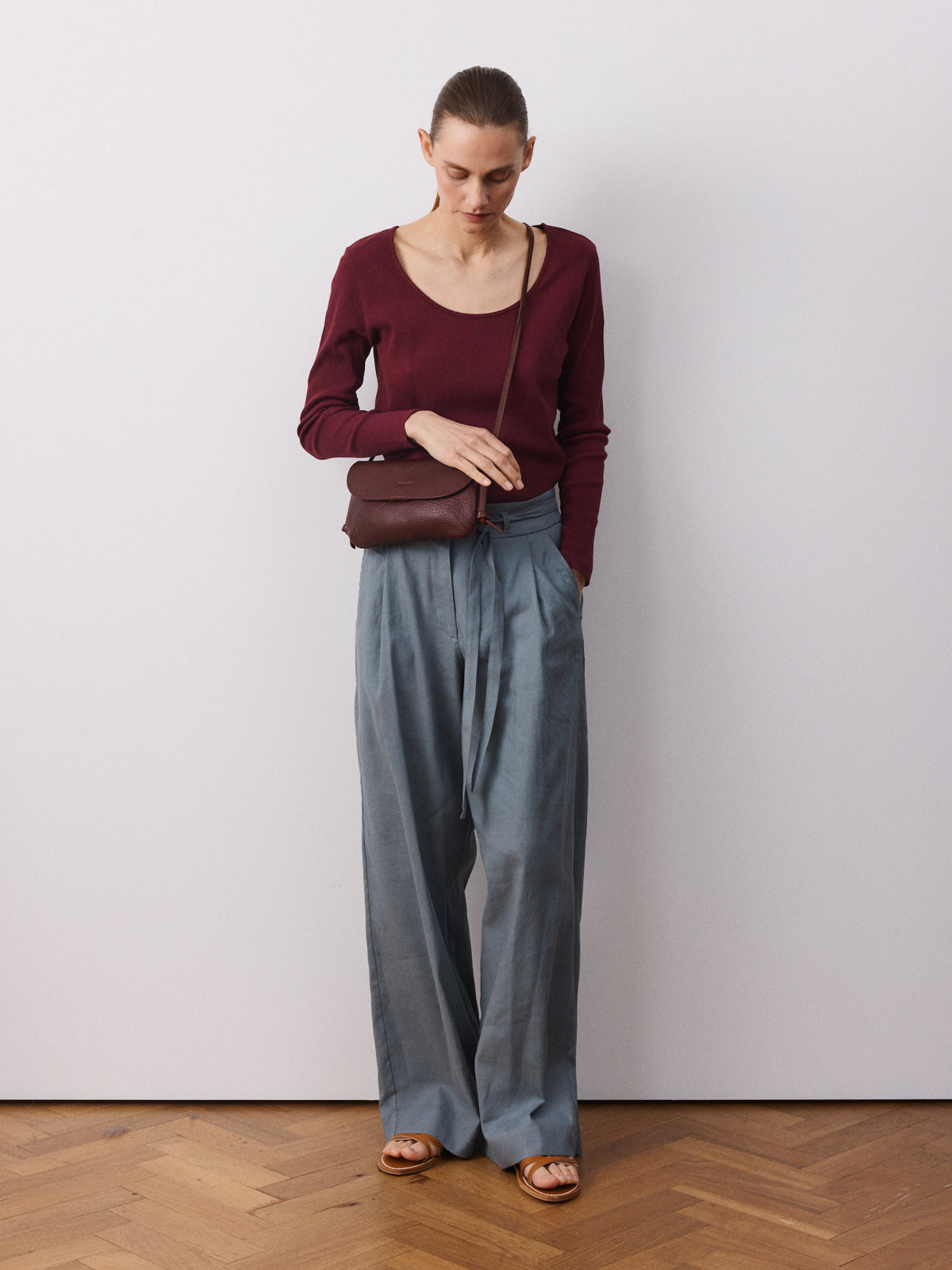 This season’s variation on our bestselling trousers, this wide-leg style returns with a high-rise waist, pleated front and full length. Crafted from a textured linen and cotton blend in blue-grey with an artisanal, bourette-like surface.