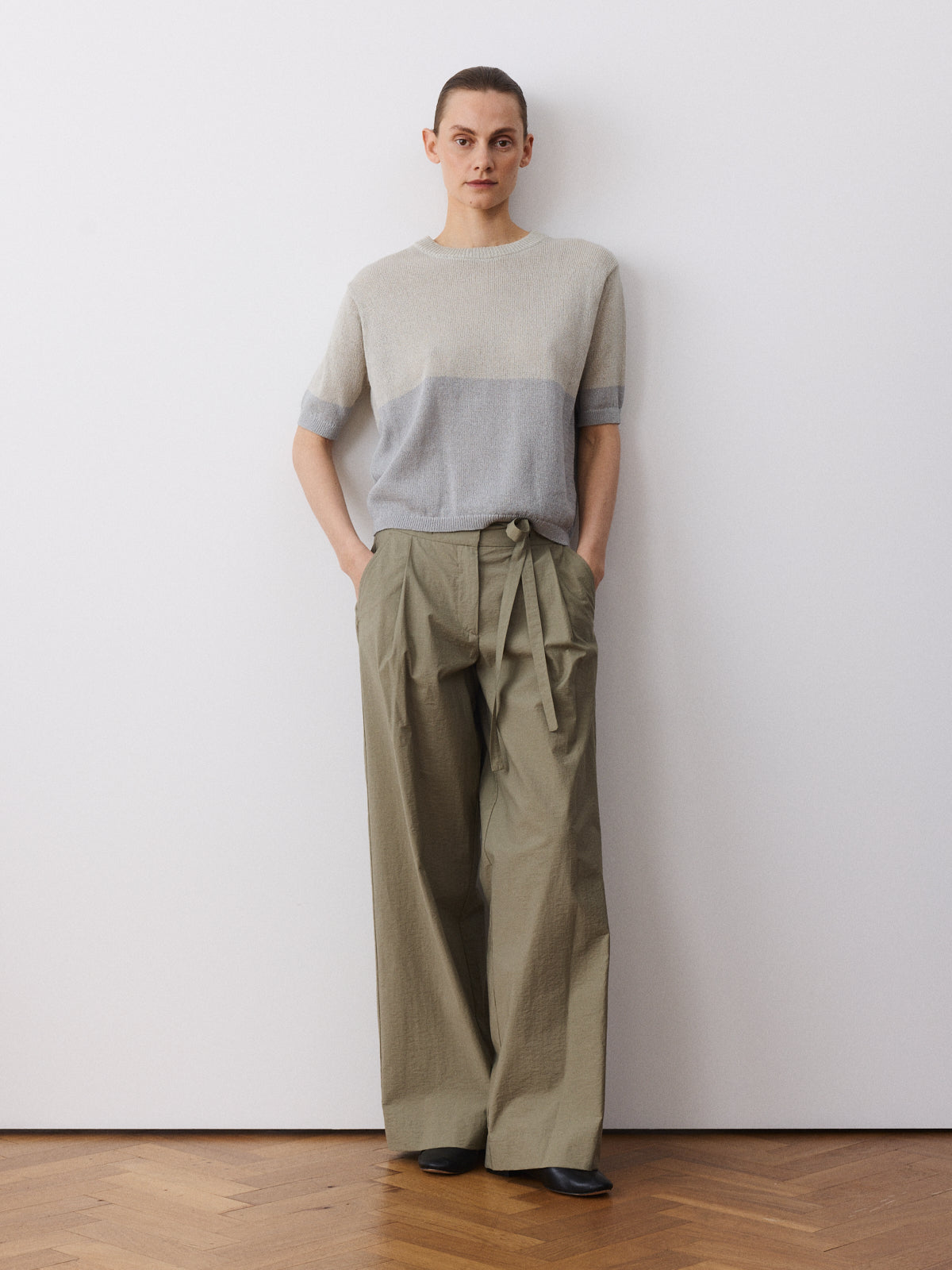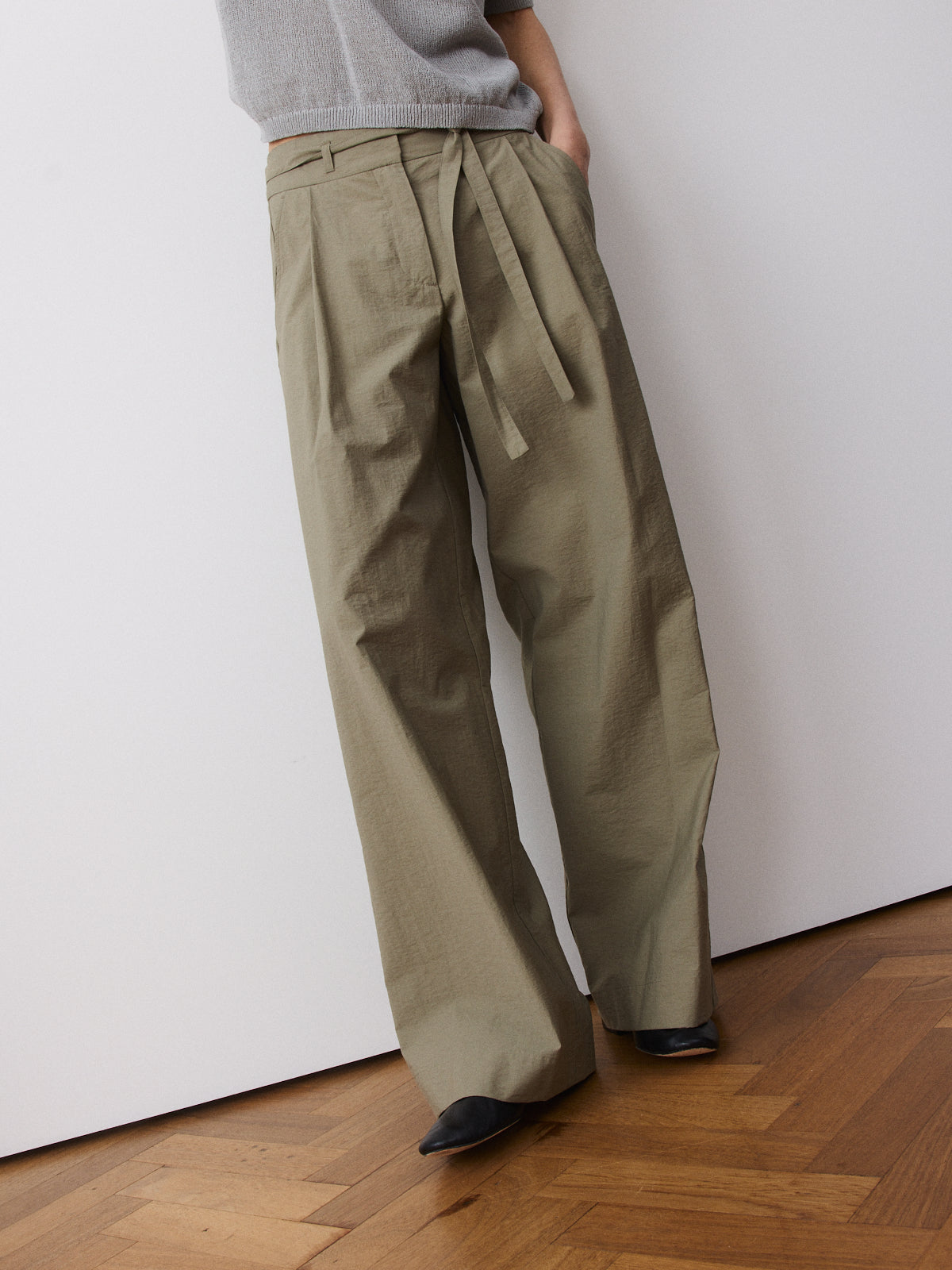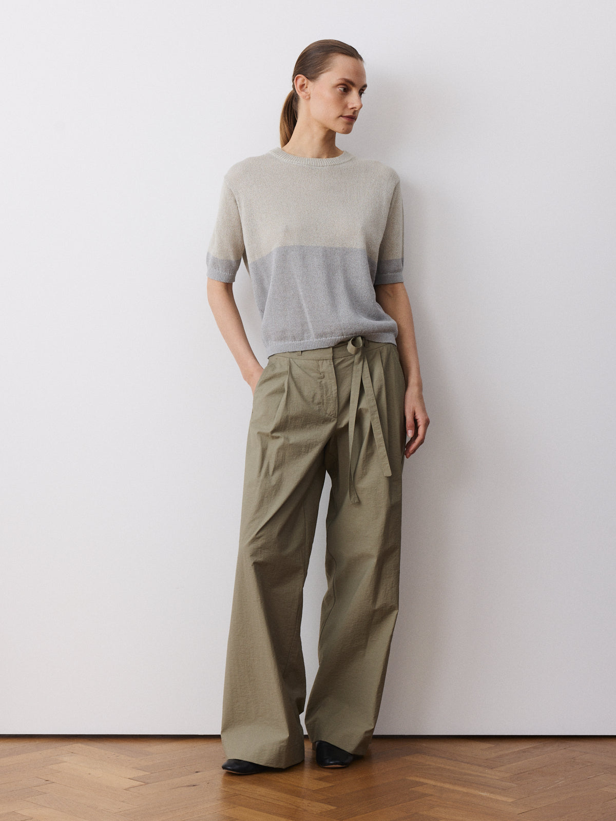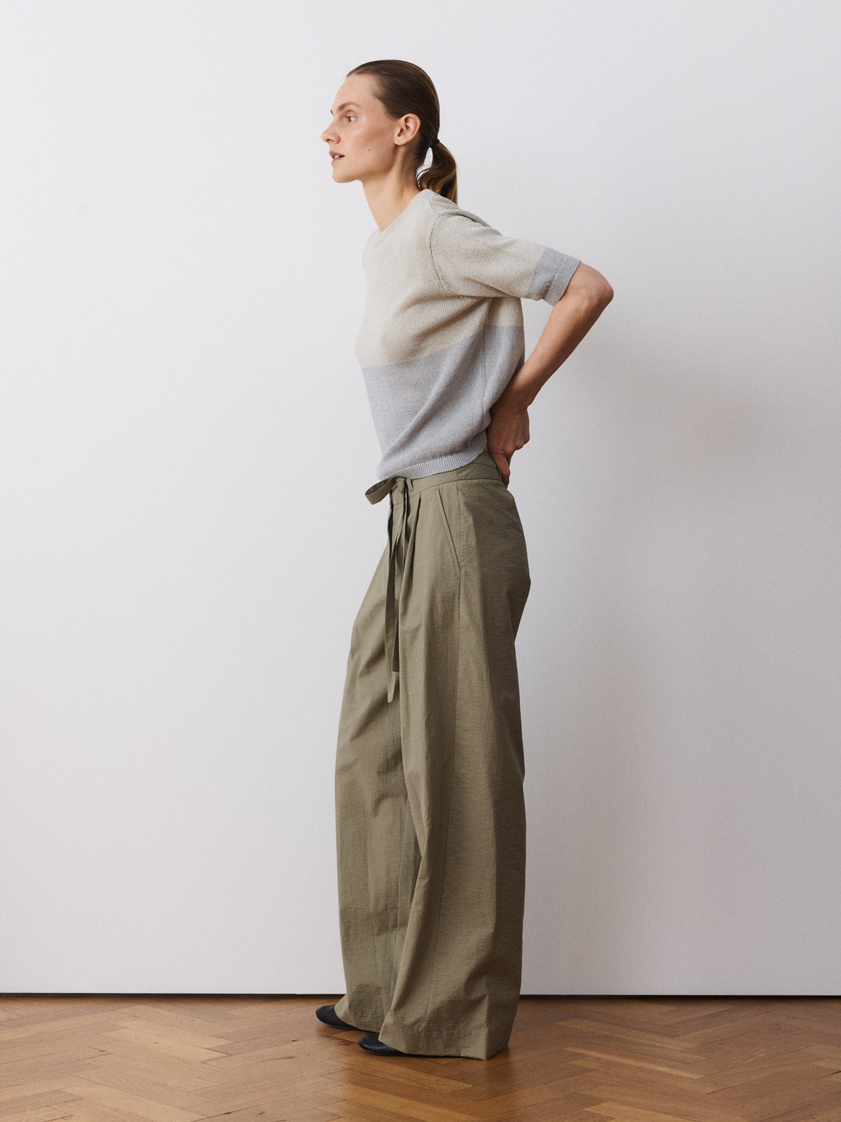 This season’s variation on our bestselling trousers, this wide-leg style returns with a high-rise waist, pleated front and full length. Crafted from a matte cotton and polyamide fabric in light khaki with a dry, structured surface.