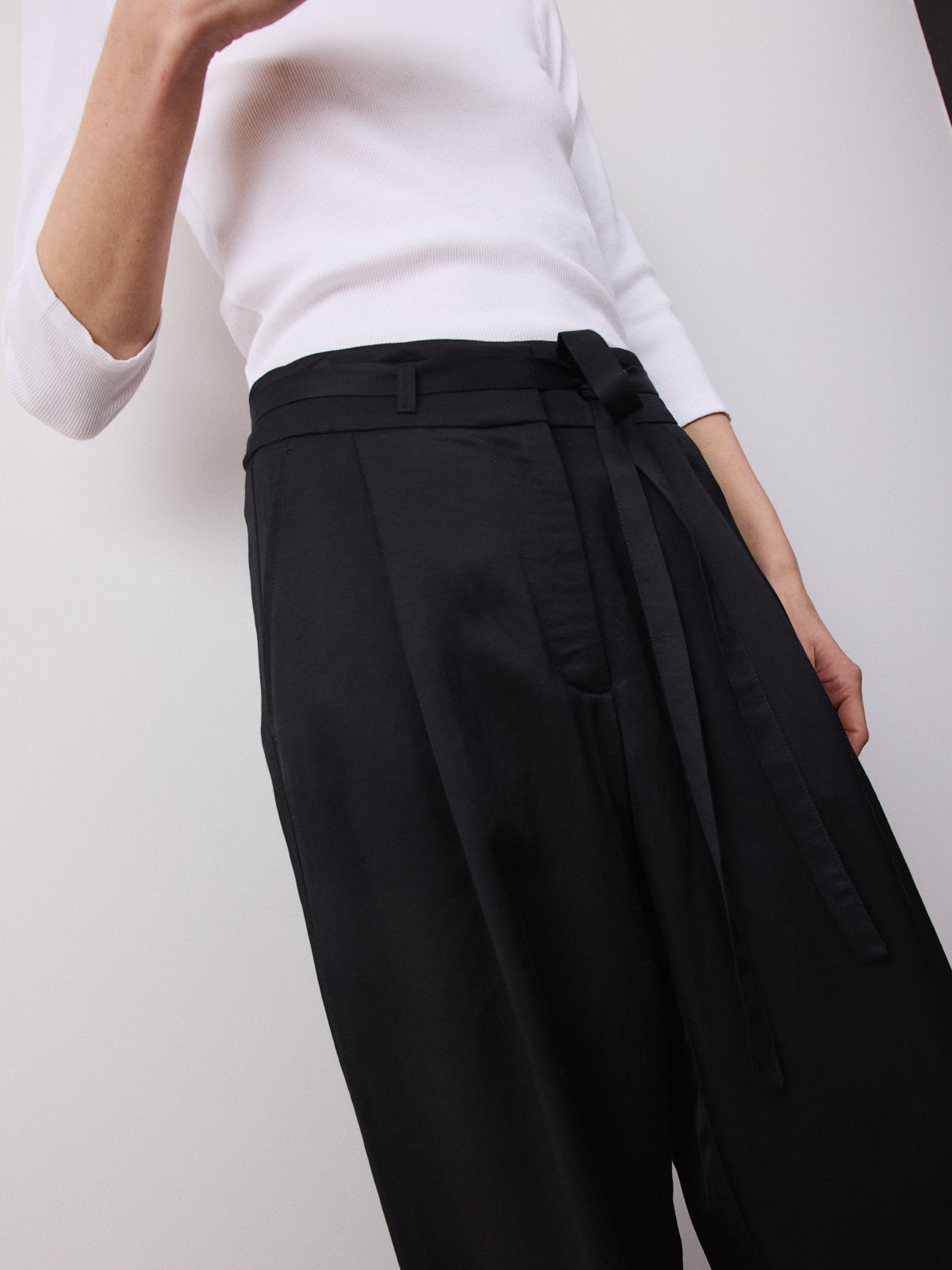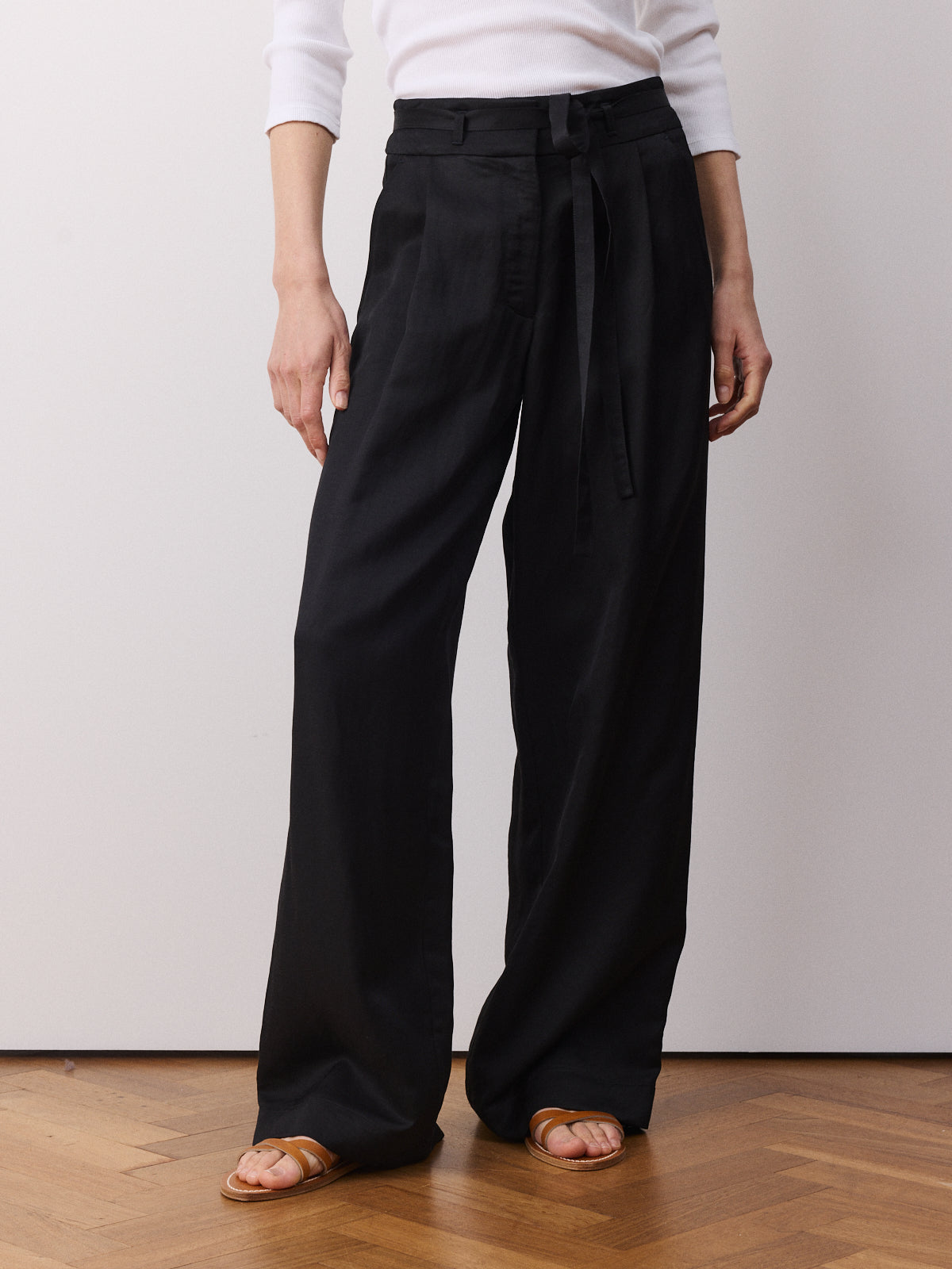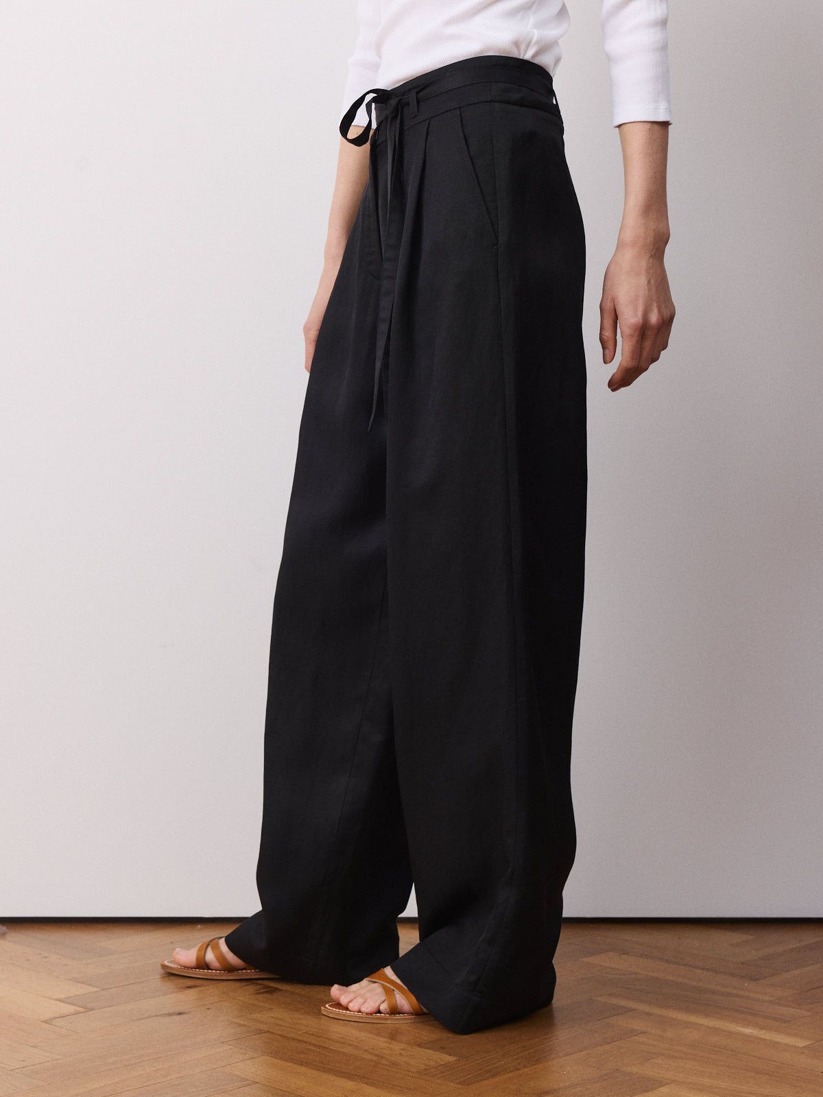 This season’s variation on our bestselling trousers, this wide-leg style returns with a high-rise waist, pleated front and full length. Crafted from a viscose and linen blend in black with a fluid, luminous surface and soft movement.