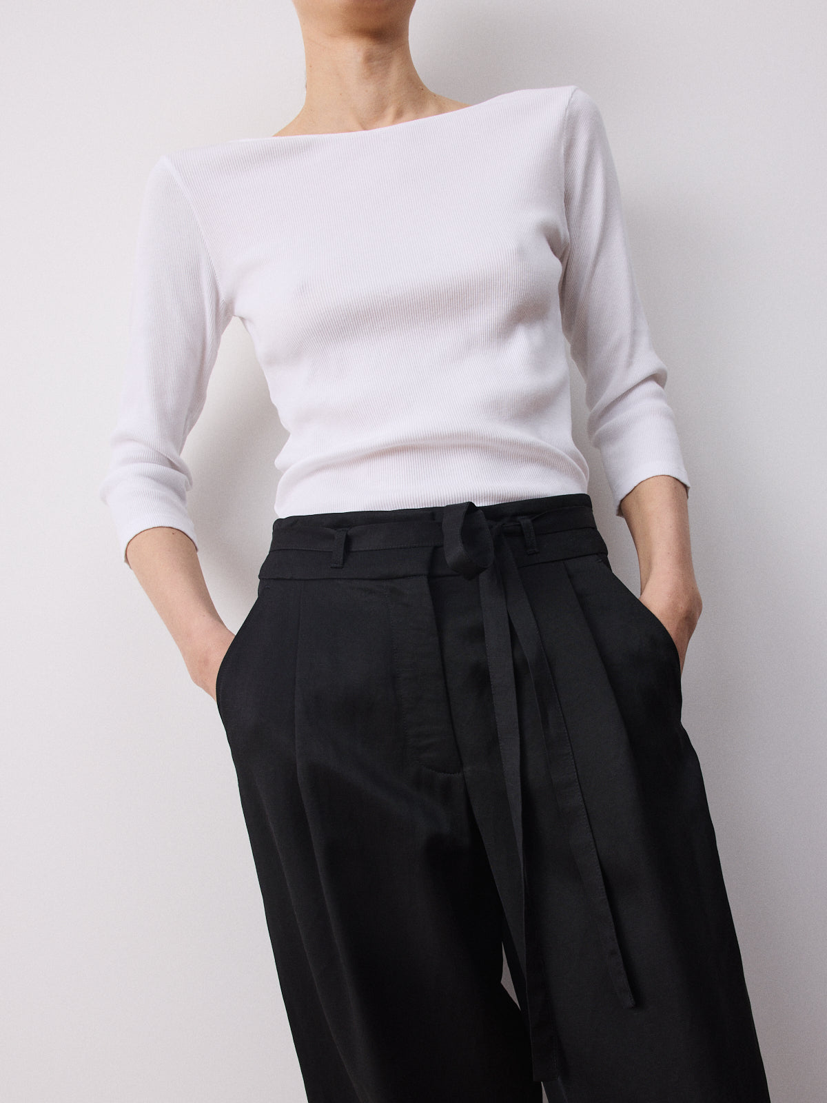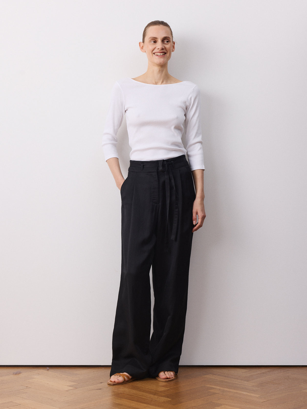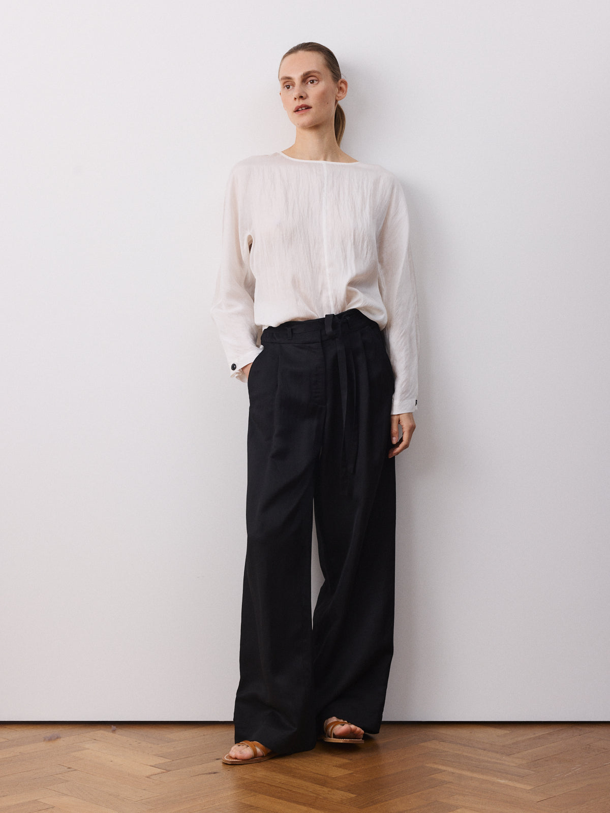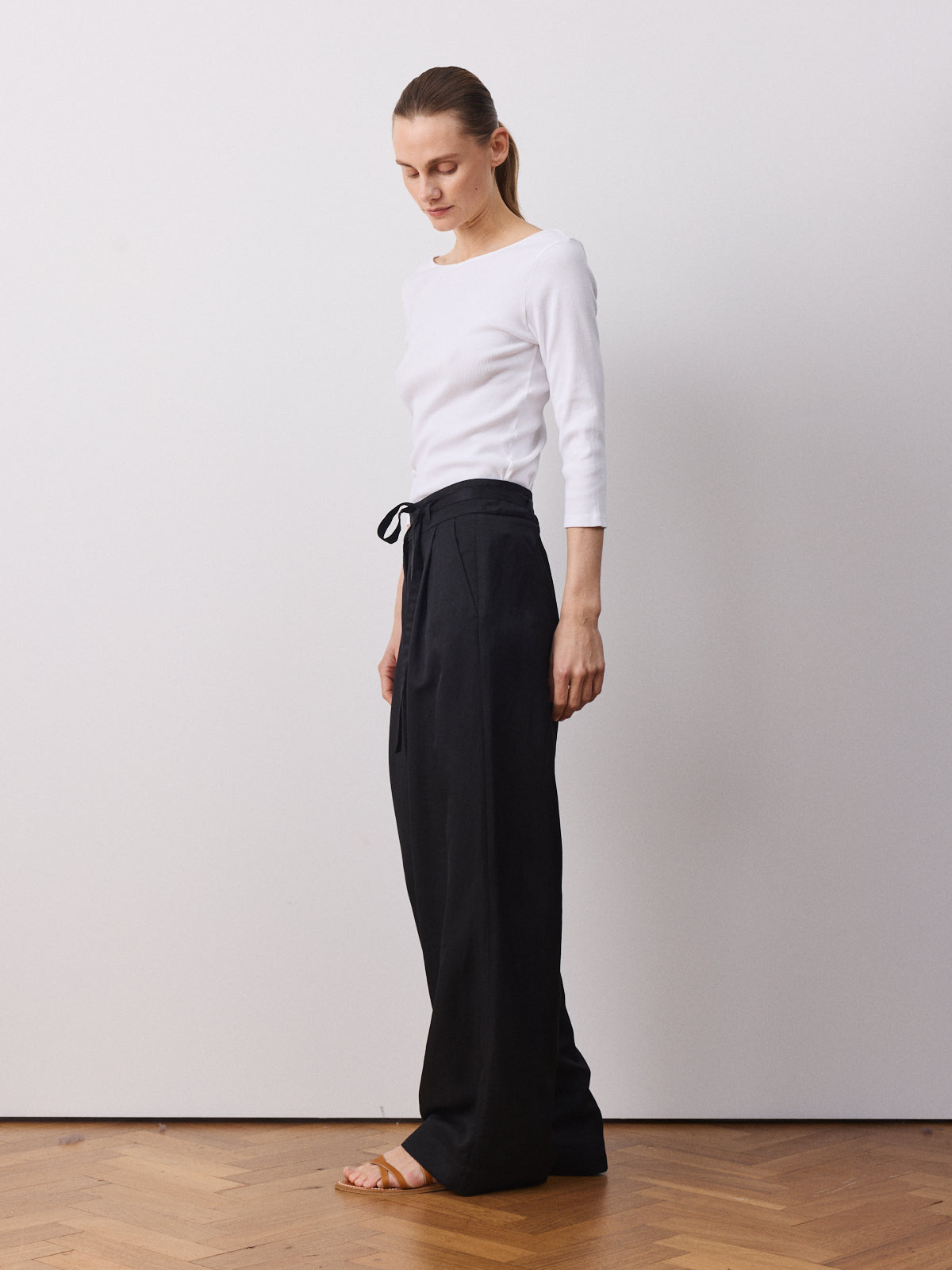 This season’s variation on our bestselling trousers, this wide-leg style returns with a high-rise waist, pleated front and full length. Crafted from a viscose and linen blend in black with a fluid, luminous surface and soft movement.