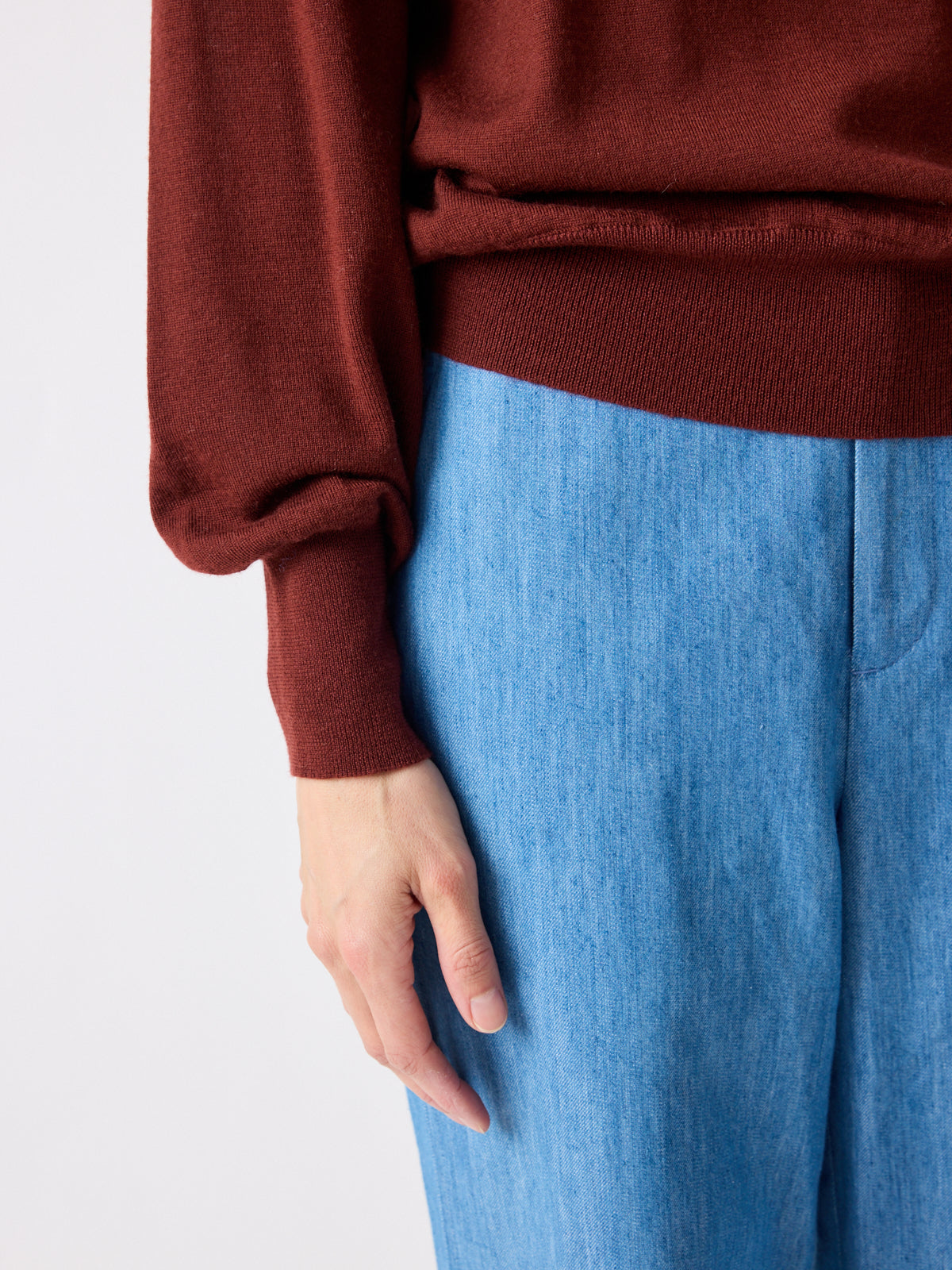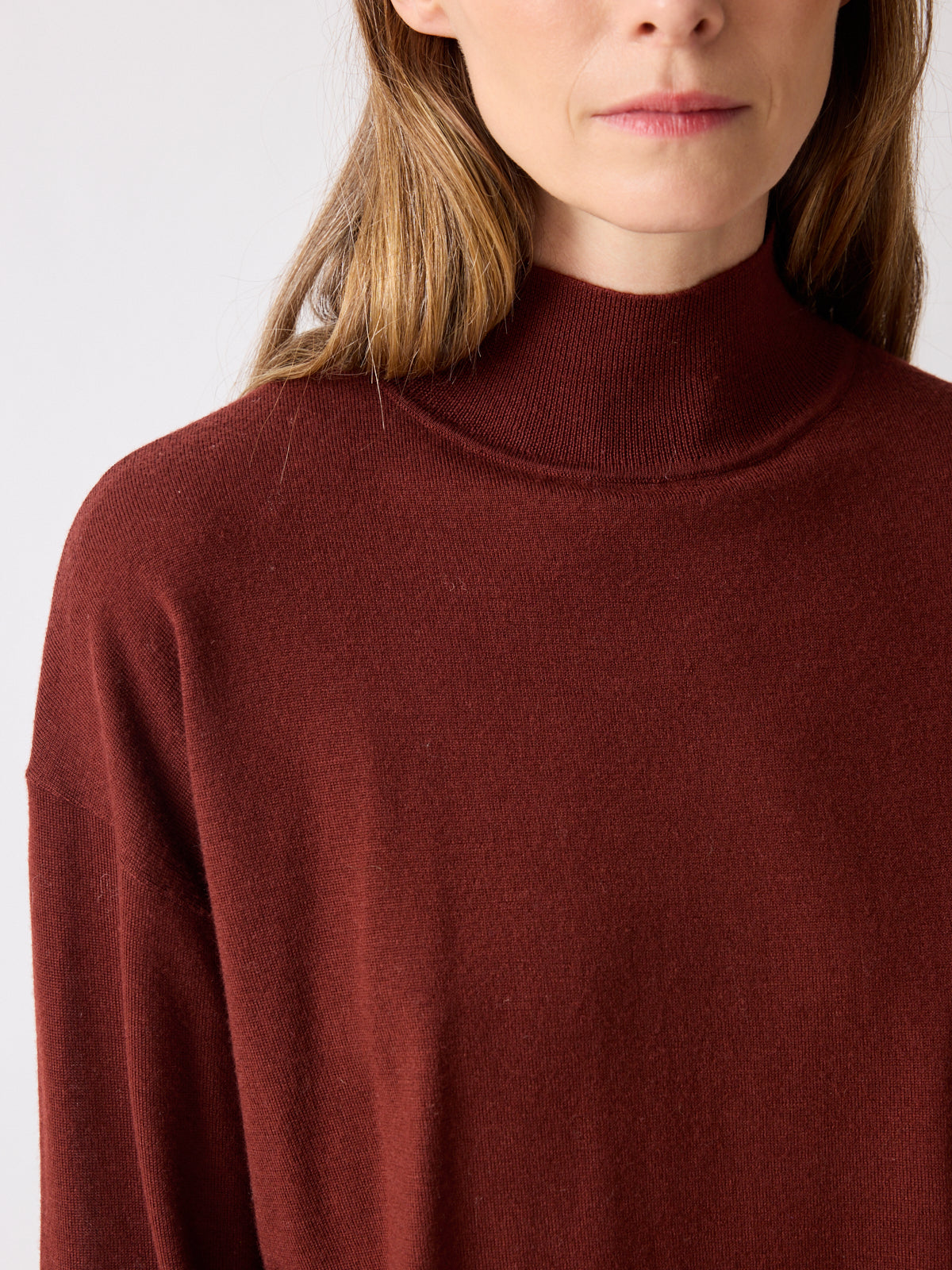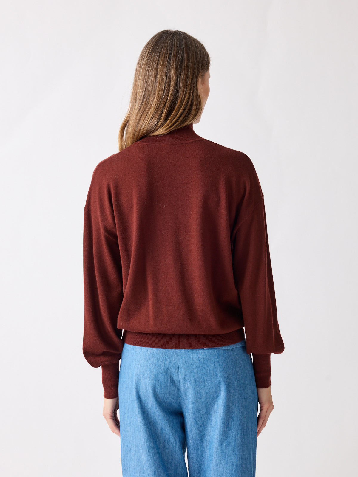 A softly voluminous sweater in brownish bordeaux, a deep shade that catches the light with warmth and depth. The fine merino wool flows gently into a mock neck, subtle balloon sleeves, and fitted waistband for a relaxed look.