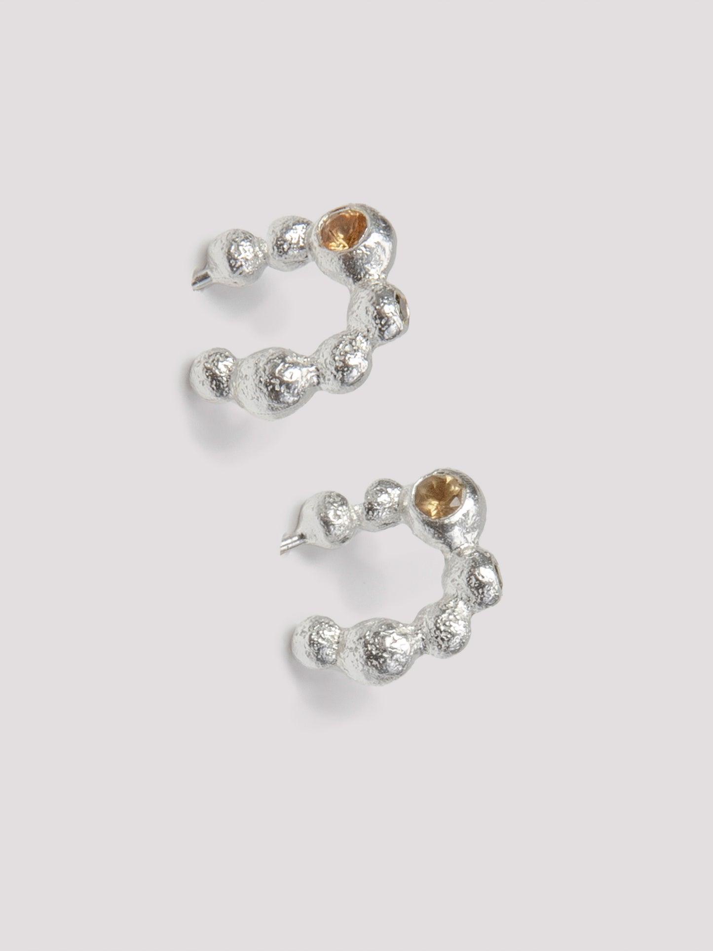 A mix of semi-precious stones (tourmalines, citrines, zircons and lemon quartz) in shades ranging from brown to ochre and olive, set in the jewellery in a closed setting.