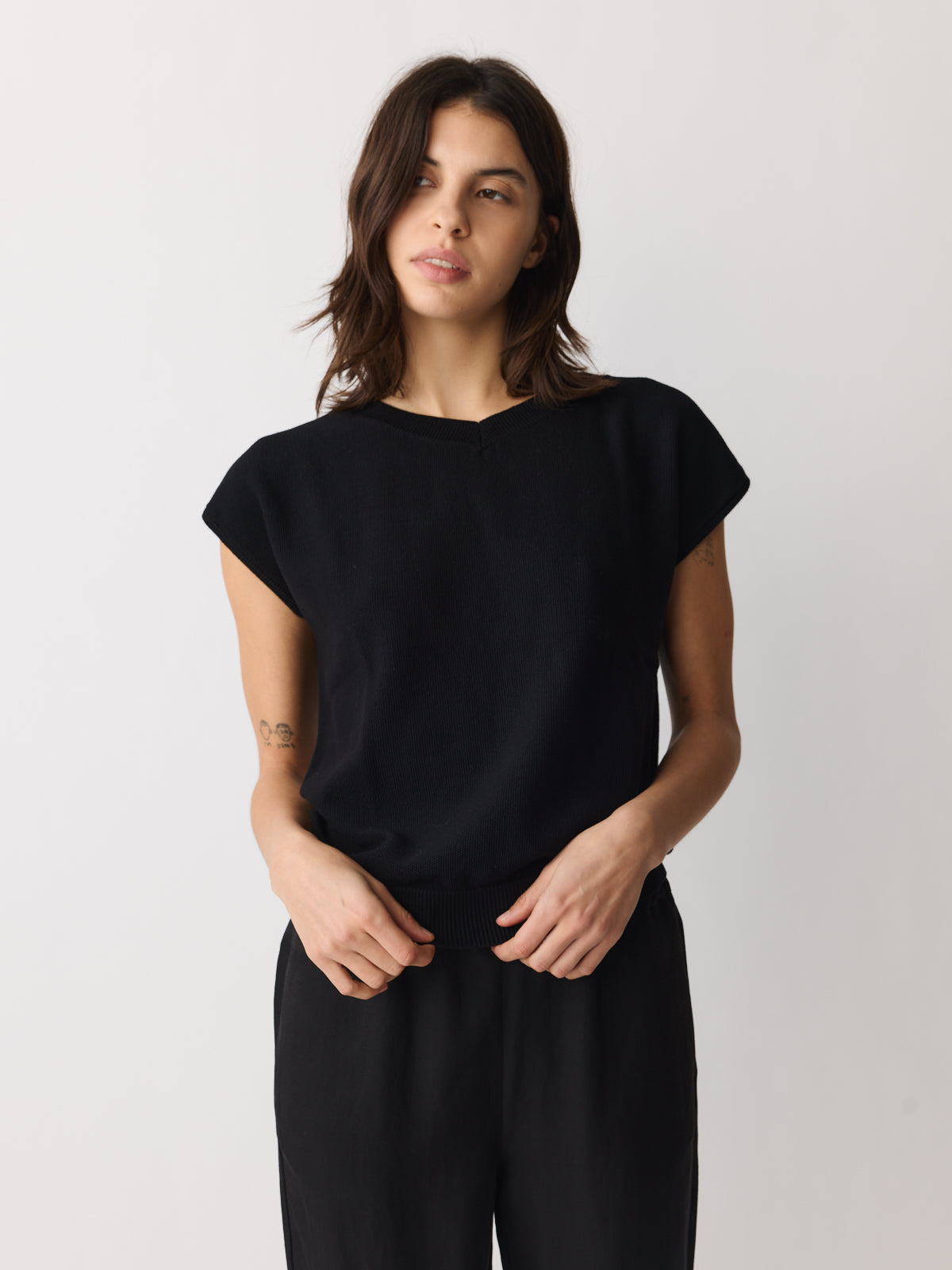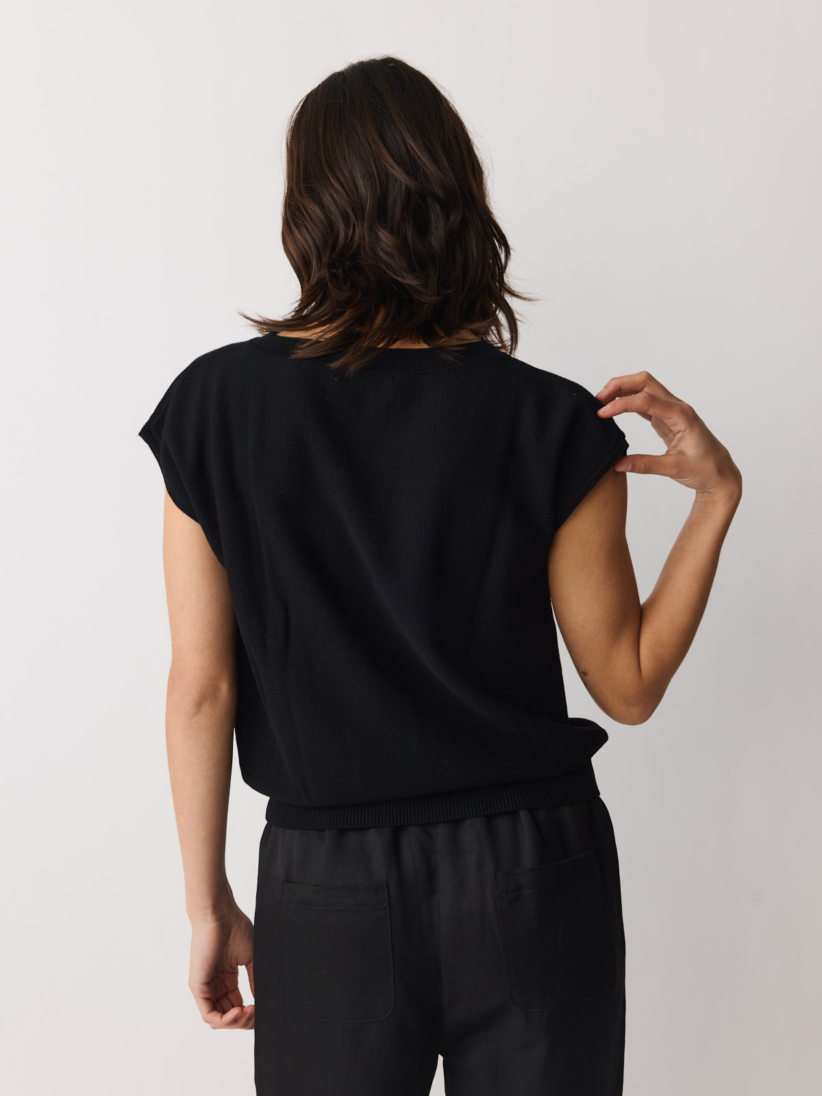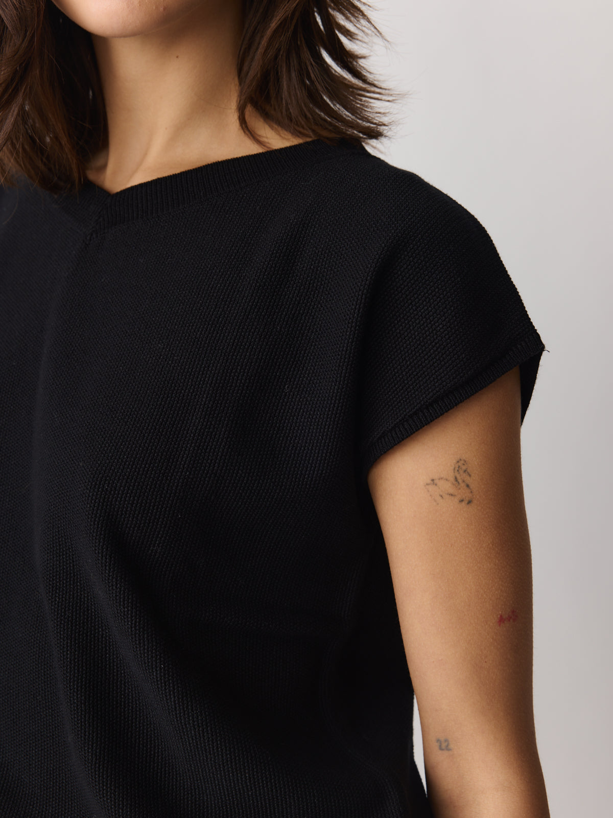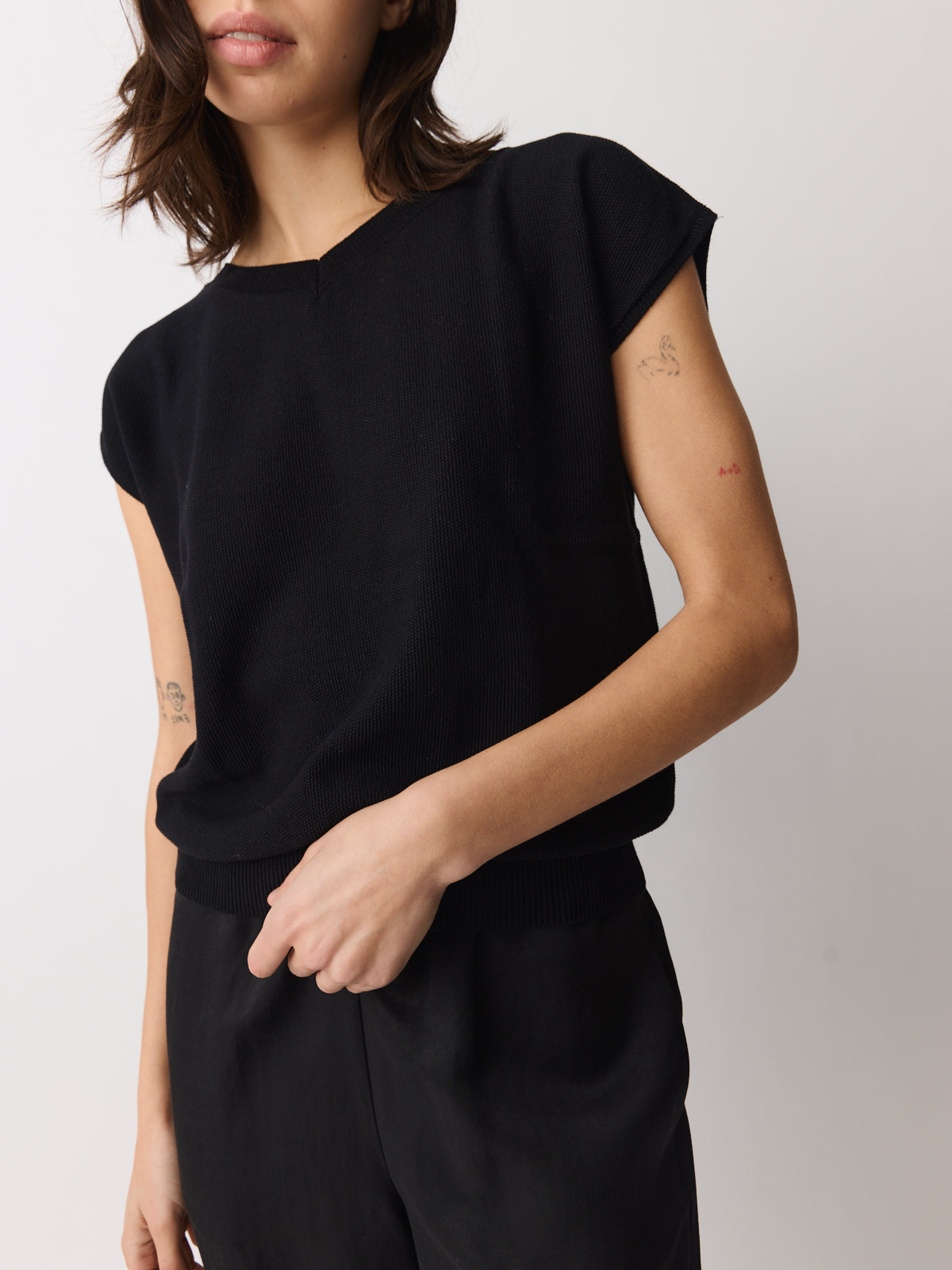 Deze mouwloze top is gebreid (zaadsteektechniek) in een 100% natuurlijke katoen-rayonmix in het zwart. Het is ontworpen met kapmouwen en heeft een losse en rechte pasvorm. De getailleerde tailleband zorgt ervoor dat het kledingstuk bij de heupen kan worden ingekort. Gemaakt in China.