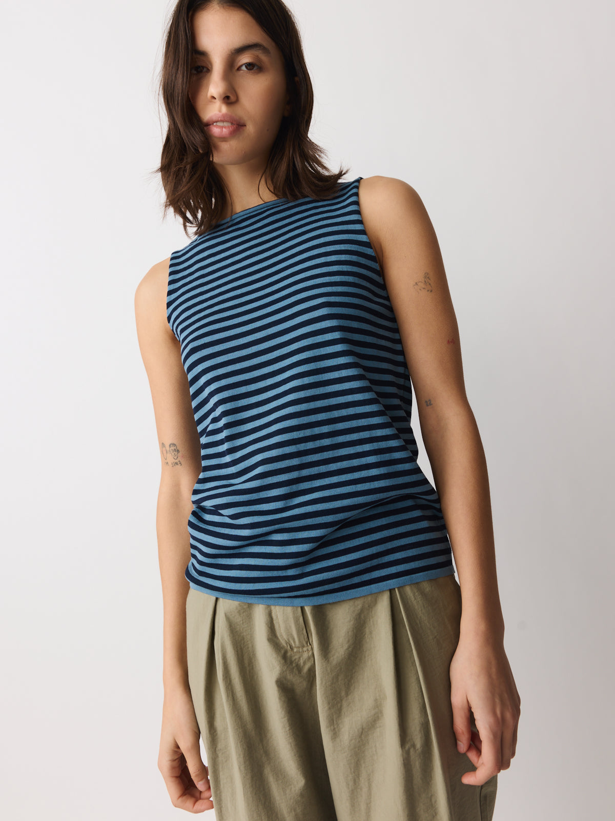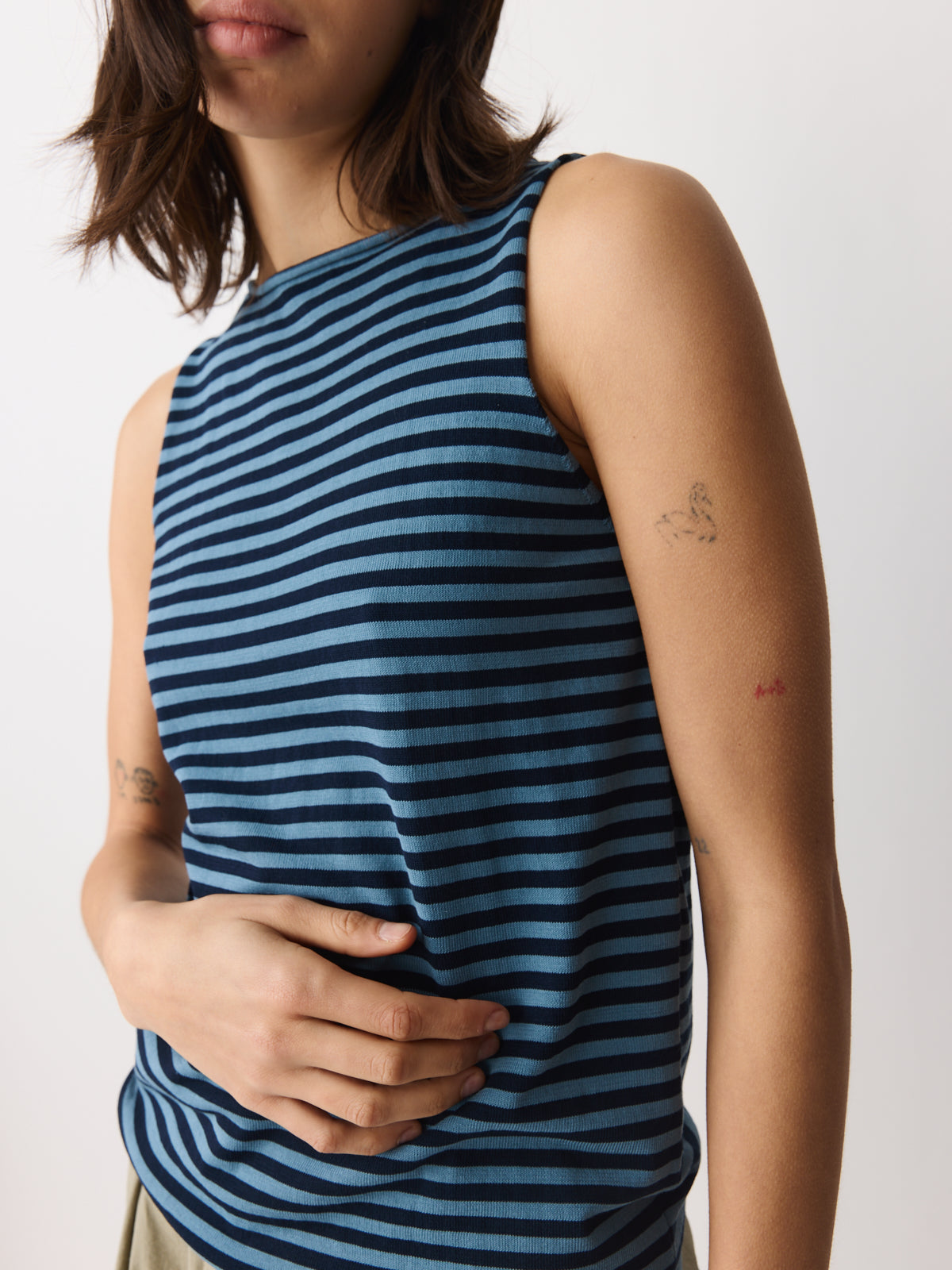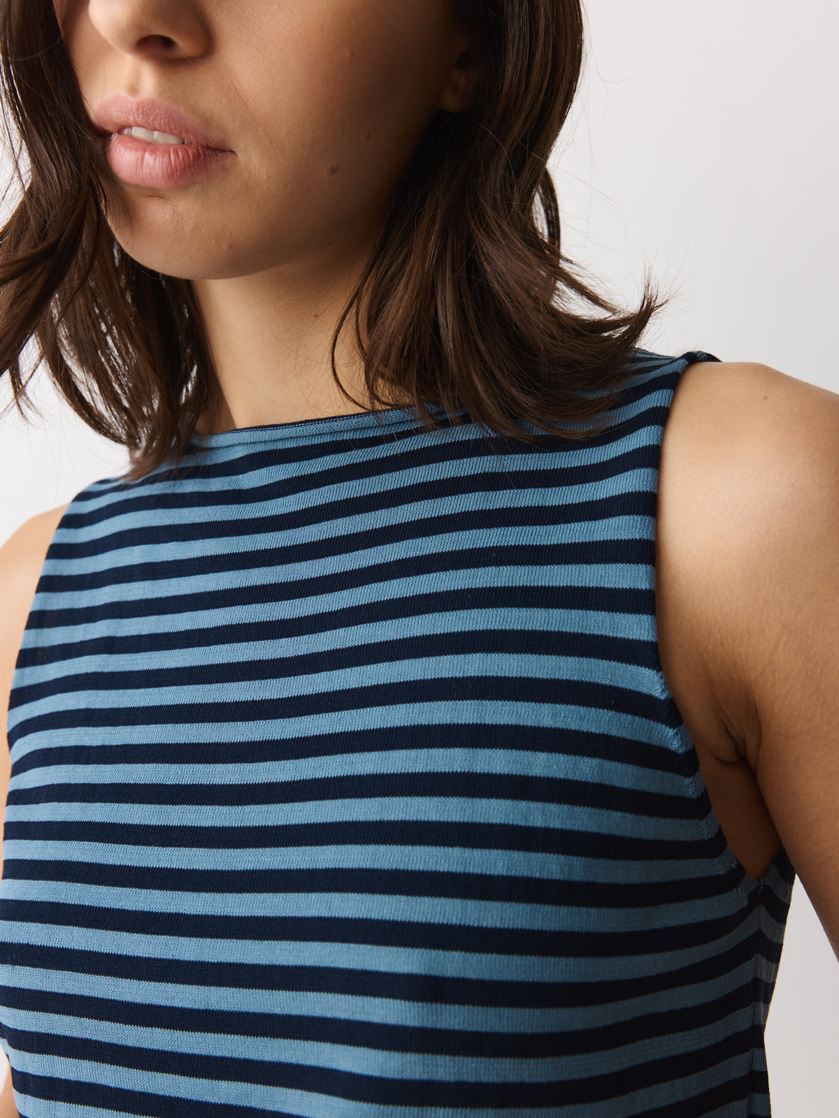 A good summer basic in air force blue and deep navy stripes, this sleeveless top is knitted from a fine cotton yarn with an airy, fluid surface. Designed with a wide round neckline, a neat straight fit and a rolled-edge finish.
