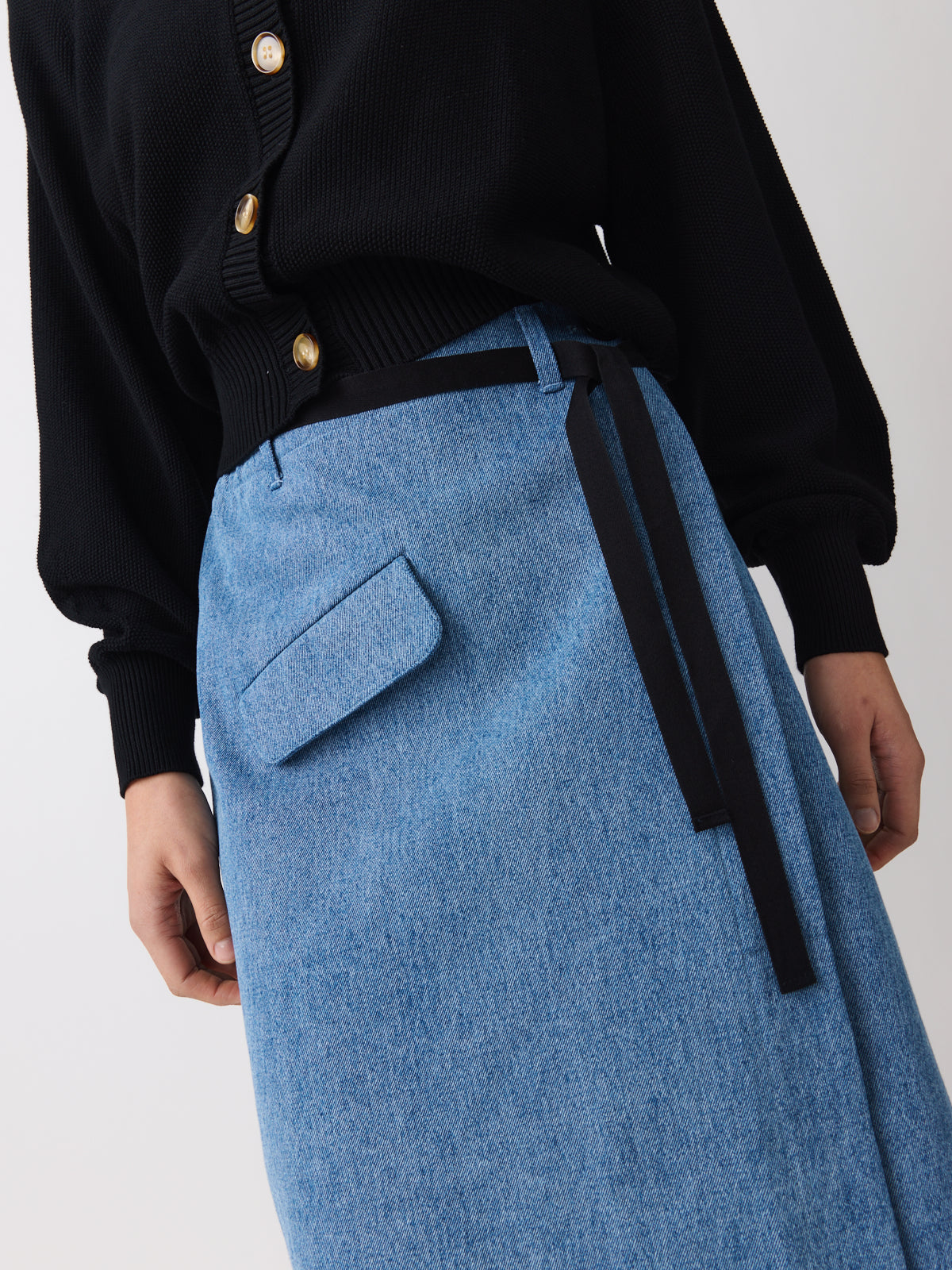 Crafted from heavy mid-blue cotton denim with a pronounced twill and visible white grain, this skirt brings structure to summer dressing. It features a below-the-knee length, an asymmetric opening and a large asymmetric jetted pocket with flap.
