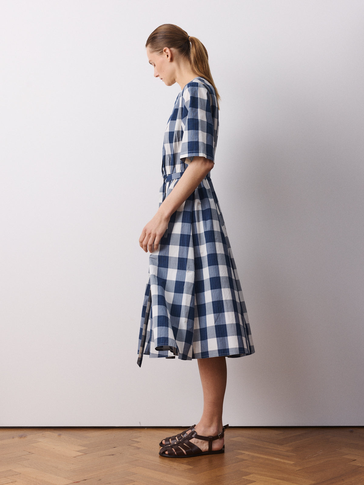 In ecru with a refined blue check, this feminine midi dress is crafted from a cotton and polyester blend with a subtle Japanese-inspired touch. It features a round neckline, diagonal front opening and a matching belt to shape the waist.