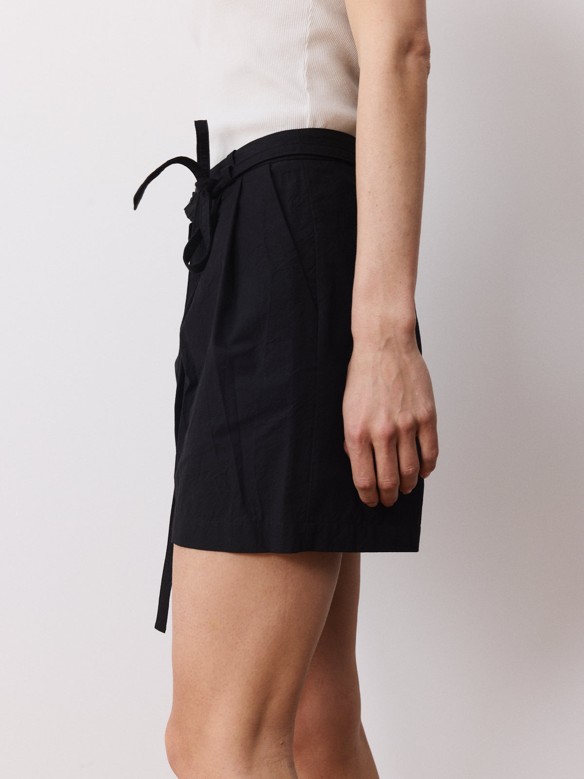 This pair of black shorts is made for long summer days. Cut from a matte cotton fabric with a clean surface and a relaxed feel. Designed with a high-rise waist, double pleats and a detachable self-fabric belt.