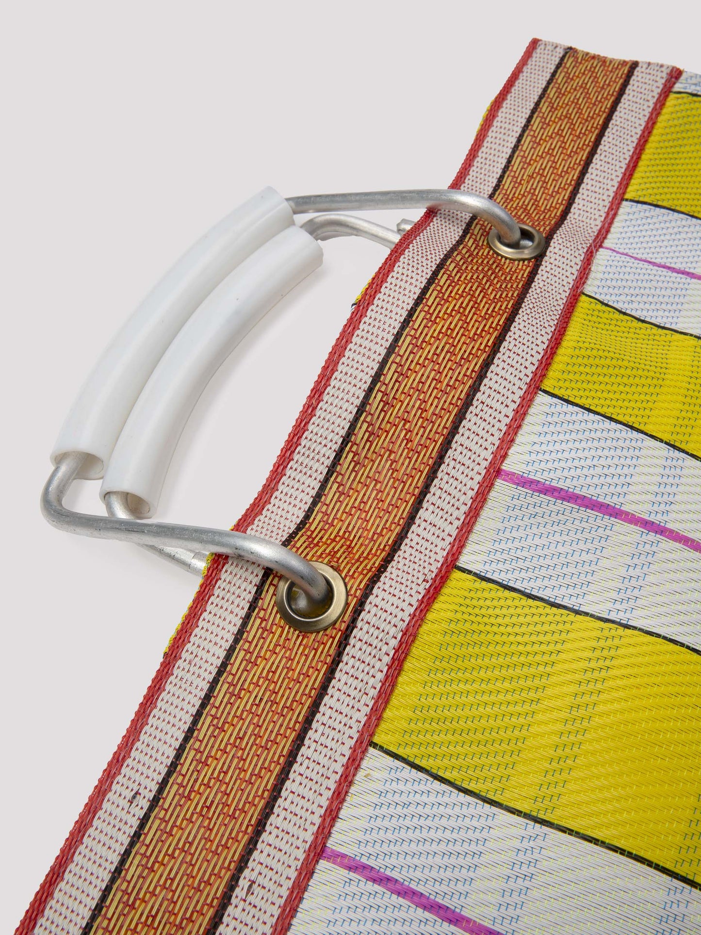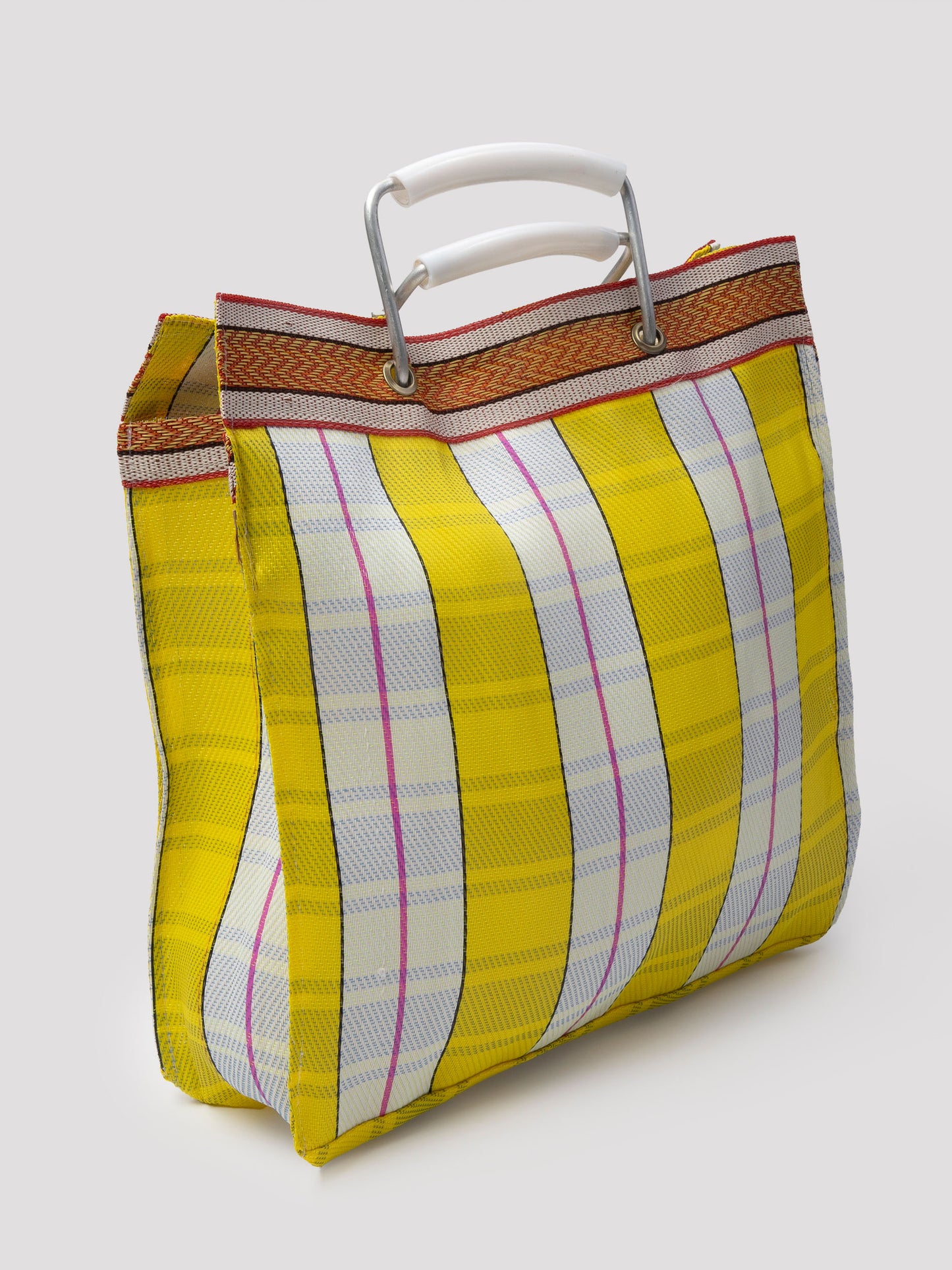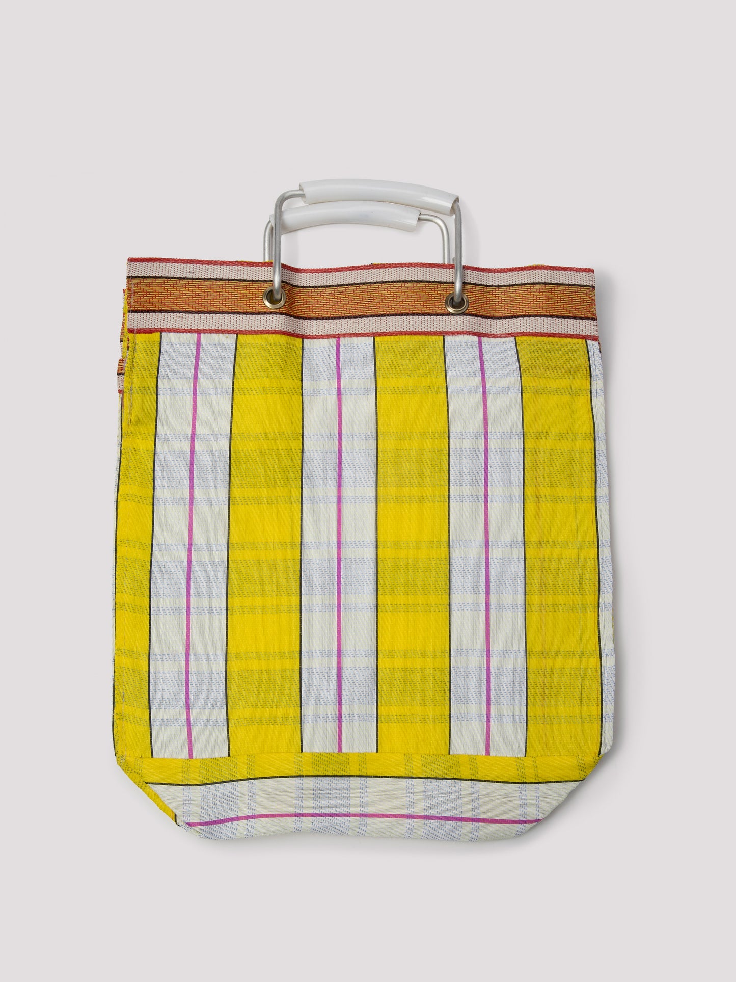 Curved plastic handles in a white finish are mounted on a metal frame and secured with metal eyelets. The woven surface features a striped pattern in bright yellow and soft white, punctuated with fine pink lines and a warm-toned band along the top.