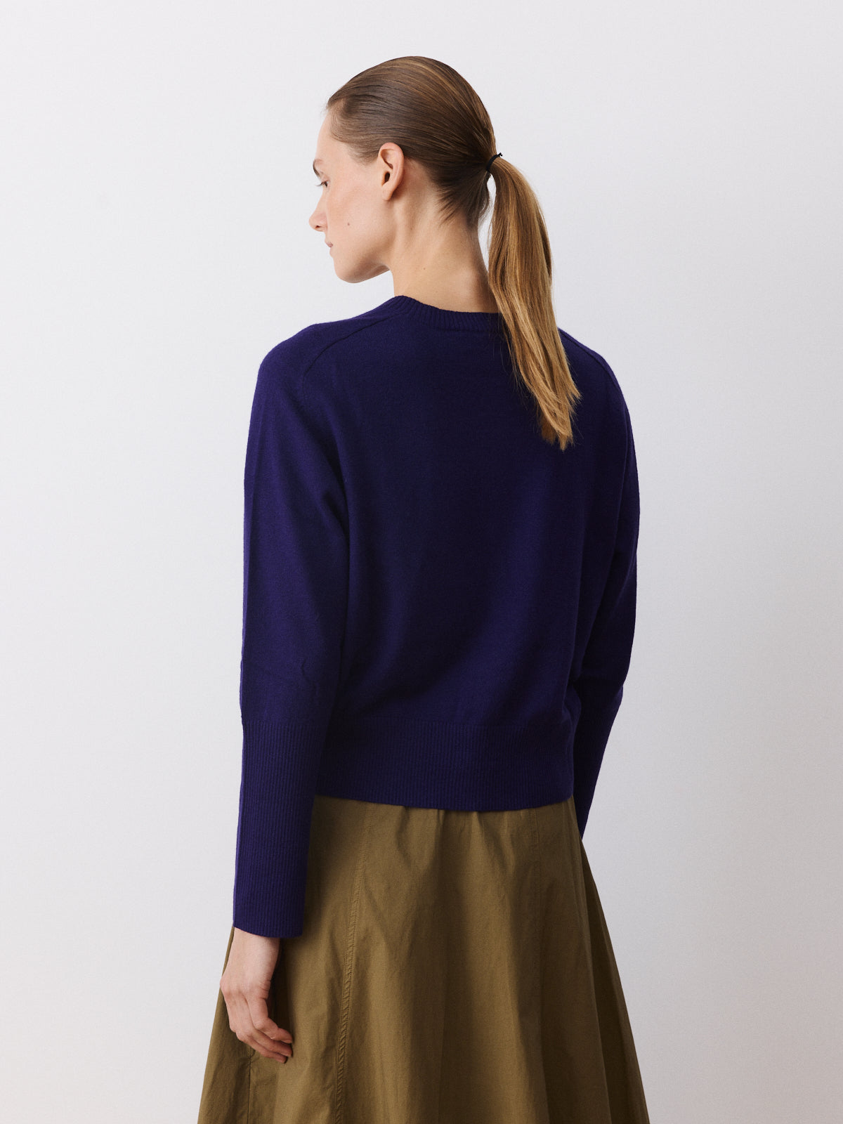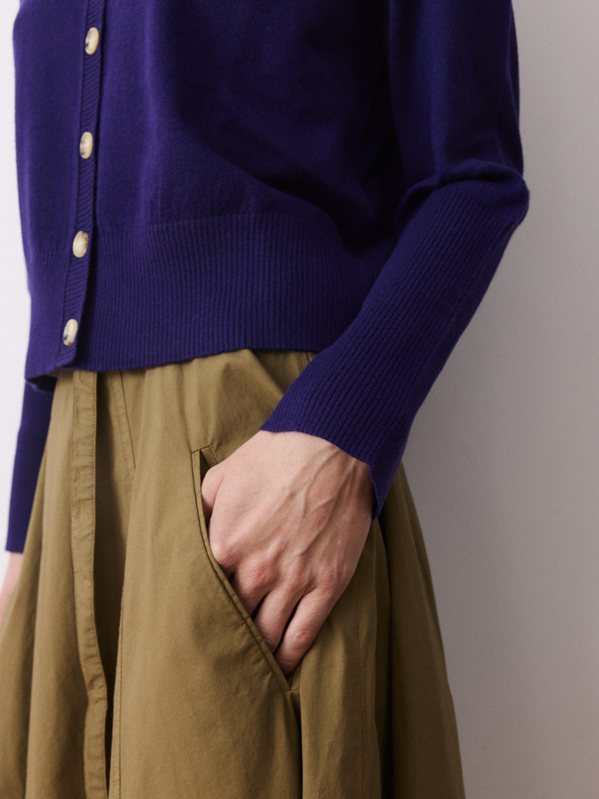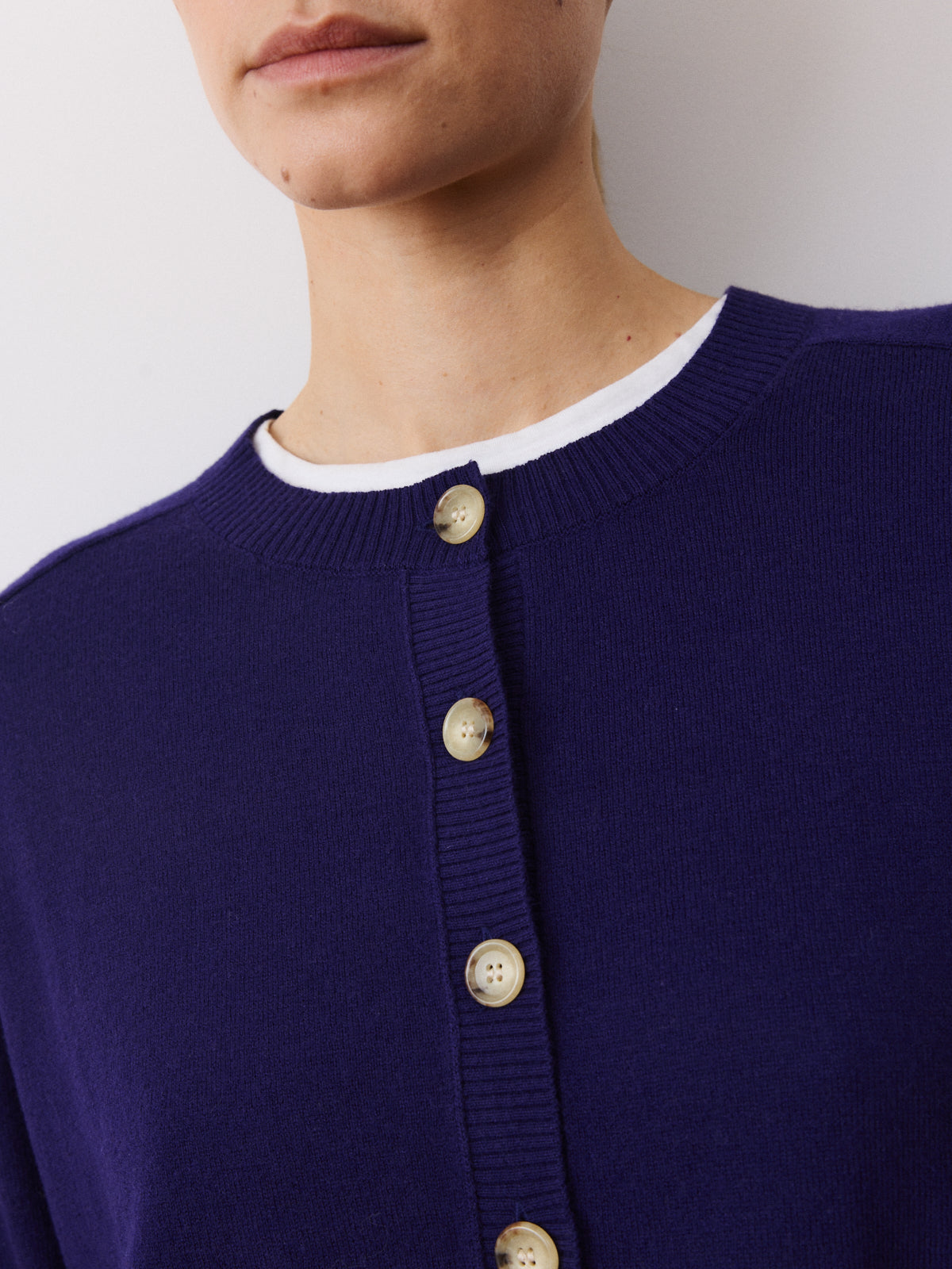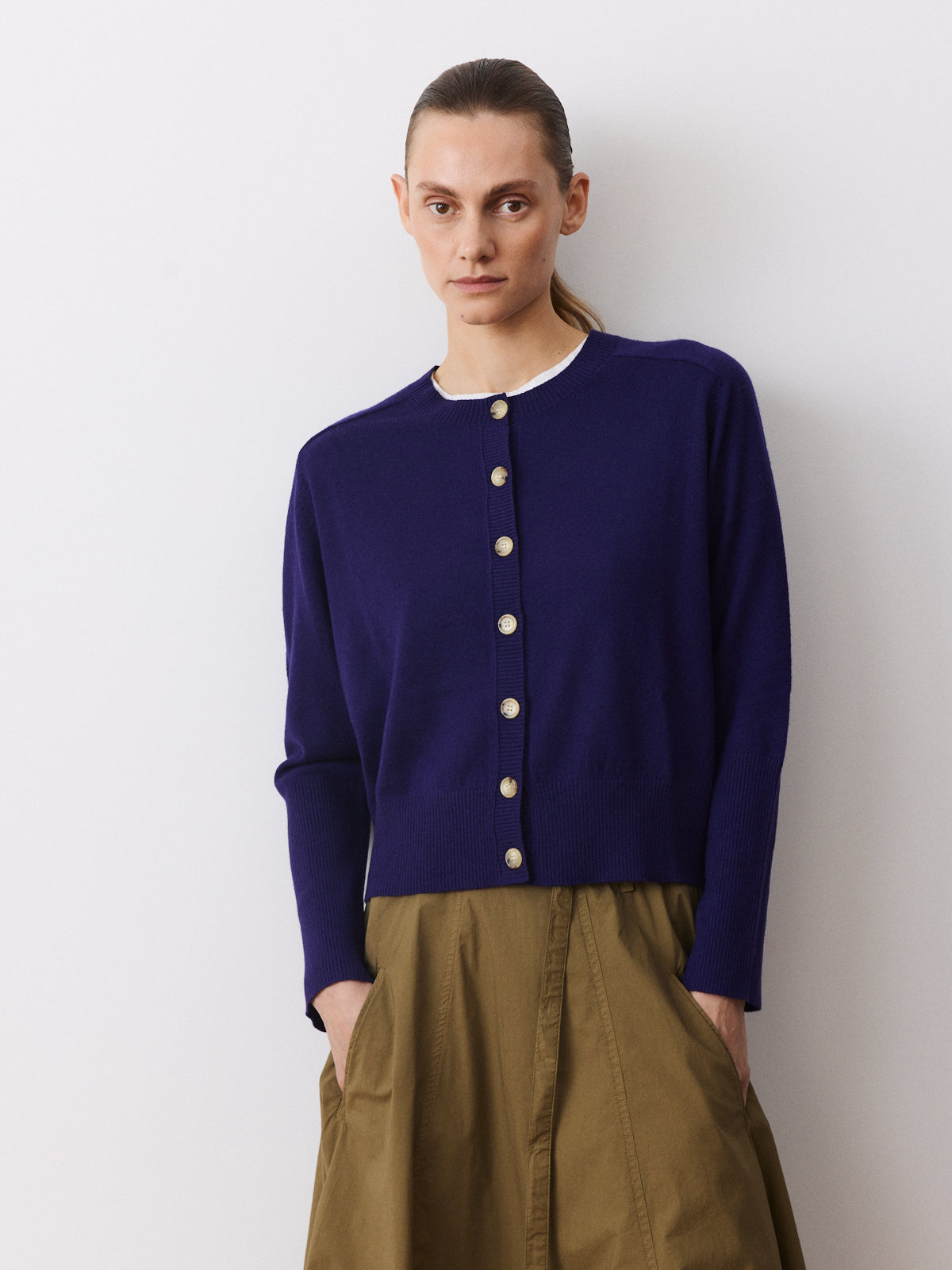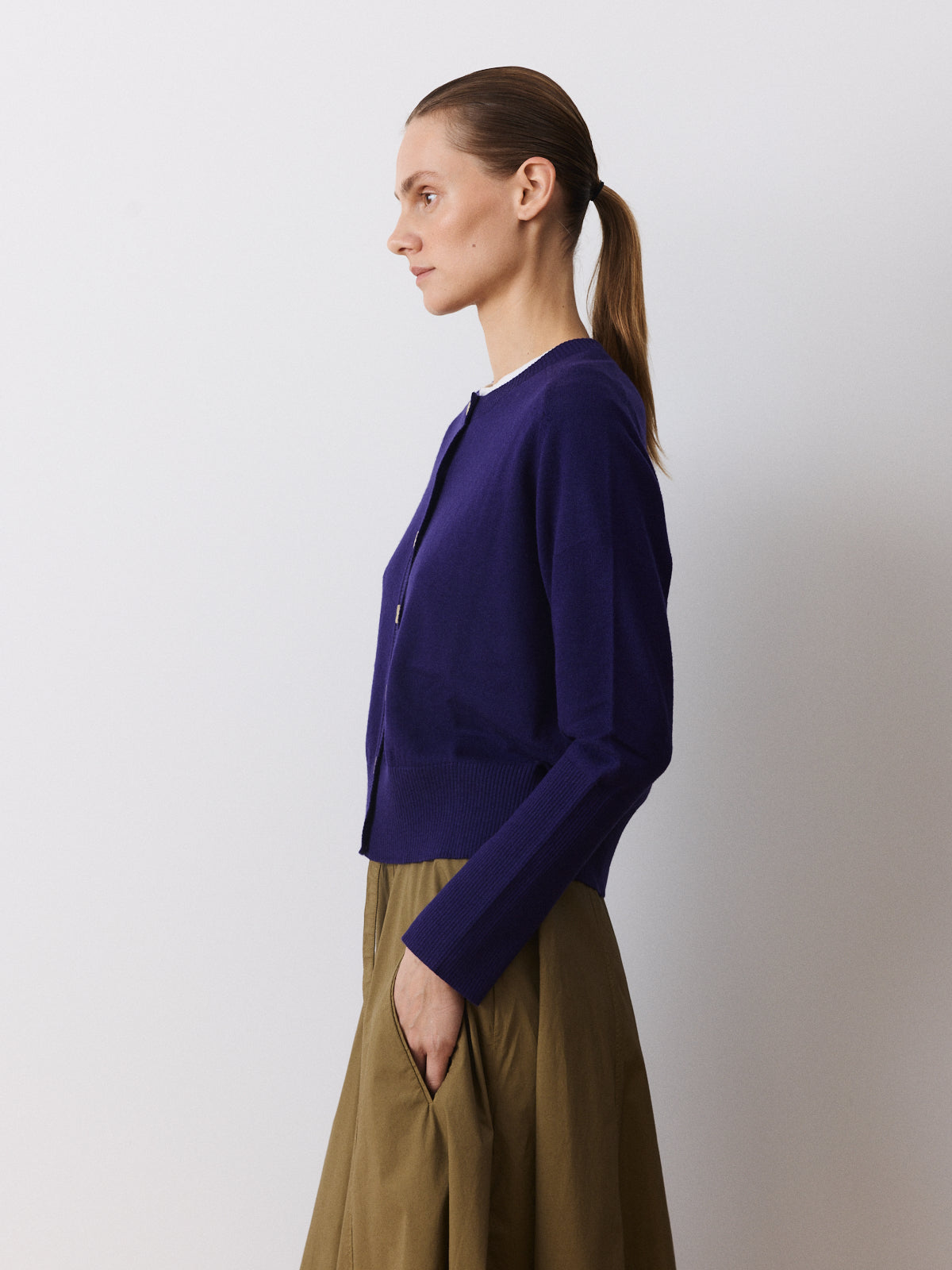 A fully-fashioned cardigan defined by its purple hue and saddle shoulders. Knitted from a merino wool and cotton blend with a fluid surface and soft, cosy feel. It features long sleeves, extended cuffs, a button closure and ribbed detailing at the cuffs, neckline, placket and waistband.