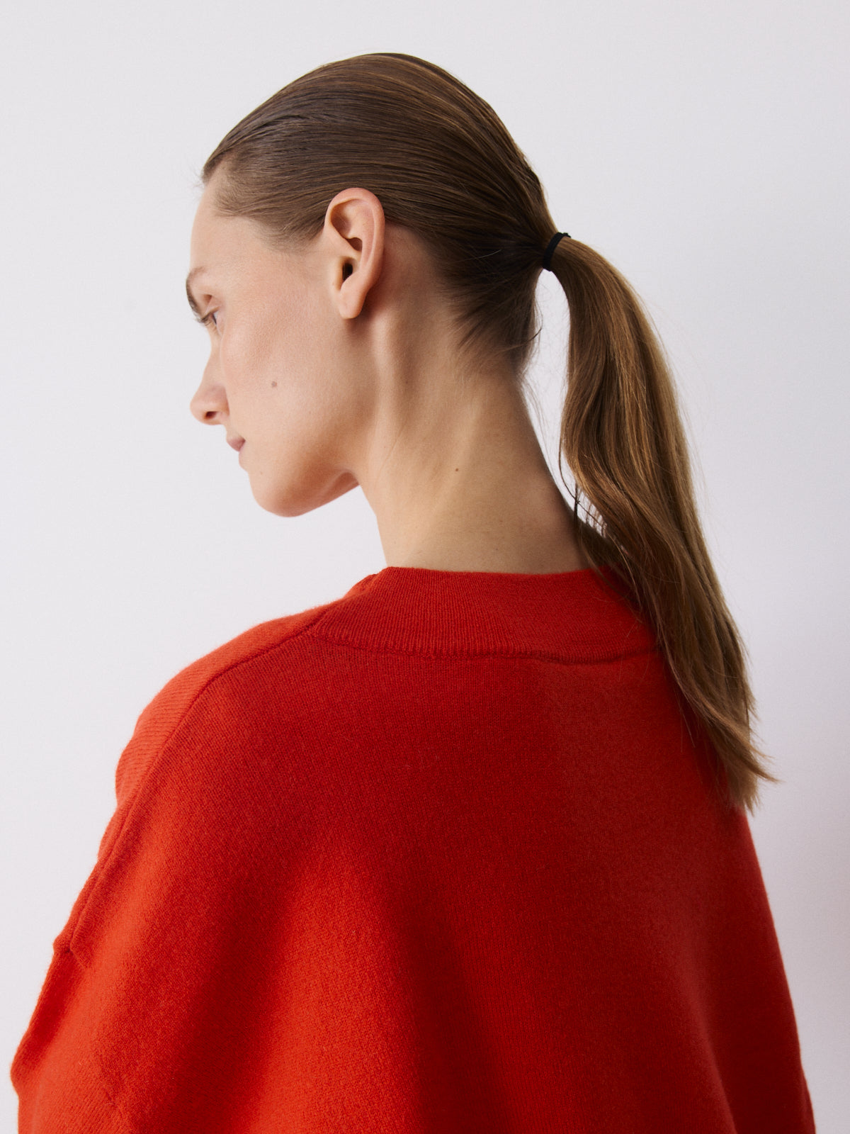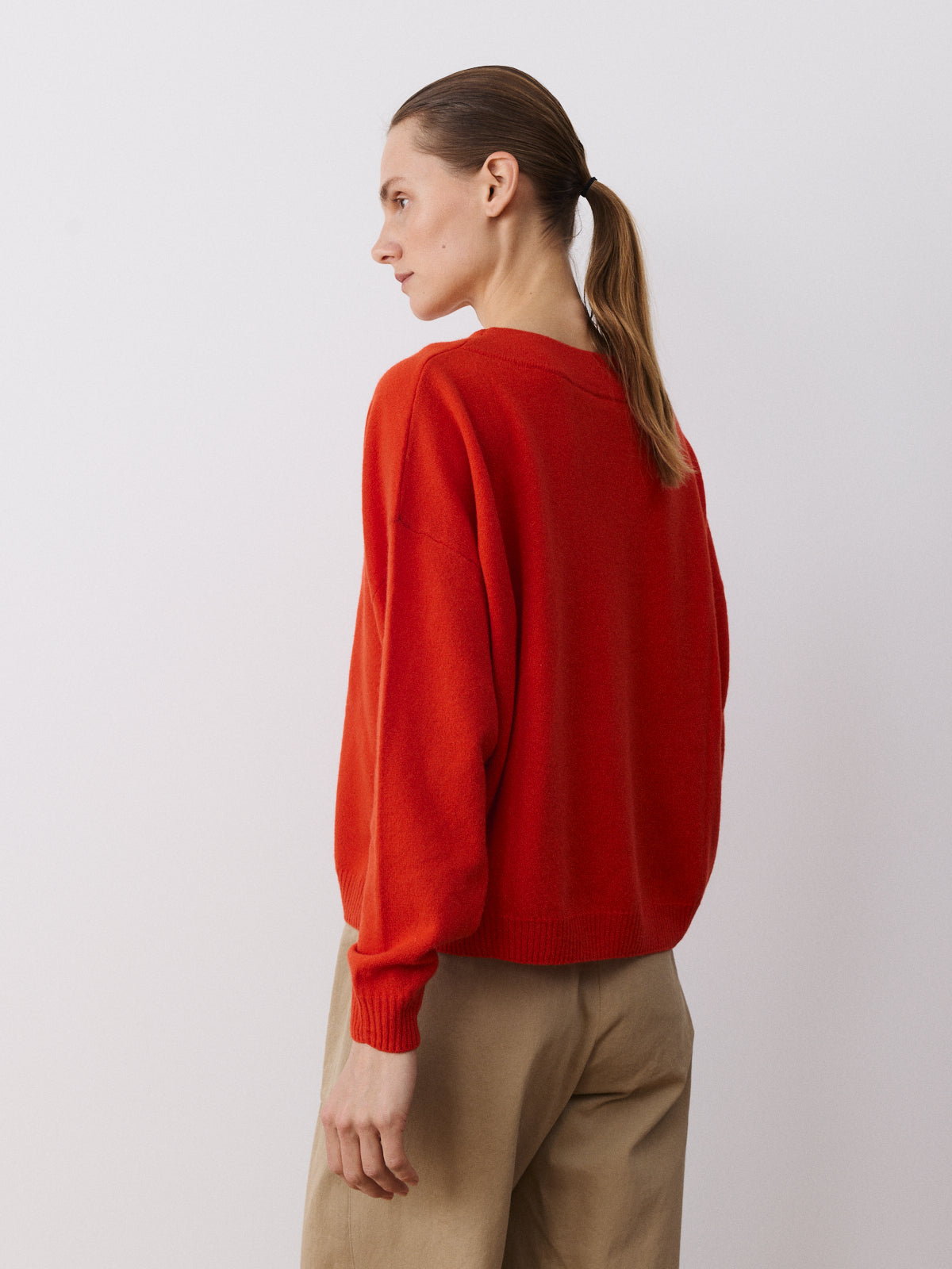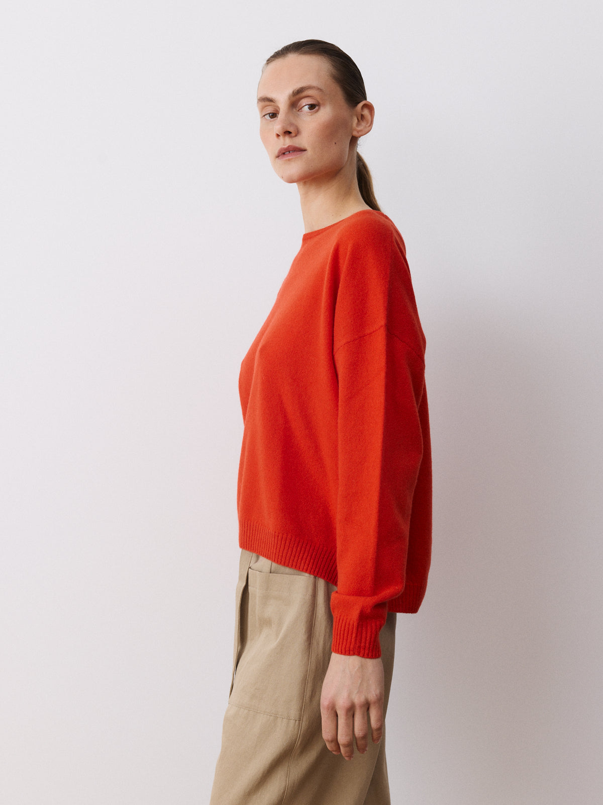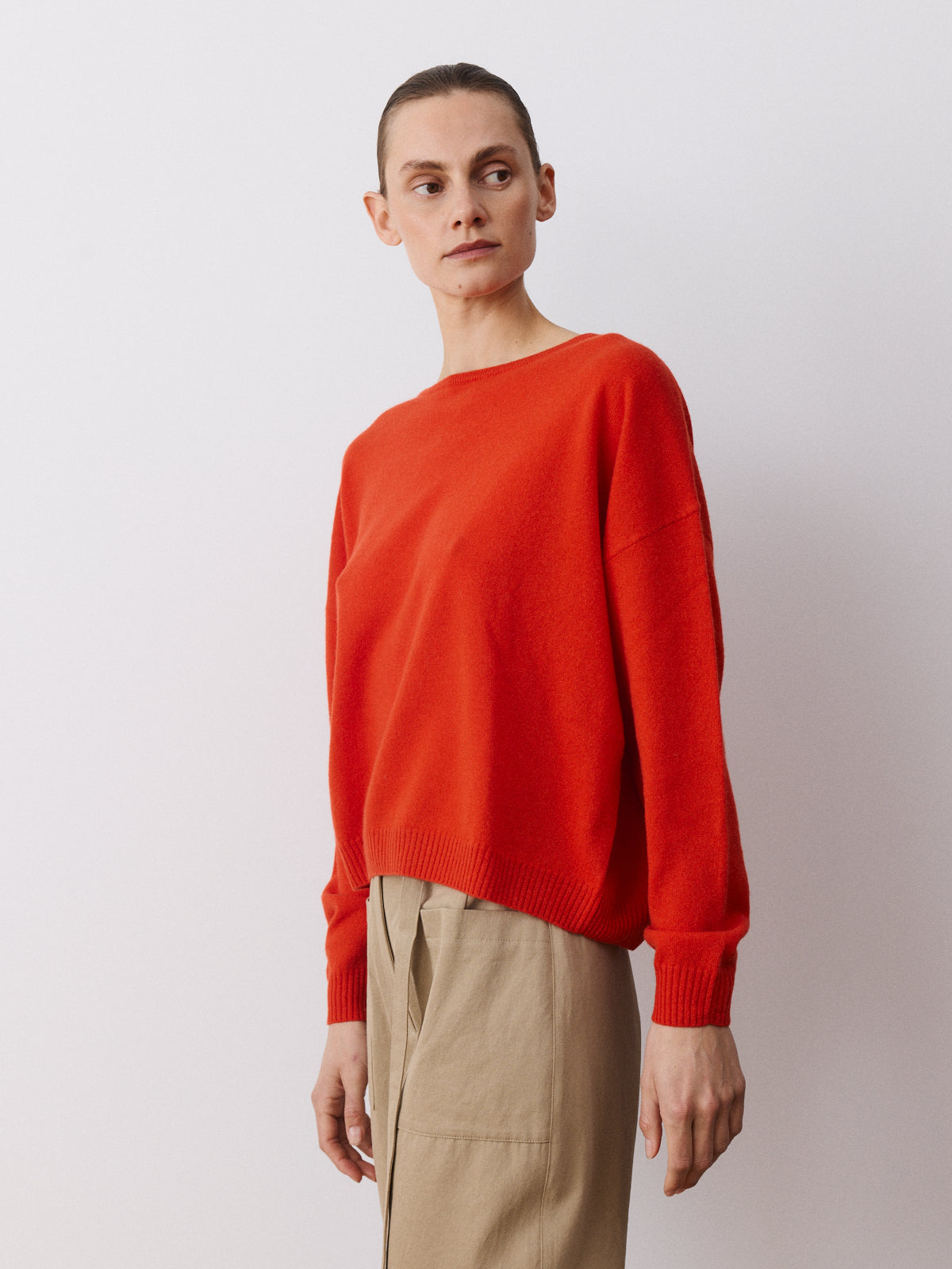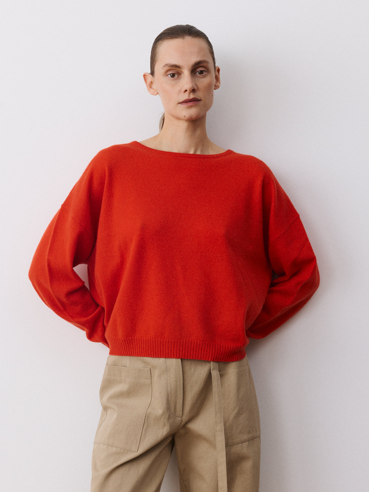 Rich in tone and rounded in shape, this watermelon red sweater brings depth to the silhouette. Knitted from a cashmere and extrafine merino wool blend yarn with a refined surface. Designed with a loose fit, wide round neckline and a shorter front length.