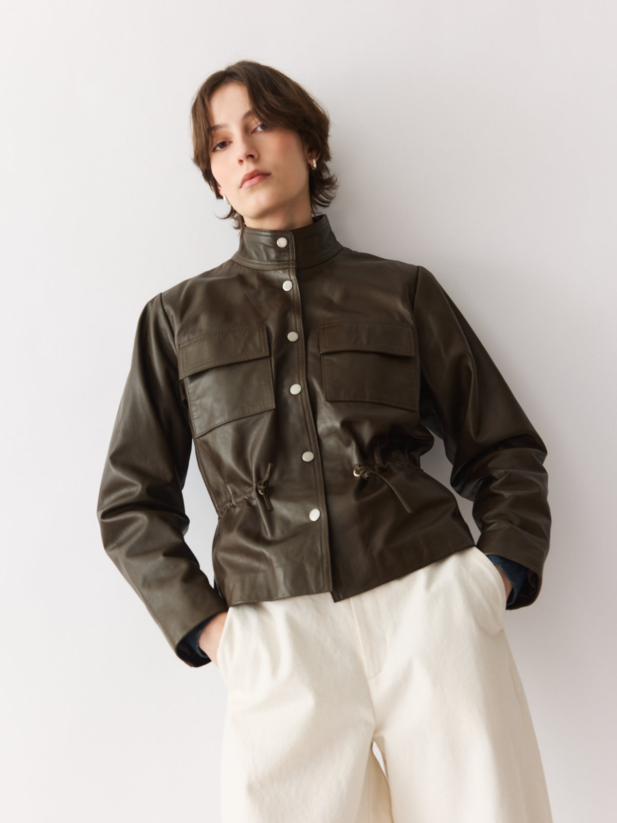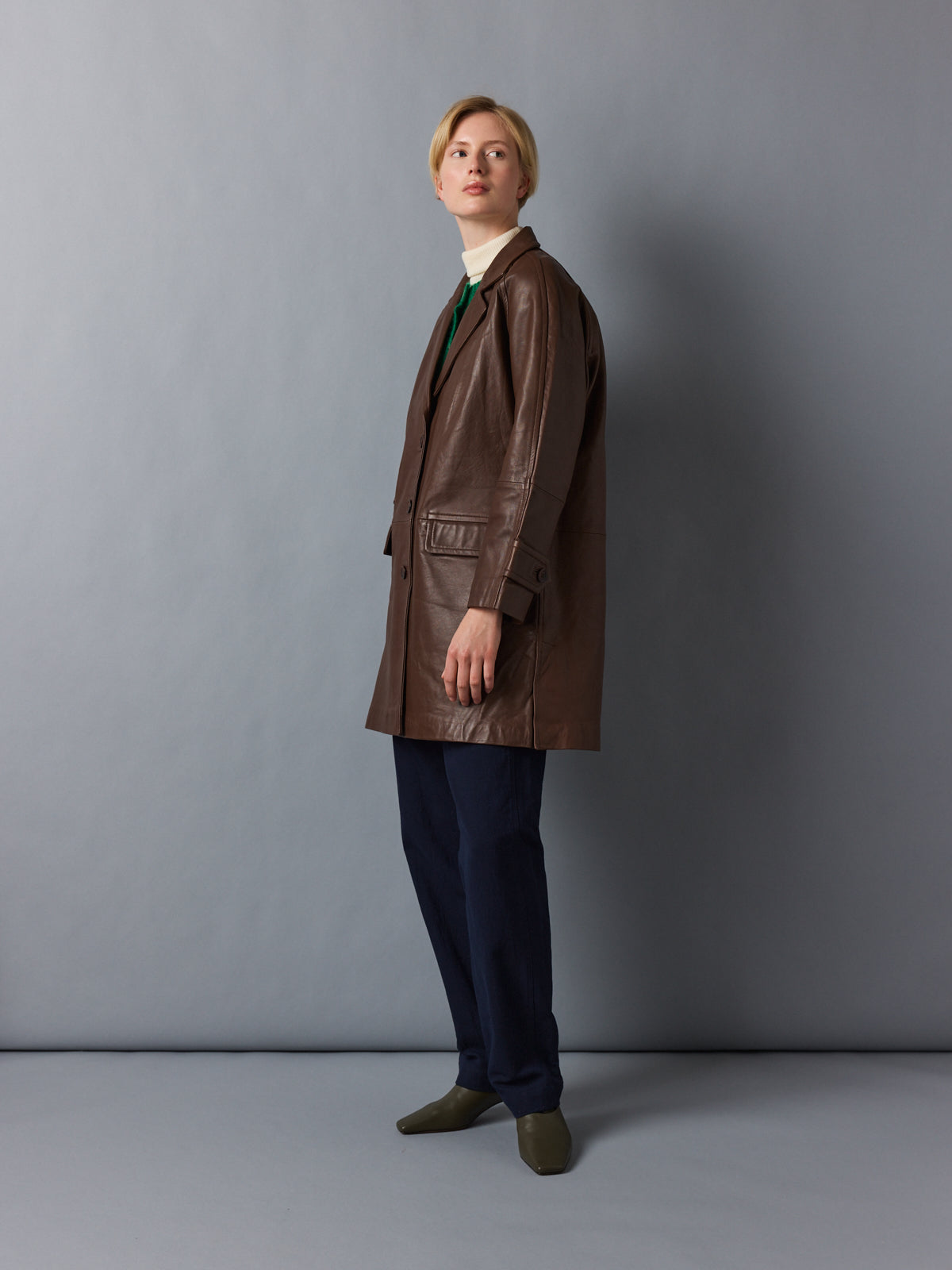 Leather has long been valued for its strength, resilience, and ability to grow more beautiful with wear. When cared for properly, it can last for decades, developing a unique patina that reflects the life of its wearer. This season, we explore the material’s tactile richness through a small selection of jackets, coats, and skirts. Each piece is designed to combine durability with refinement, balancing structure and softness for a contemporary interpretation of a timeless craft.