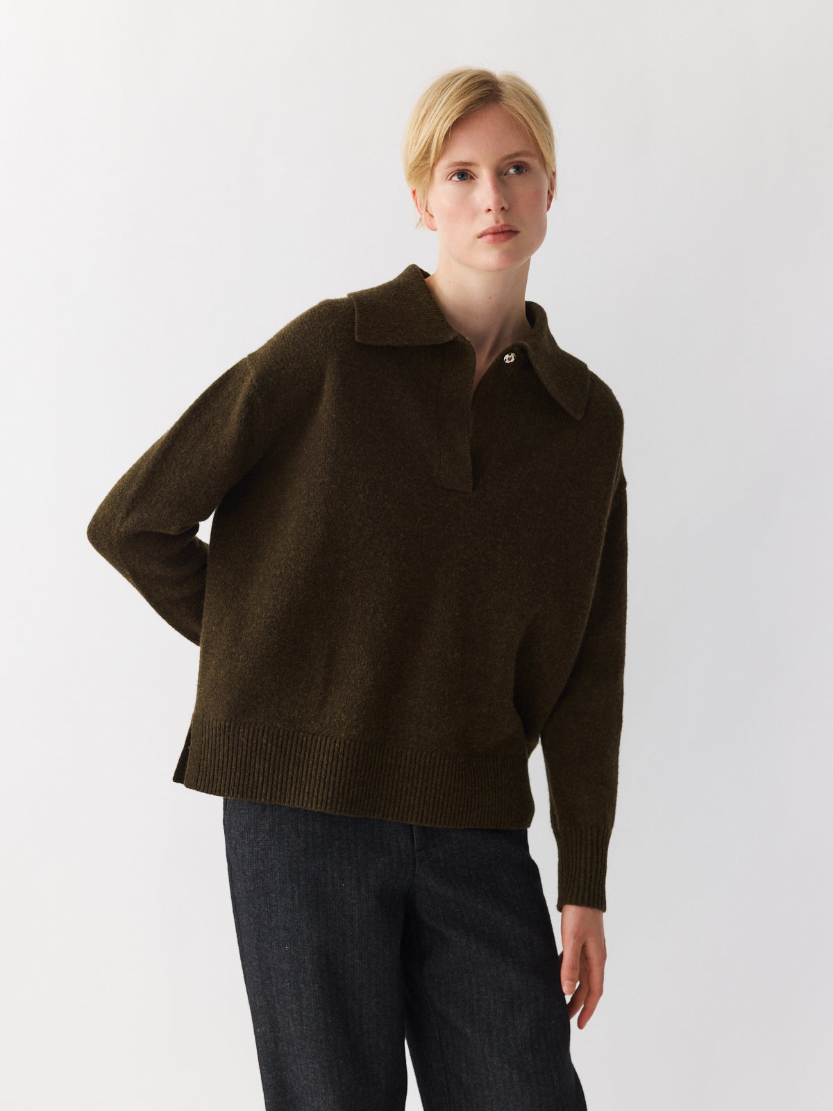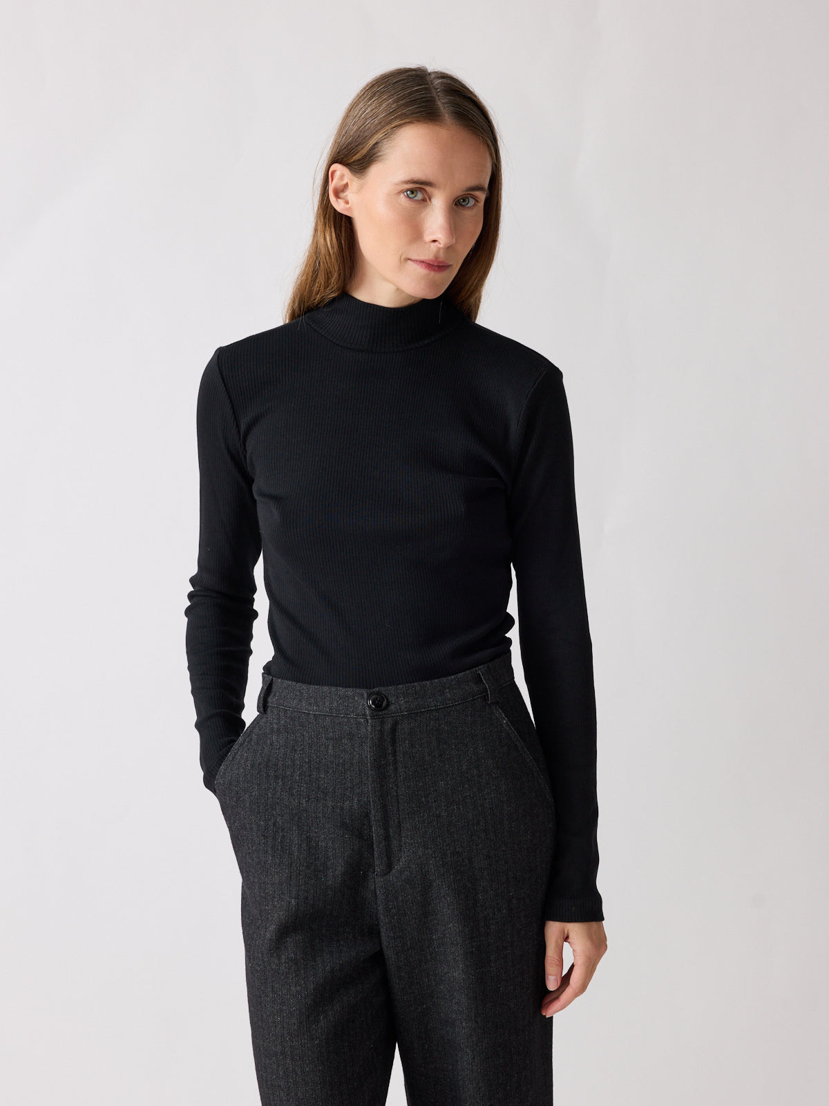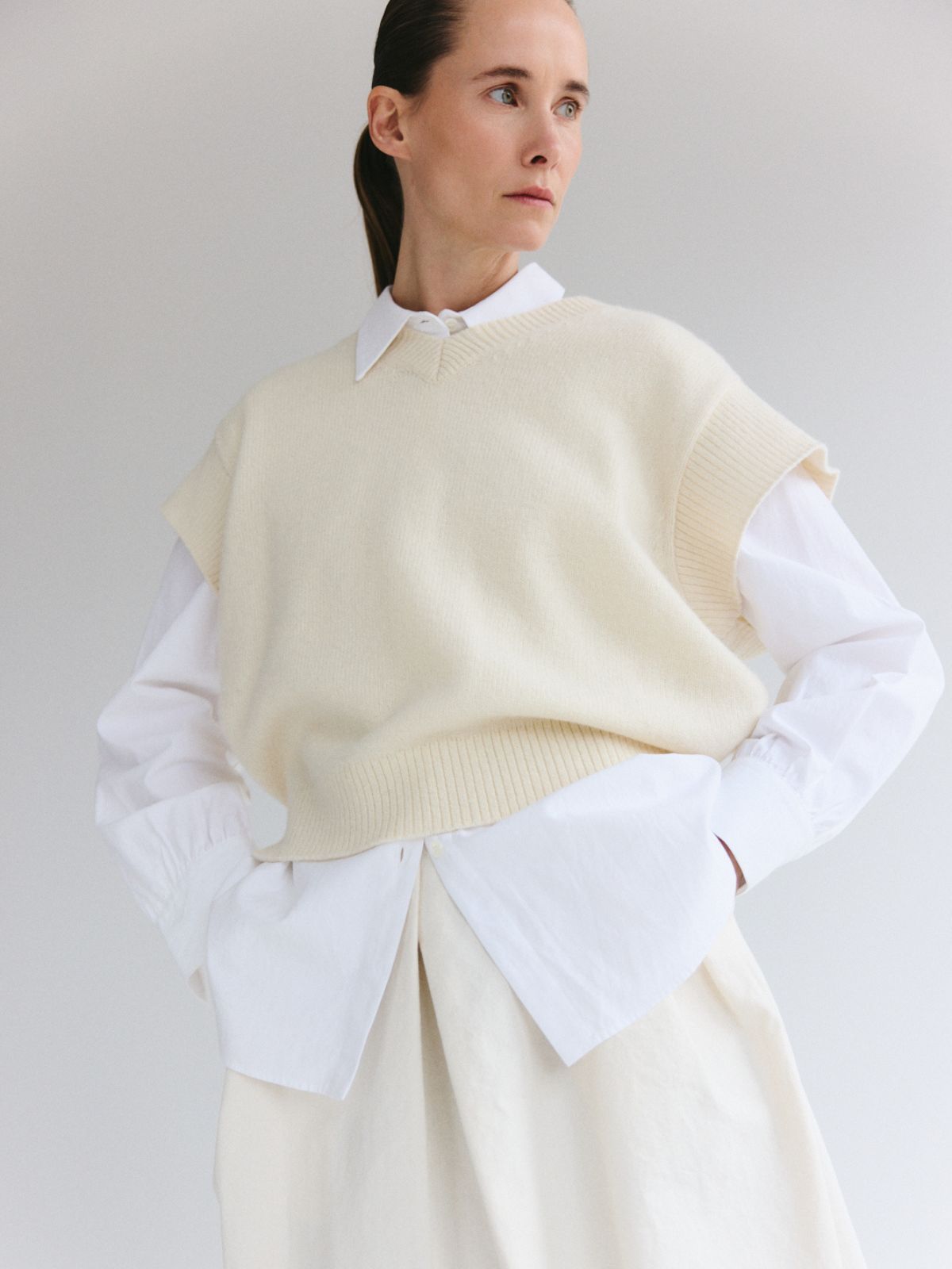 Wool is a natural fibre sourced from the fleece of sheep, prized for its warmth, and durability. It is naturally breathable and insulating, making it comfortable across a wide range of temperatures. From fine merino to coarser, more robust weaves, wool comes in many forms, each with its own character. We favour high-quality wool to create versatile and cosy knitwear, but we also use it in our tailored collection for trousers, coats and blazers, where the structure and drape of the fabric are key.