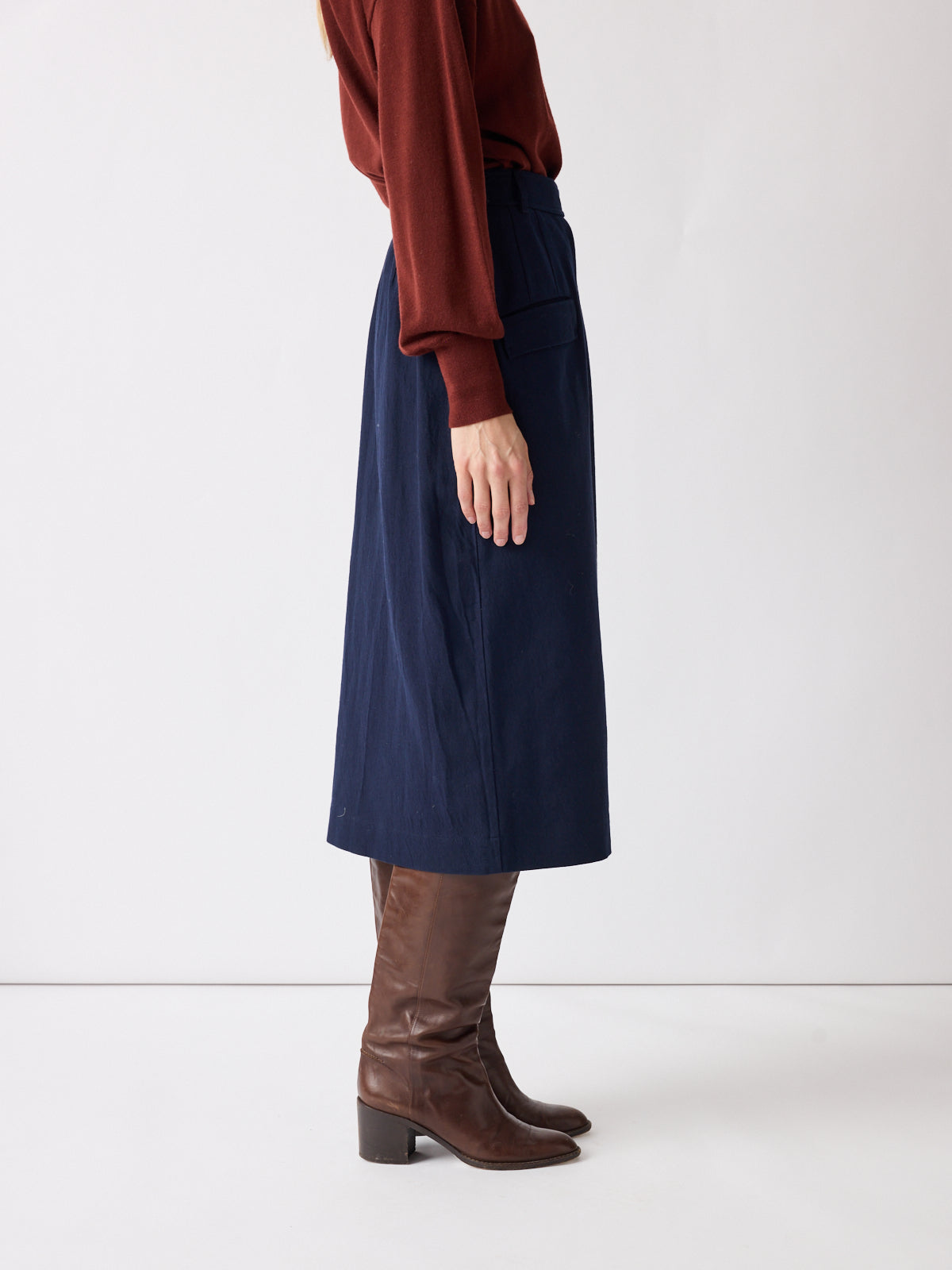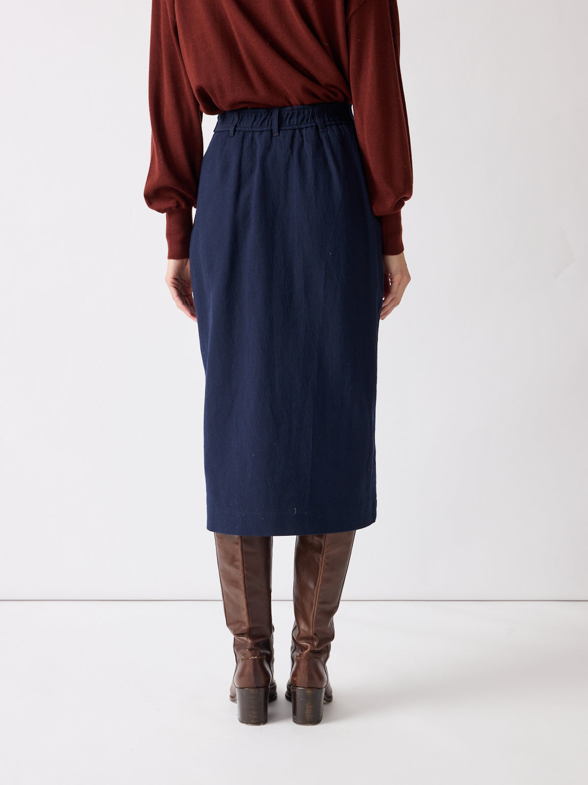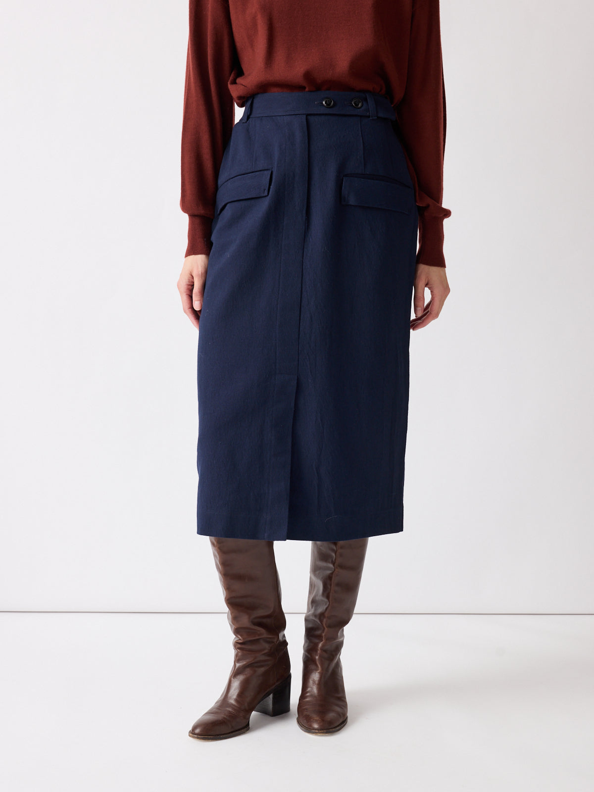 Designed for timeless versatility, this skirt is crafted from a dark navy cotton blend with a subtly textured surface that adds character while retaining its classic appeal. It sits high on the waist and falls to a midi length, featuring a front zip closure, belt with two black buttons, and belt loops. Two front patch pockets with detailed finishes and a front slit complete its functional, structured design.