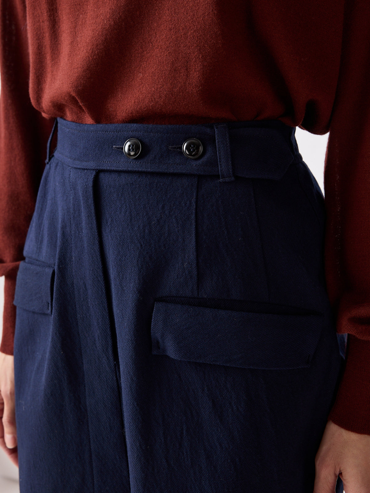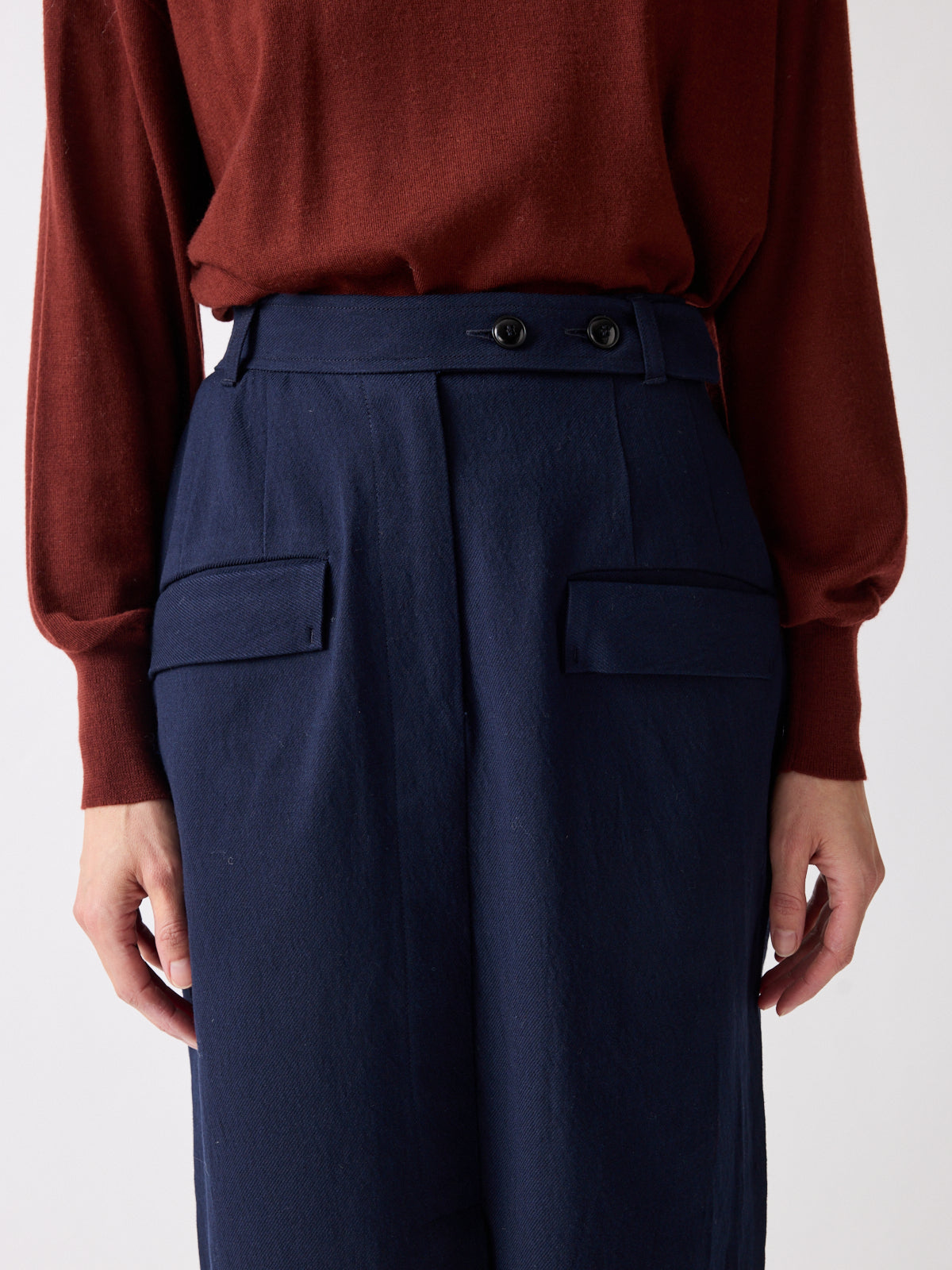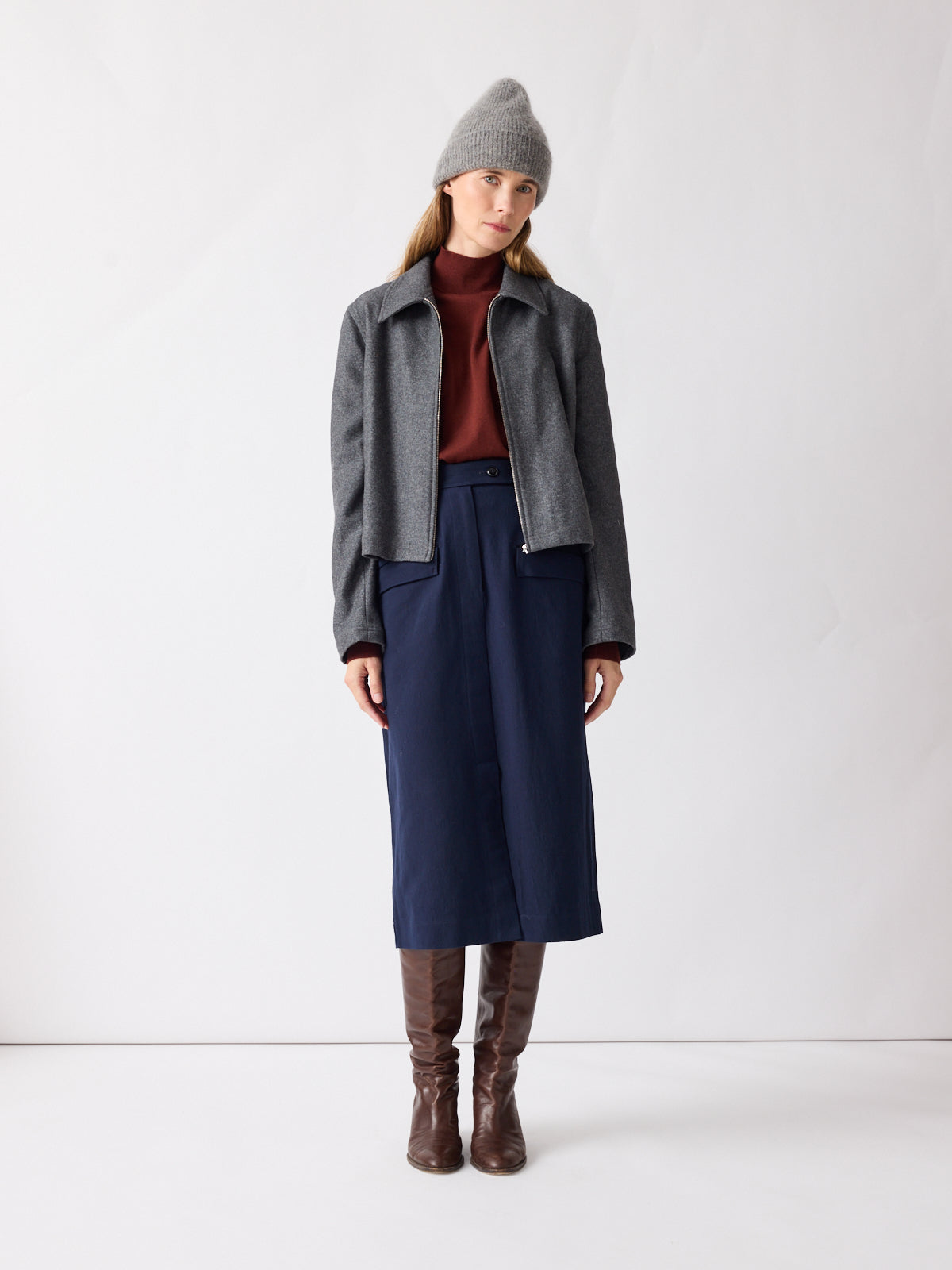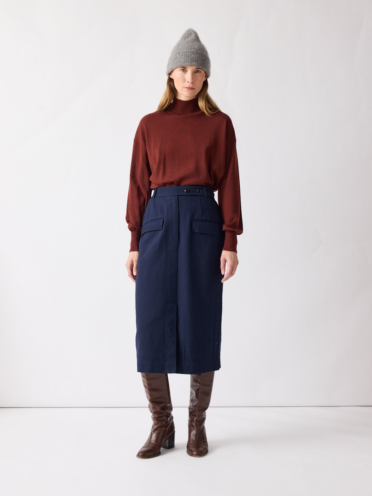 Designed for timeless versatility, this skirt is crafted from a dark navy cotton blend with a subtly textured surface that adds character while retaining its classic appeal. It sits high on the waist and falls to a midi length, featuring a front zip closure, belt with two black buttons, and belt loops. Two front patch pockets with detailed finishes and a front slit complete its functional, structured design.