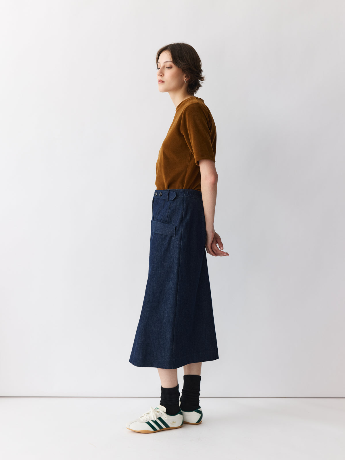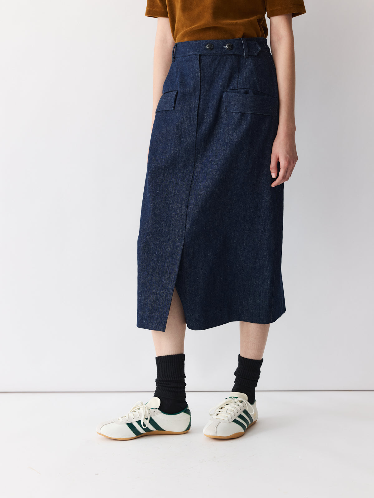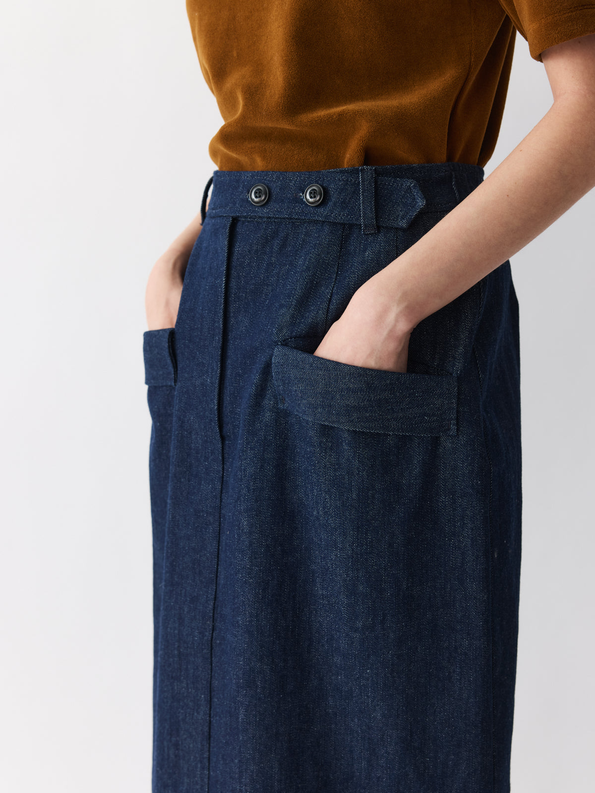 Echoing classic denim workwear heritage, this skirt is crafted from dark navy denim with a super-soft feel. Its structured character is balanced by a hint of fluidity, creating an easy drape. Designed with a high-rise waist and midi length, it features a front zip closure, a belt with two black buttons, and belt loops. Two front patch pockets and a front slit complete its design.