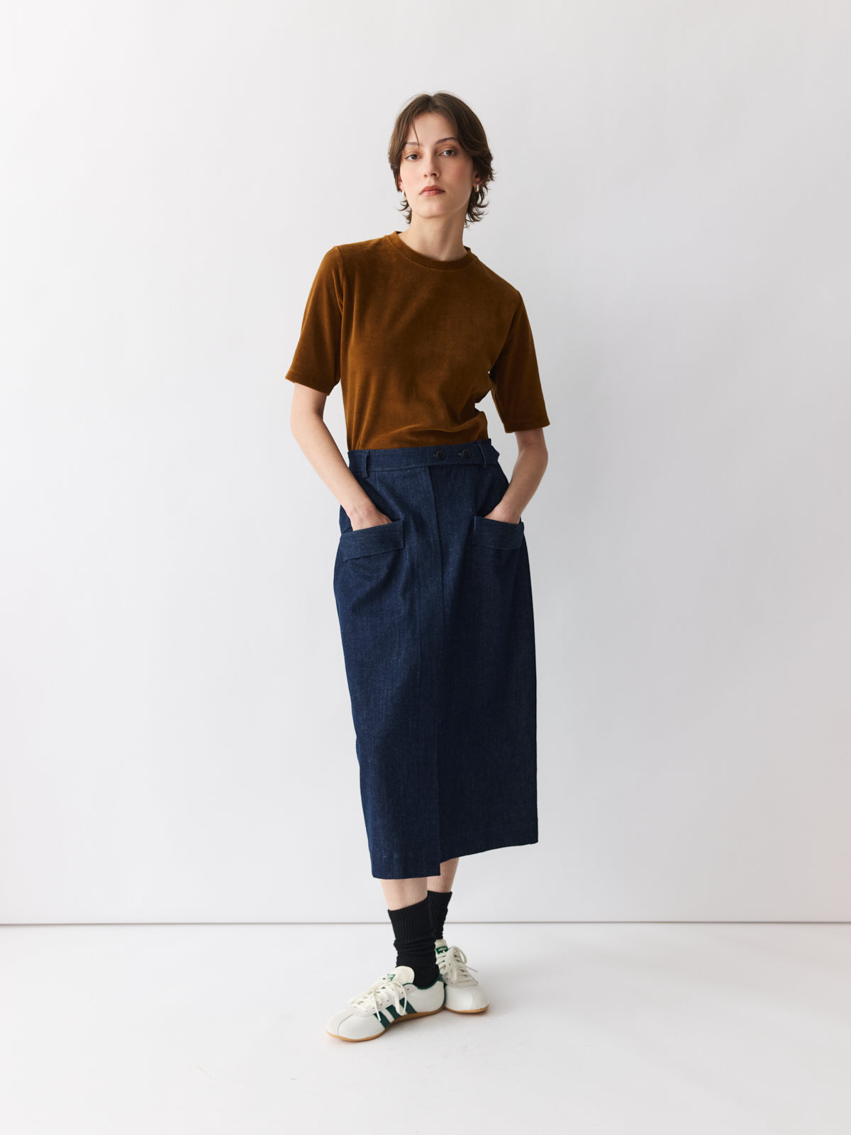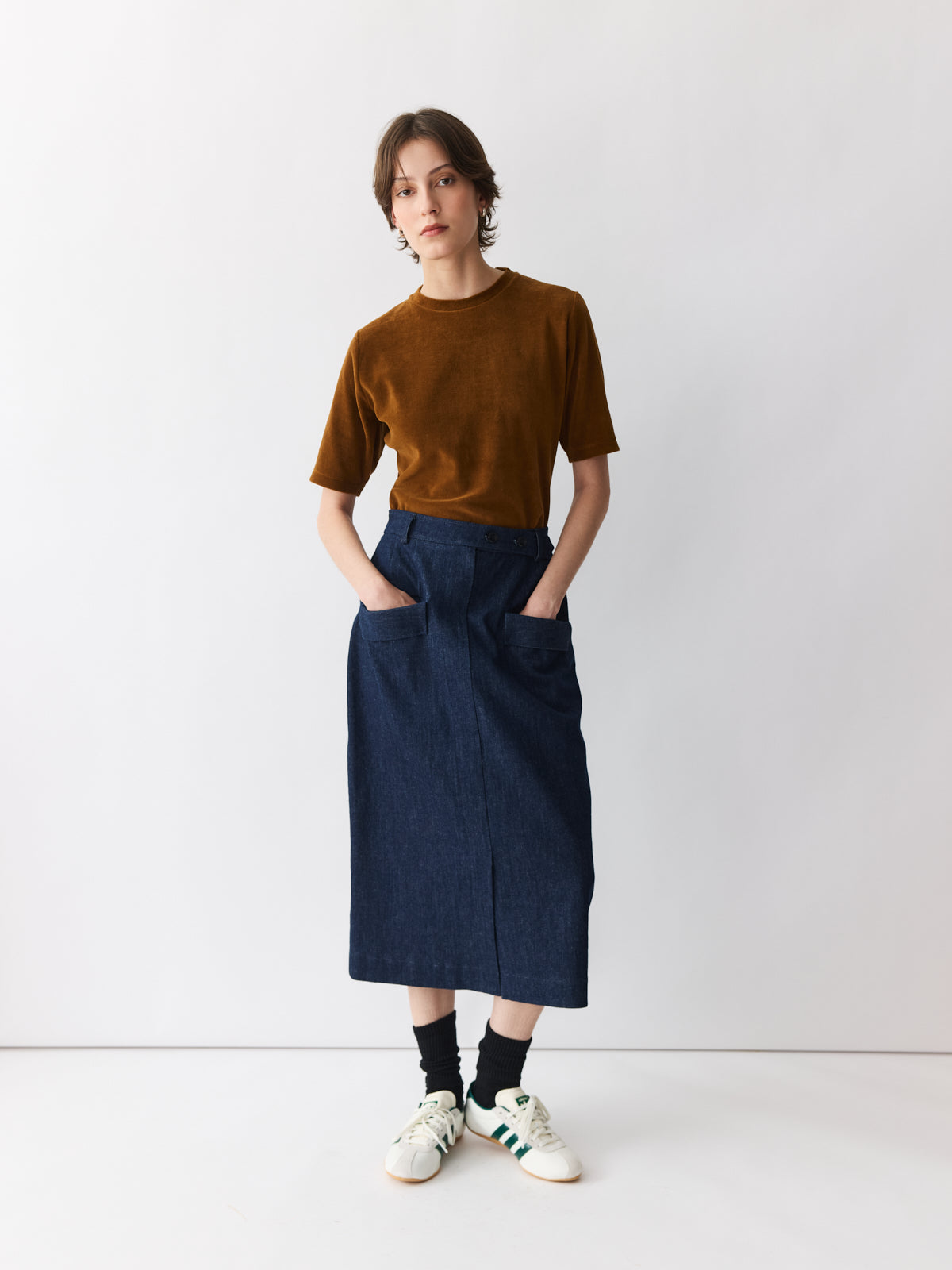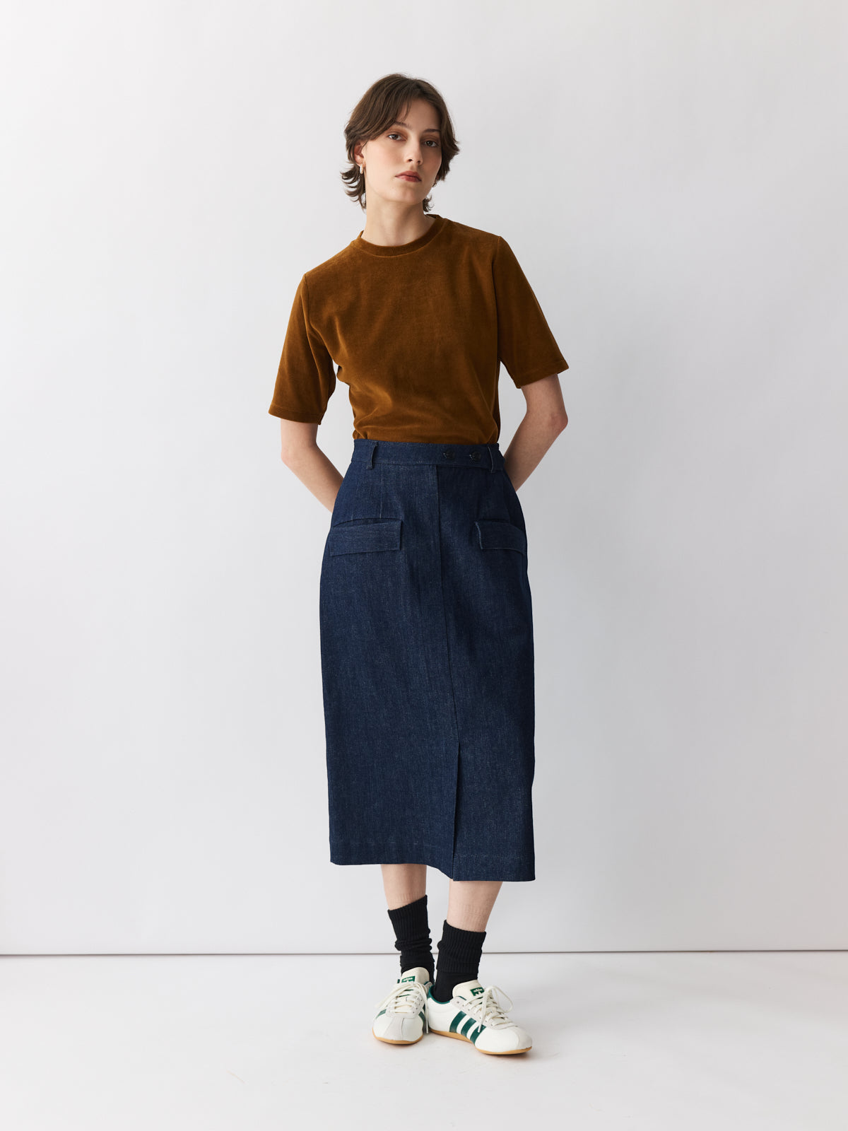 Echoing classic denim workwear heritage, this skirt is crafted from dark navy denim with a super-soft feel. Its structured character is balanced by a hint of fluidity, creating an easy drape. Designed with a high-rise waist and midi length, it features a front zip closure, a belt with two black buttons, and belt loops. Two front patch pockets and a front slit complete its design.