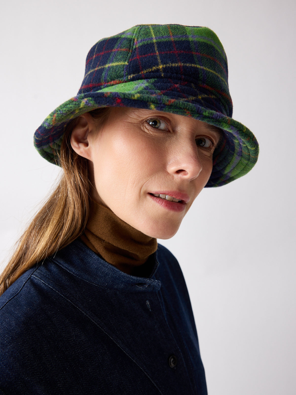 This Bronté bucket hat in soft wool showcases a classic Scottish check in green and blue, accented with a fine red and yellow line. Its flat top and medium-sized brim (approx. 5 cm) recall the timeless functionality of the original bucket hat, first worn by sailors and Irish farmers in the early 1900s.