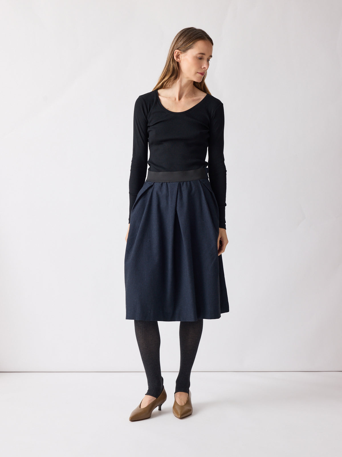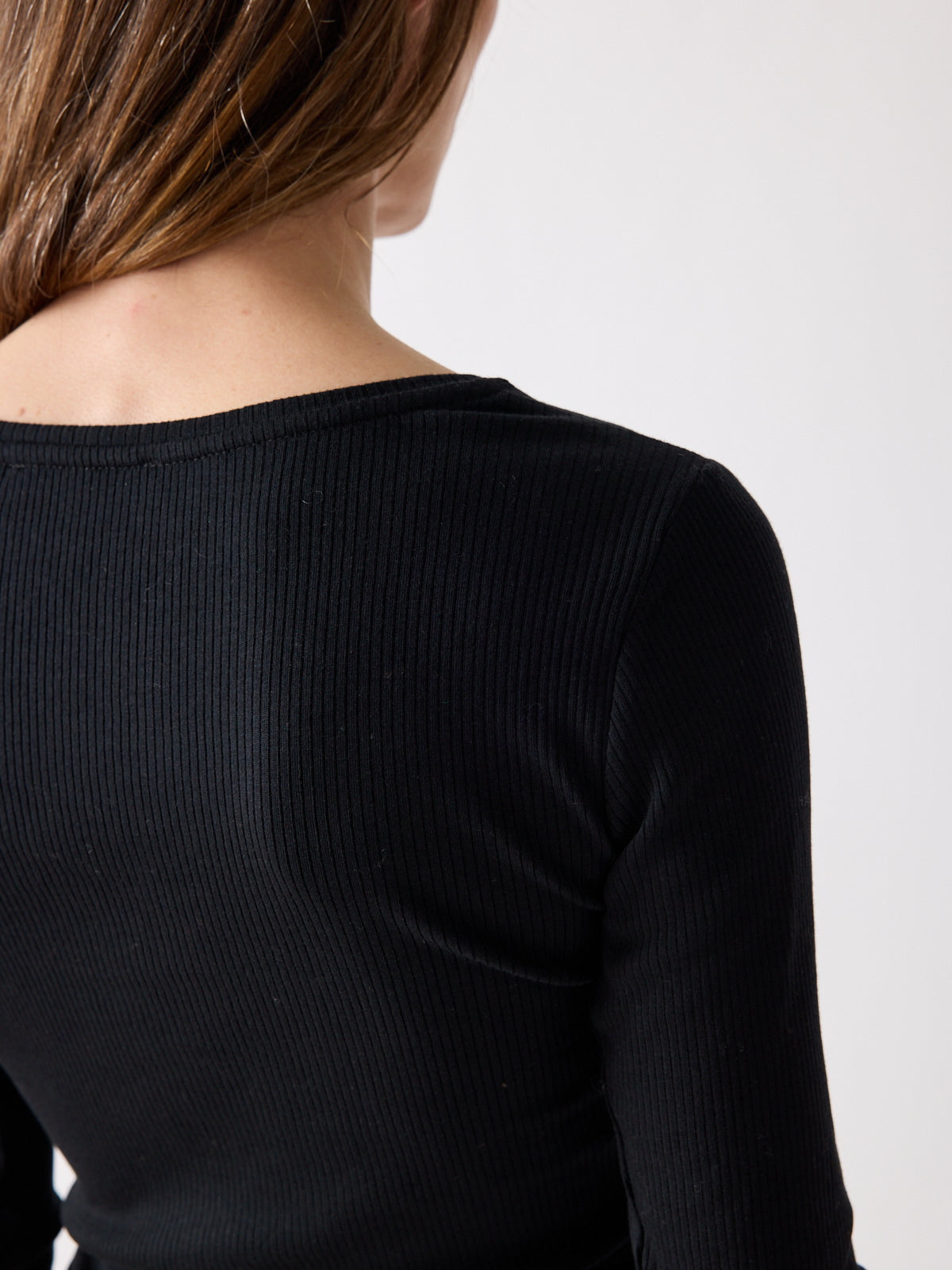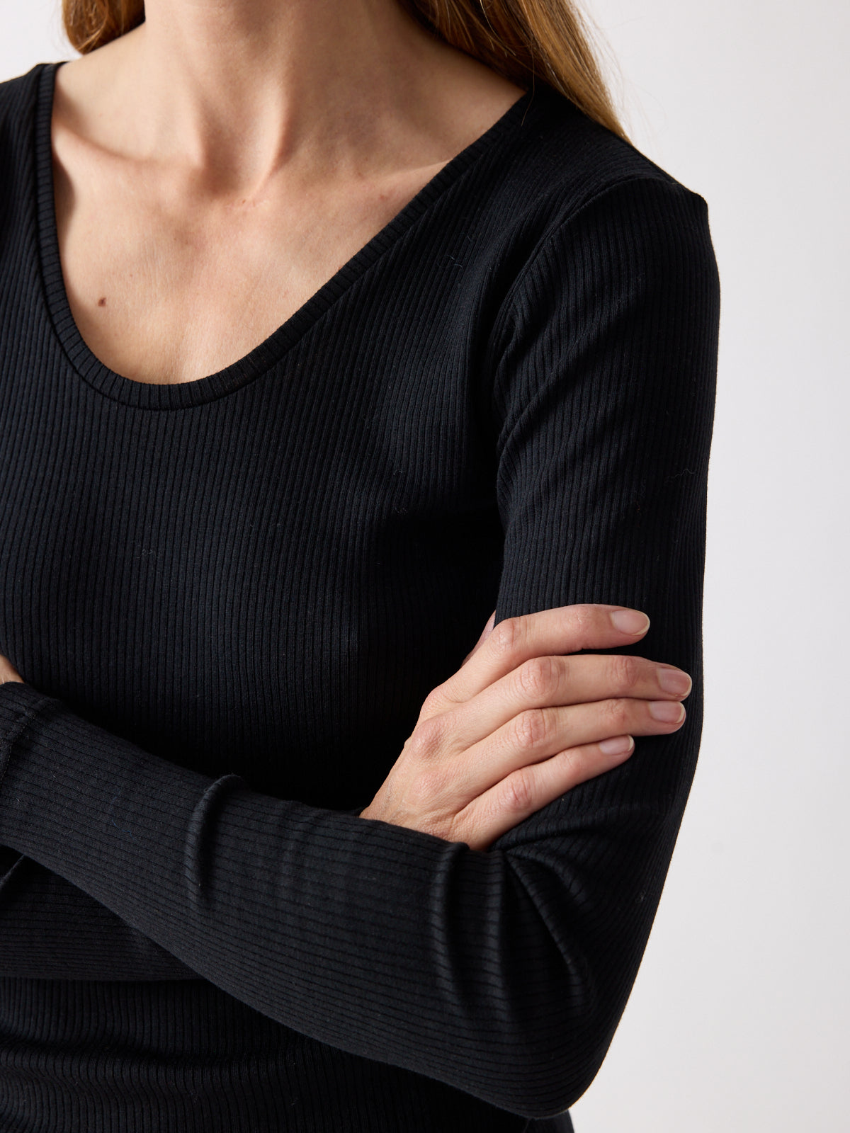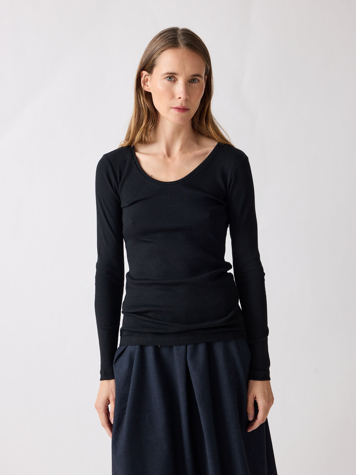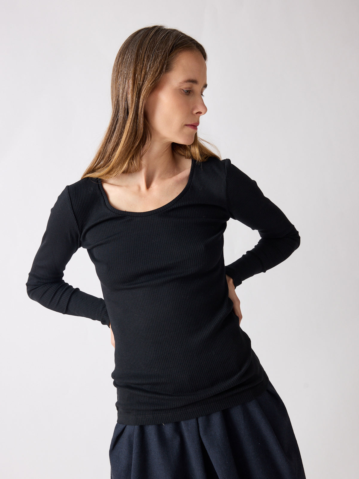 This winter T-shirt is crafted from an 80% cotton, 20% cashmere rib knit in deep black. The cashmere adds warmth and luxury, while the rib’s natural stretch creates a neat fit. Designed with a deep round neckline and long sleeves.