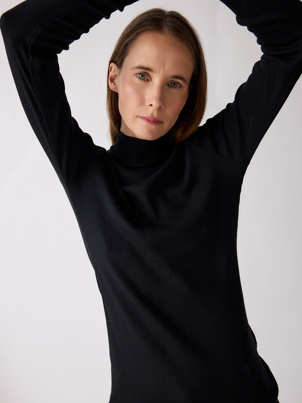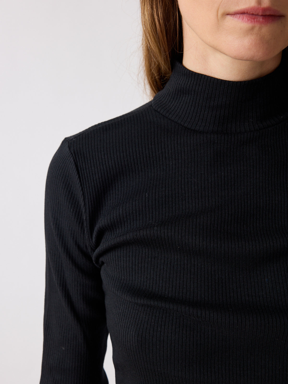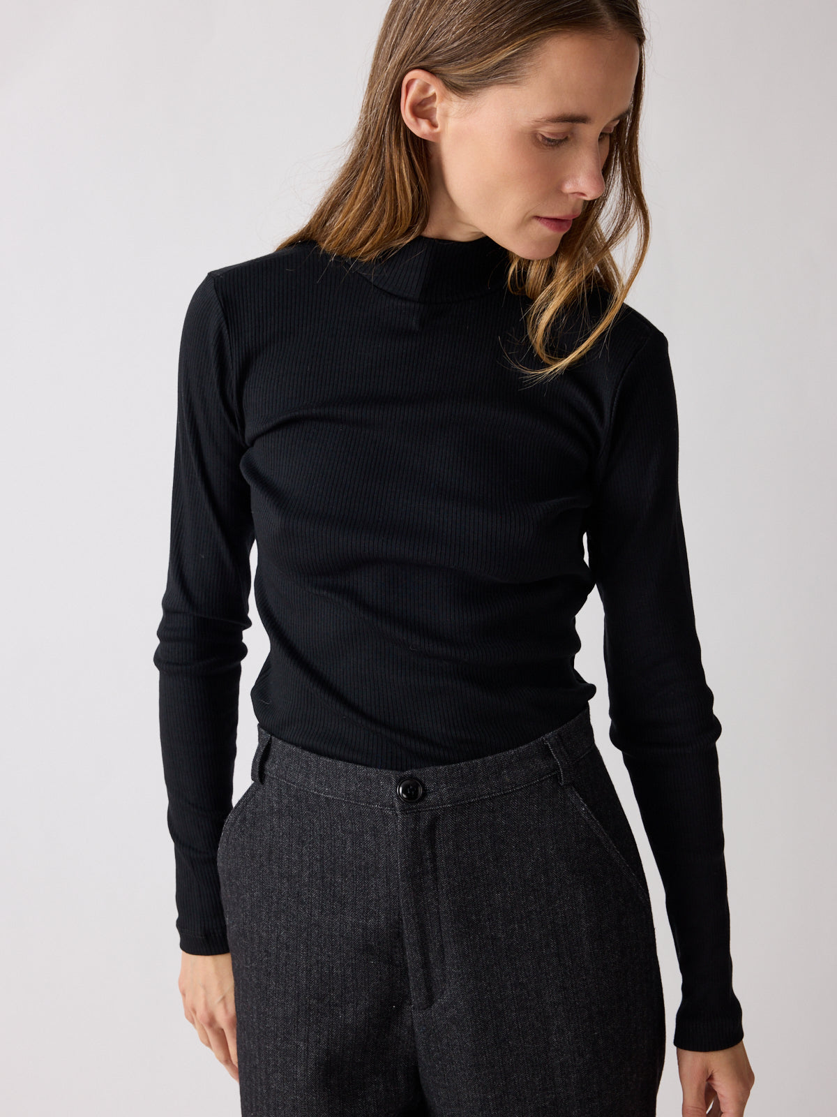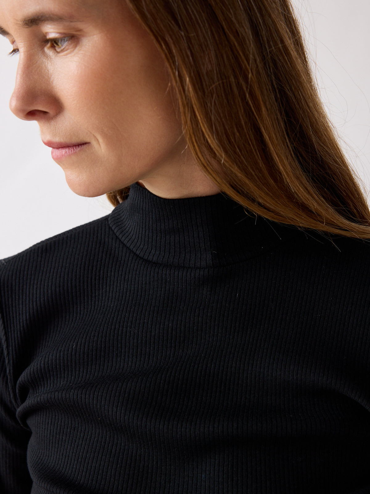 This winter T-shirt is crafted from an 80% cotton, 20% cashmere rib knit in deep black. The neat, close-to-the-body fit pairs with a mock neck and long sleeves. Cashmere adds warmth and luxury, while the rib provides natural stretch.