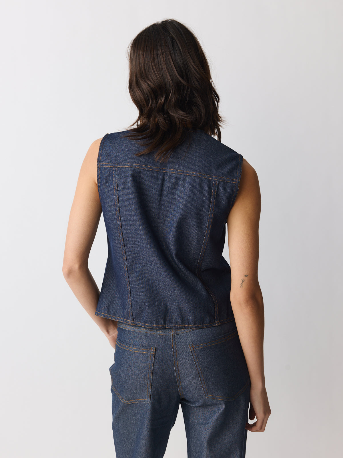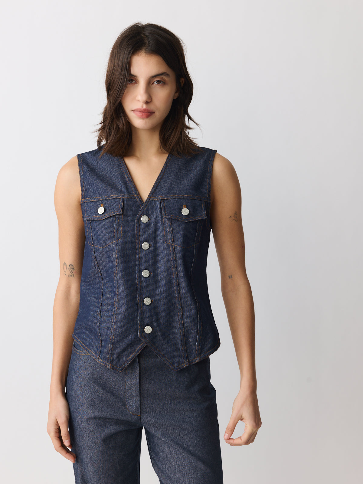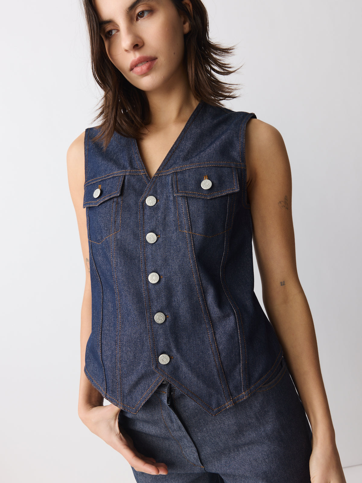 Inspired by a low-key ’90s attitude, this sleeveless vest balances feminine lines with denim character. Cut from a cotton and viscose denim in blue twill with a fine white line, it features a neat fit, V-neck, jeans-style button closure and front patch pockets.