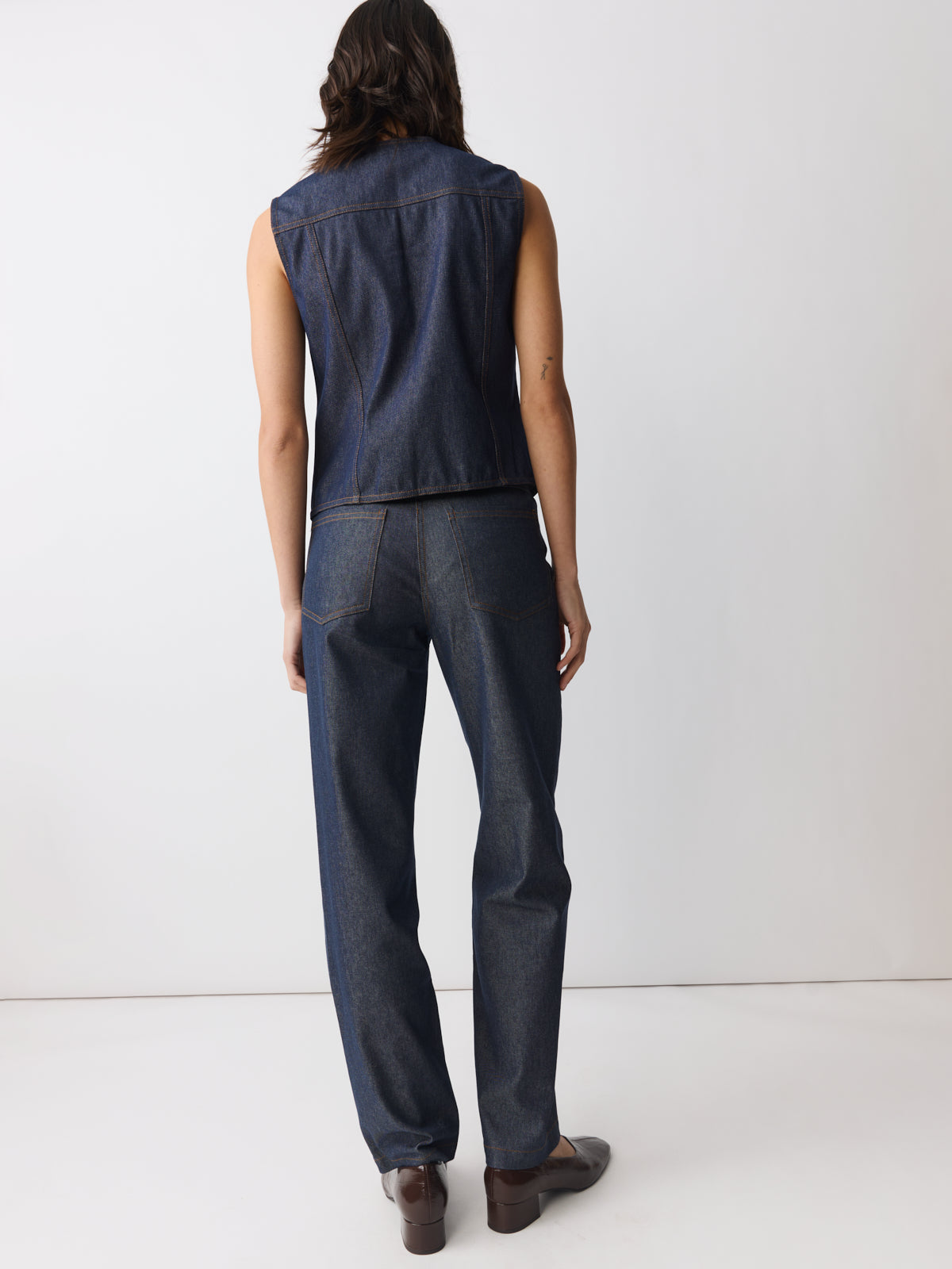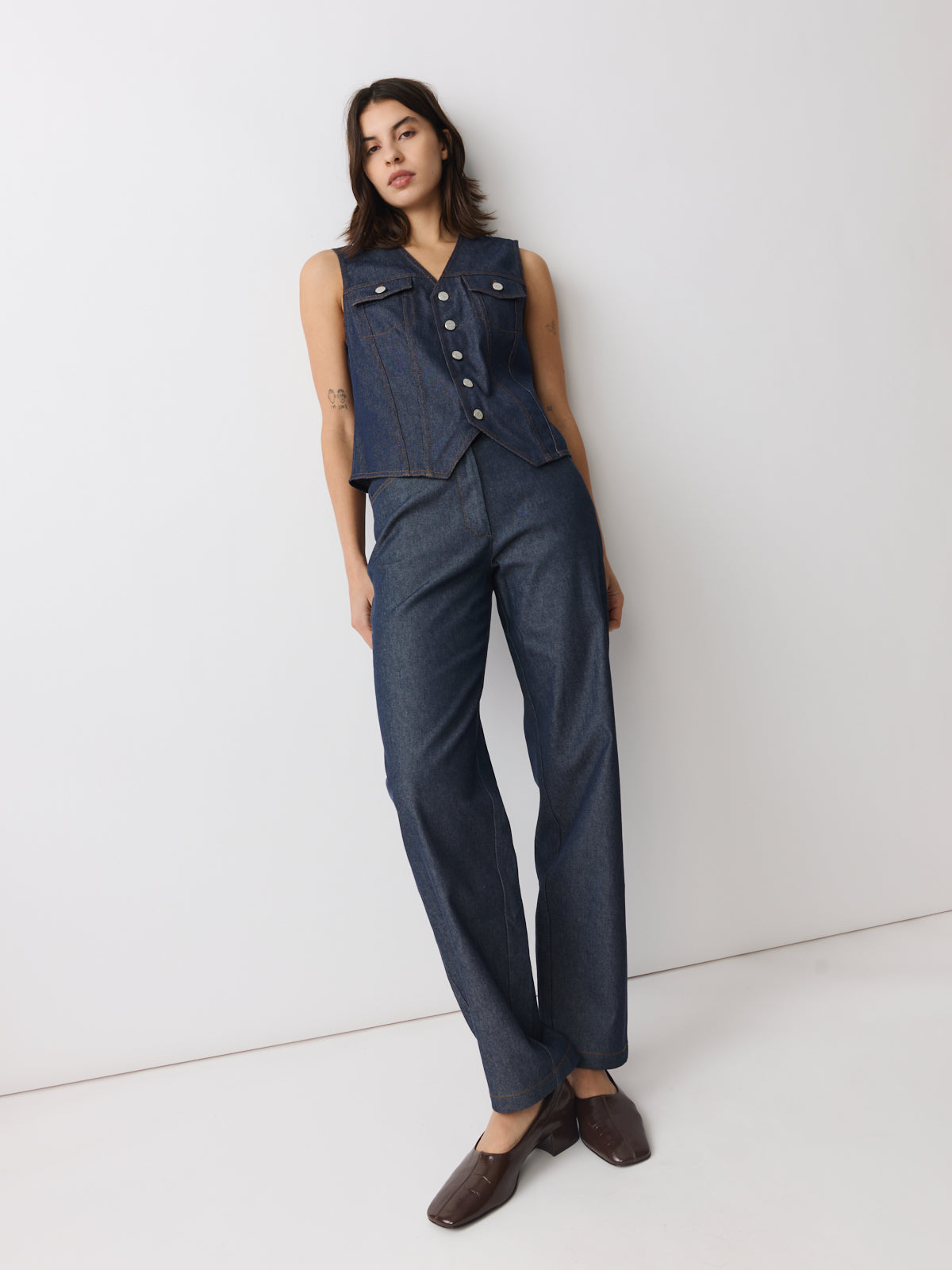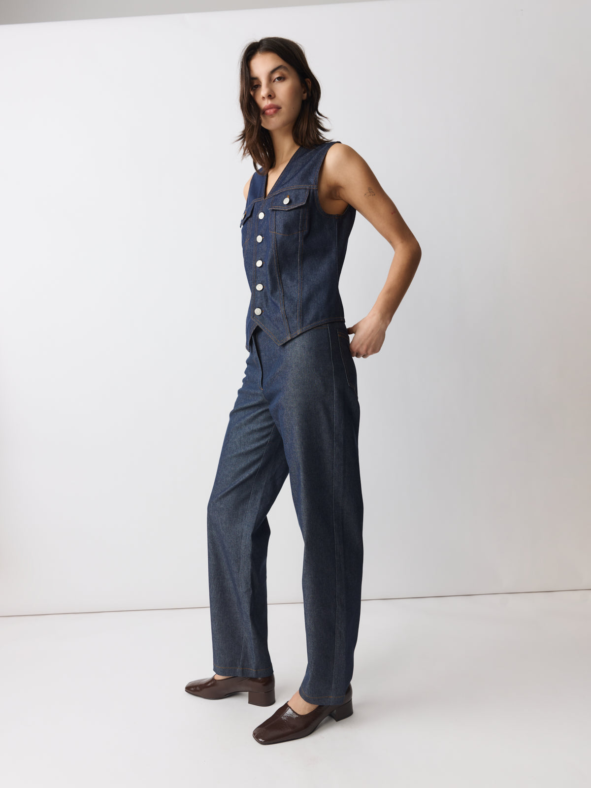 Inspired by a low-key ’90s attitude, this sleeveless vest balances feminine lines with denim character. Cut from a cotton and viscose denim in blue twill with a fine white line, it features a neat fit, V-neck, jeans-style button closure and front patch pockets.