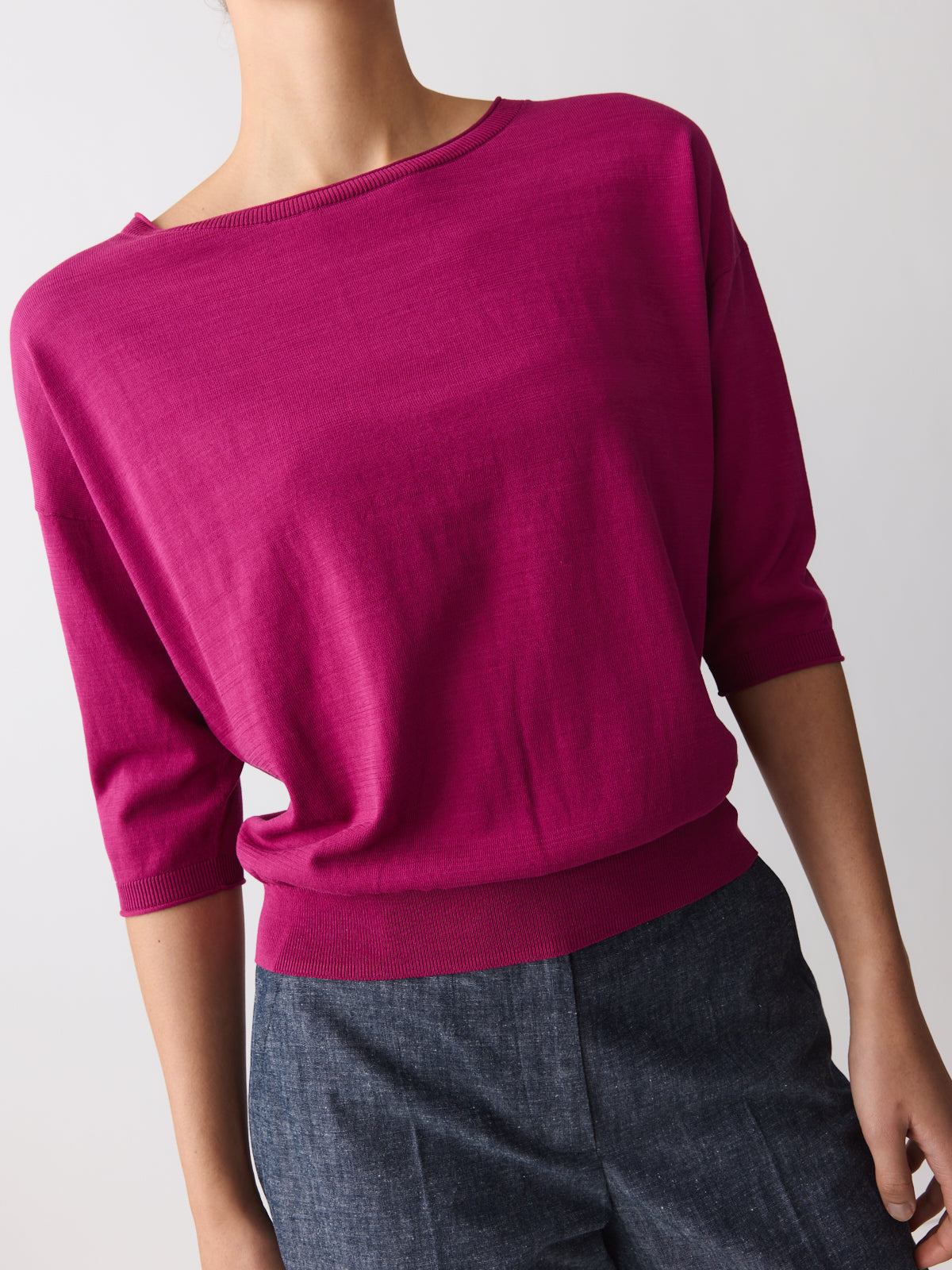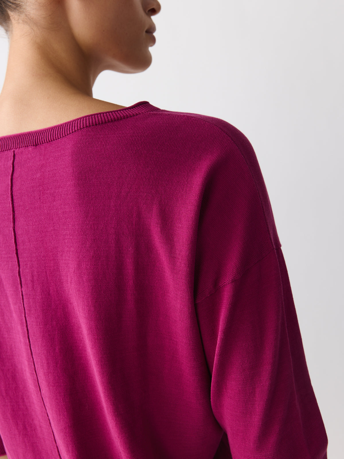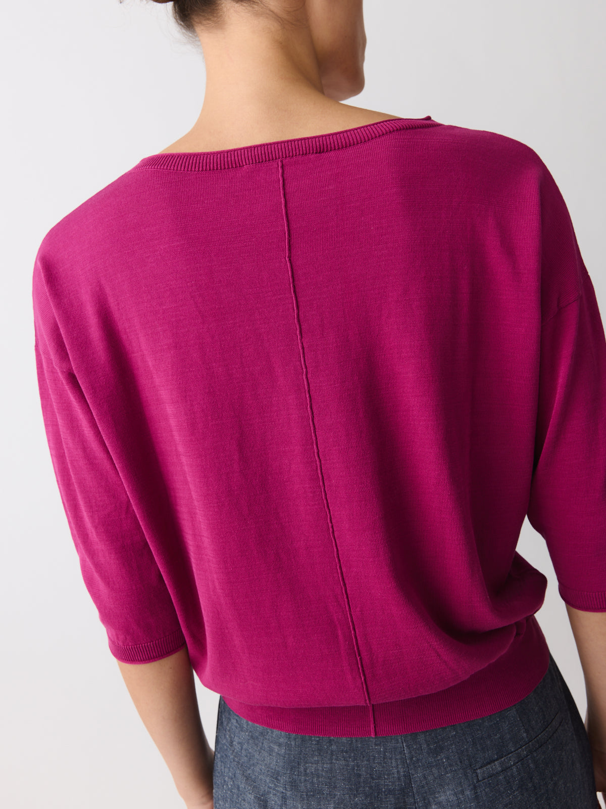 Easy in shape, this 3/4 sleeve summer sweater stands out through colour. Knitted from a fine cotton yarn in vibrant fuchsia pink. Designed with dropped shoulders, a wide round neckline and a slightly fitted waistband.