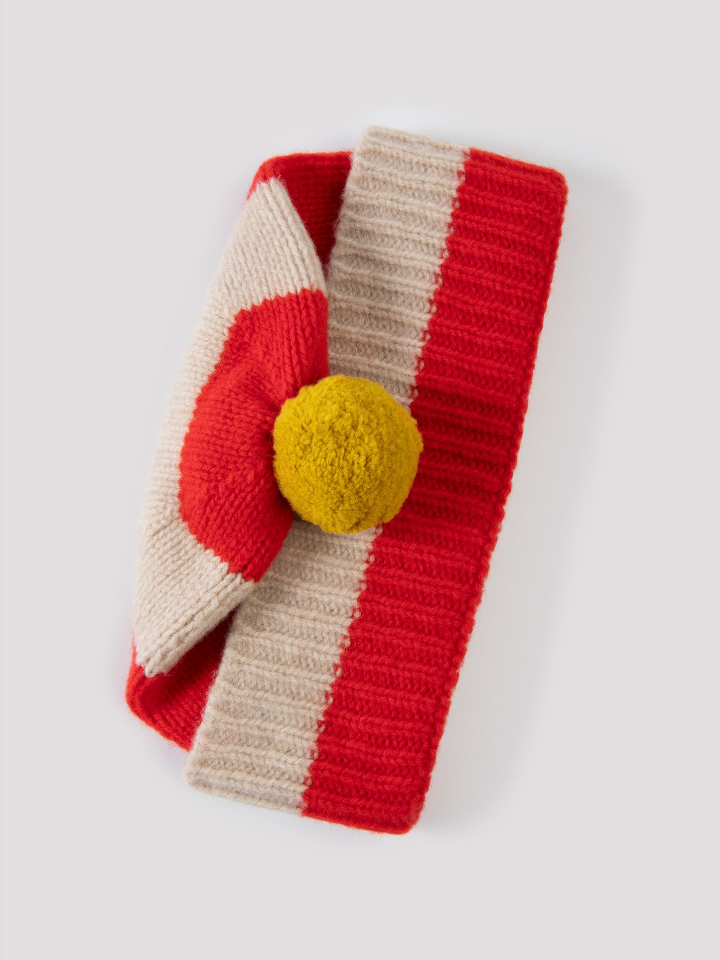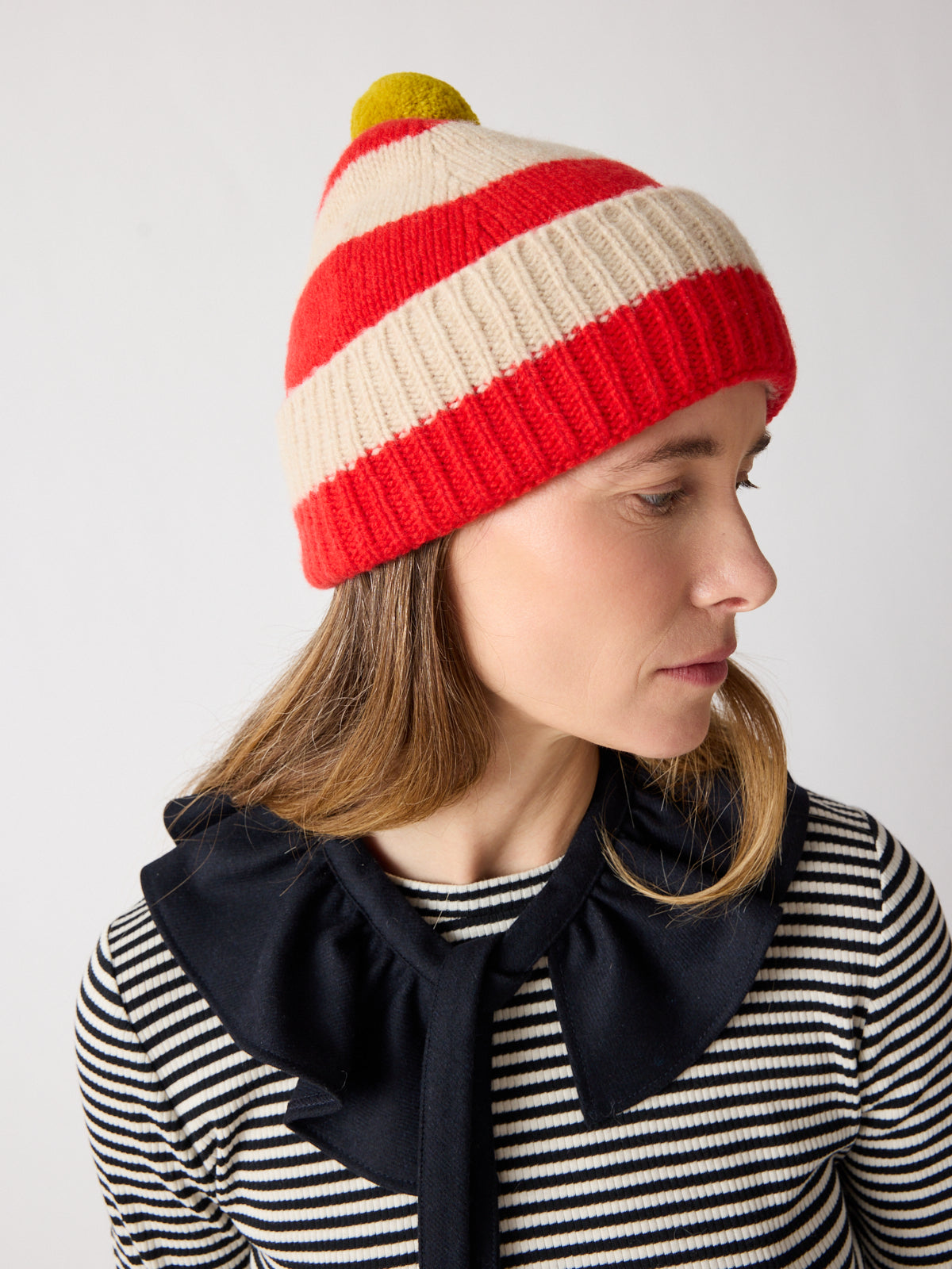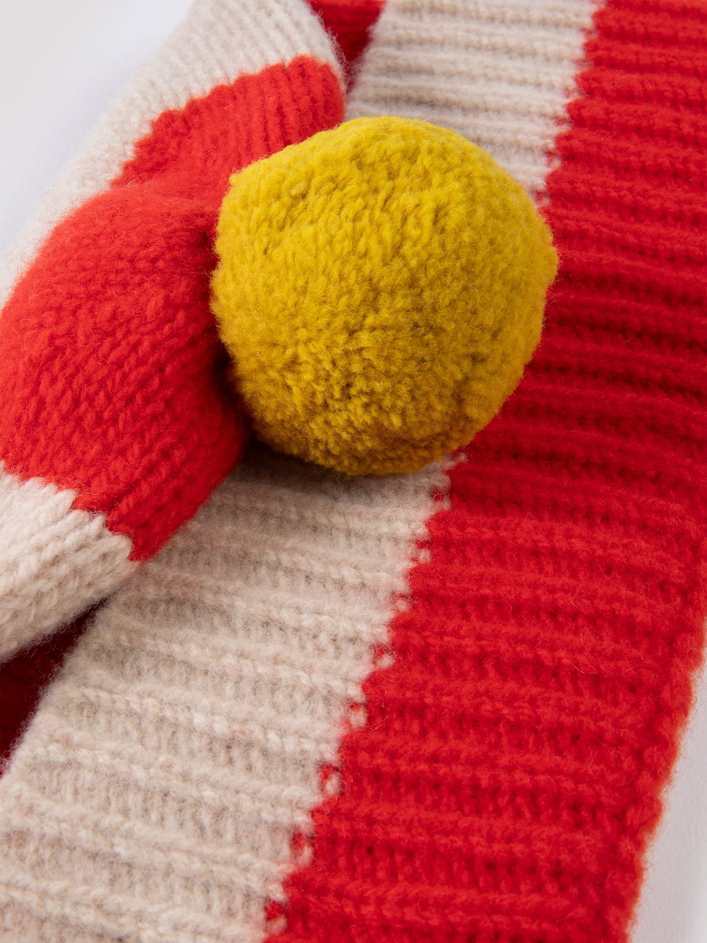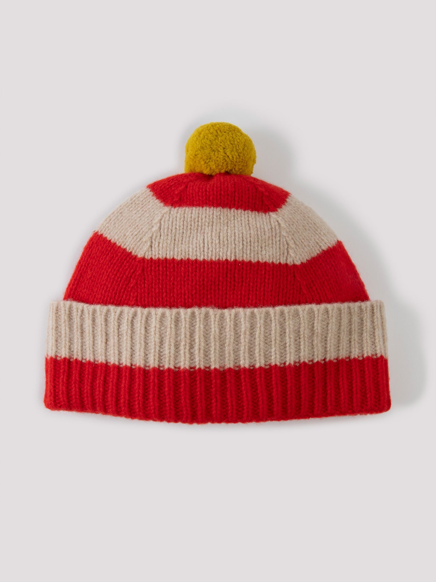 A striped lambswool hat finished in red and cream with a yellow pompom. Knitted with a specialist Fleecage technique, it's playful and cosy.