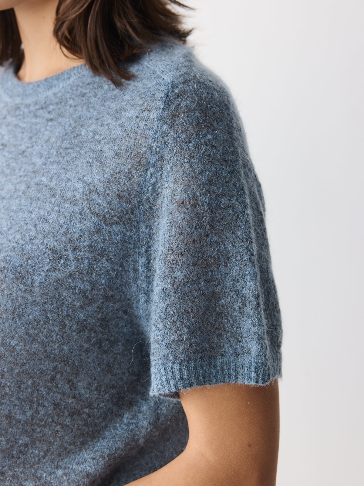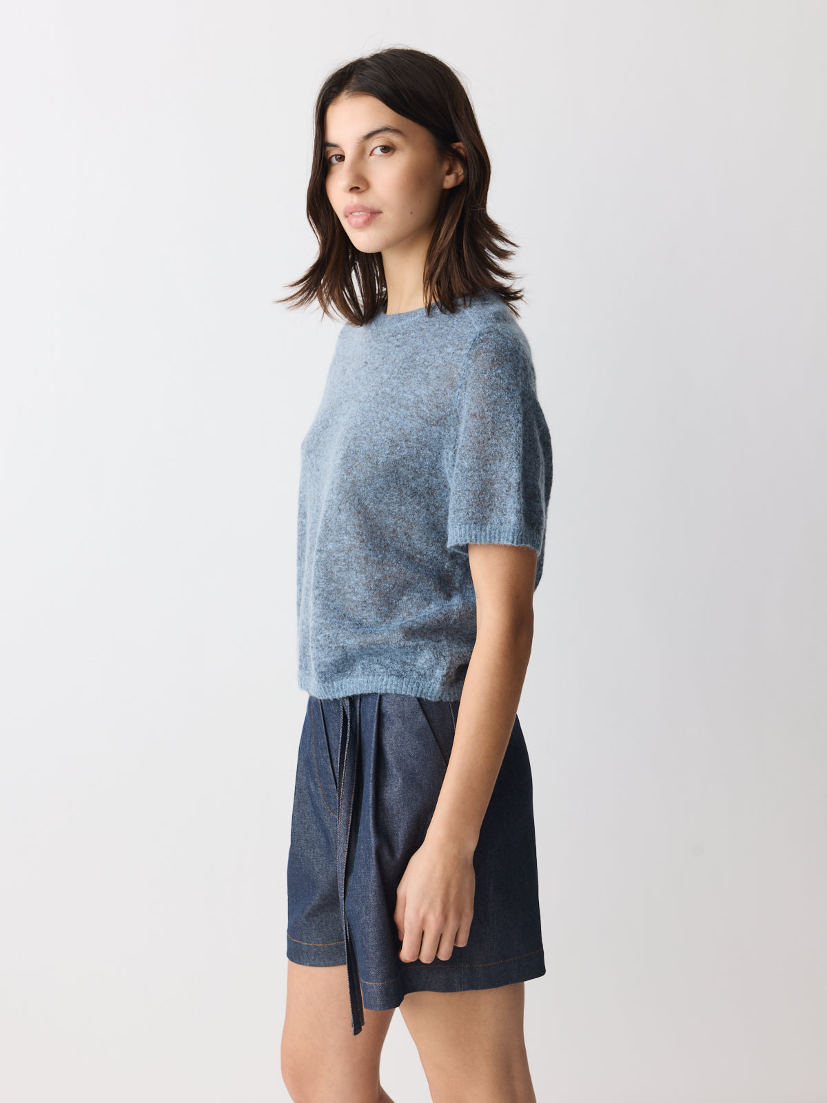 A knitted take on the classic T-shirt, this sheer stormy blue style feels light and refined. Knitted from a kid mohair blend with a subtly transparent surface and fuzzy texture, it features a round neckline, saddle sleeves and a regular, straight fit.