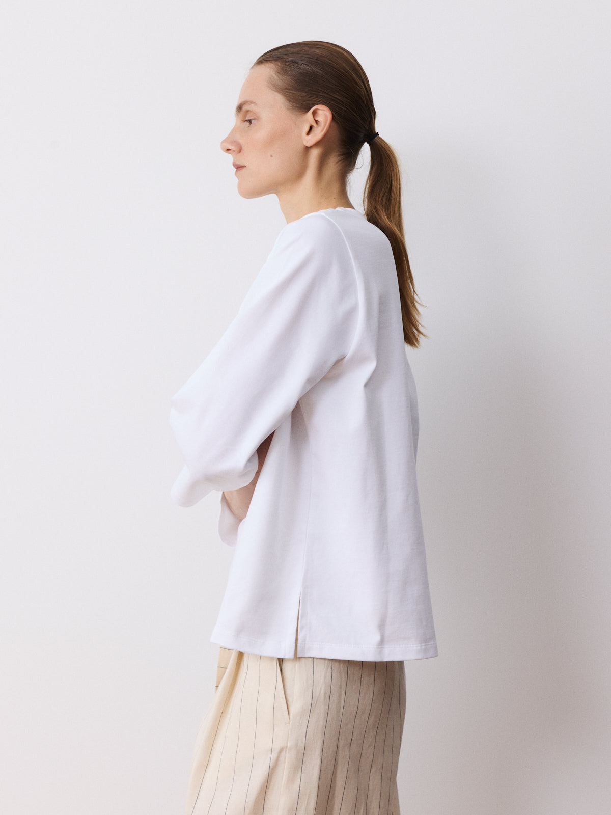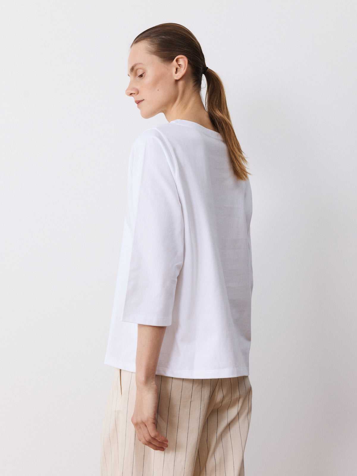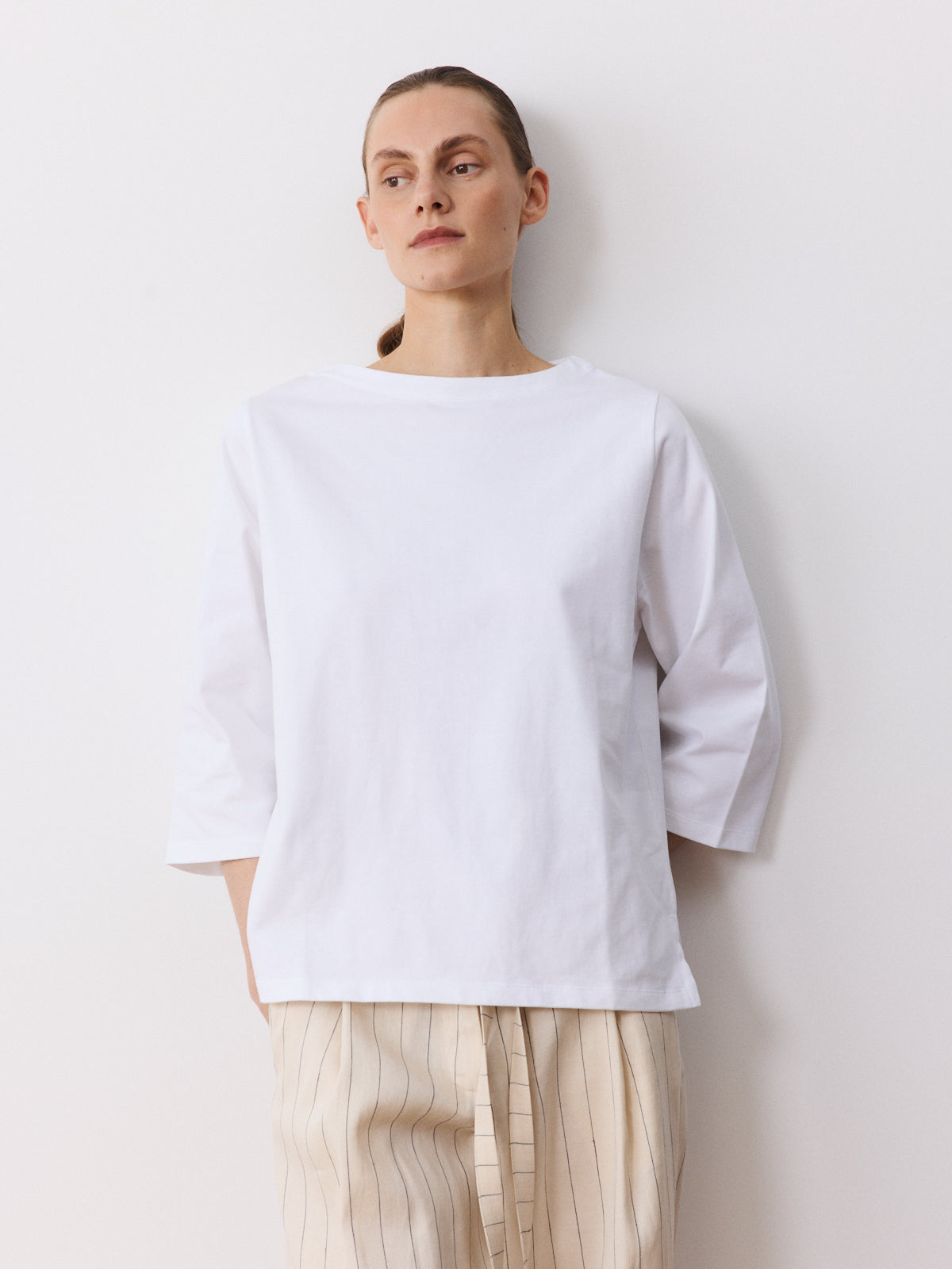 A calm wardrobe staple in crisp white, this heavy cotton T-shirt is made to last. Crafted from 100% cotton, it features a boat neckline, 3/4 sleeves, neat shoulders and a relaxed fit.