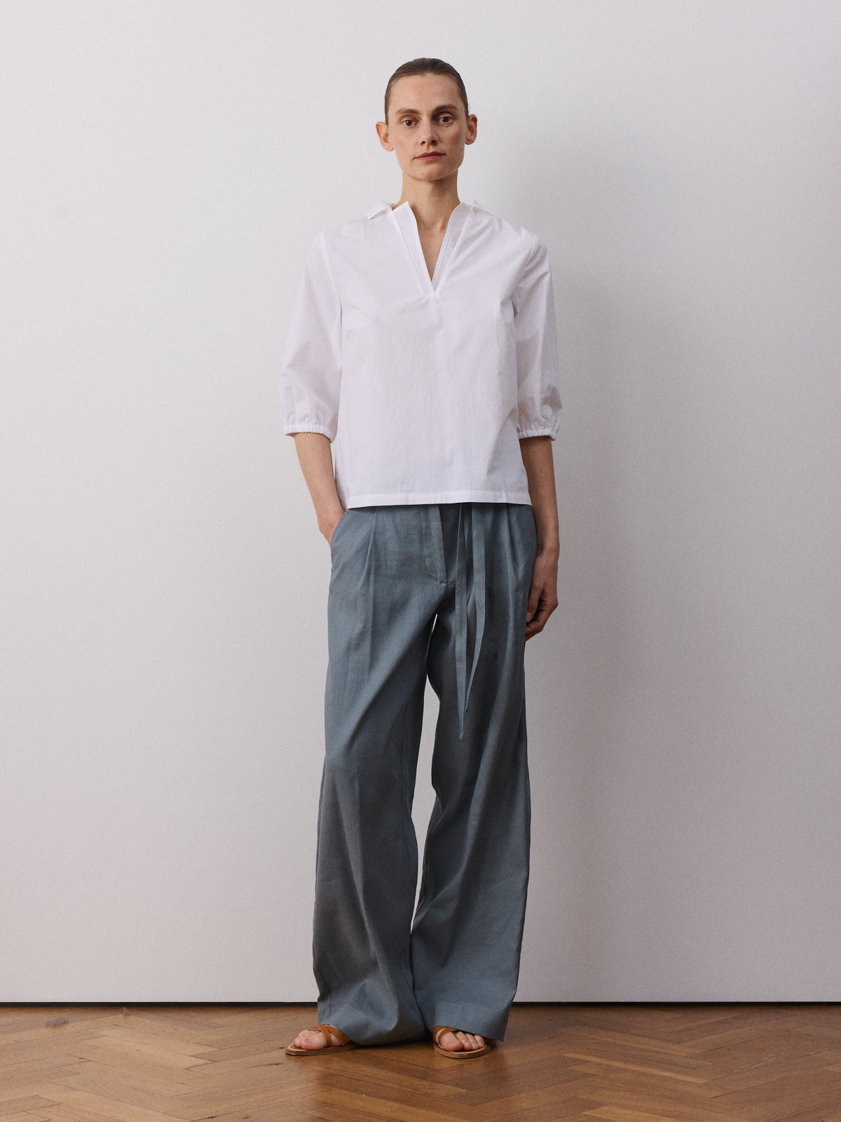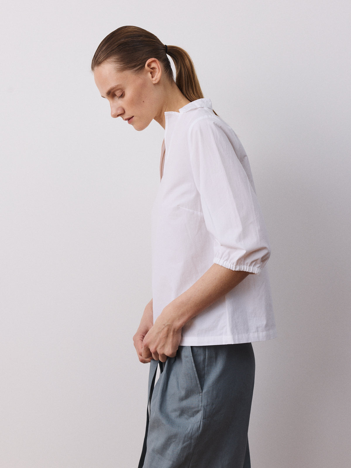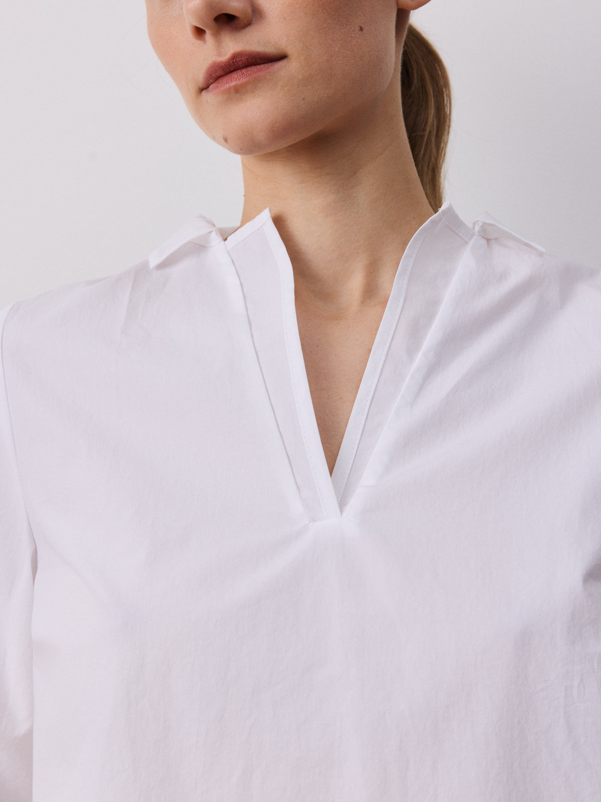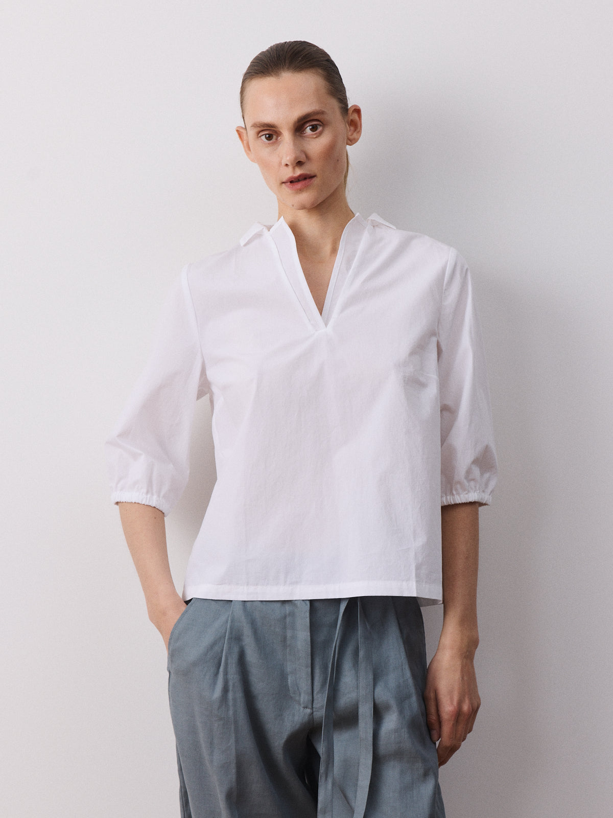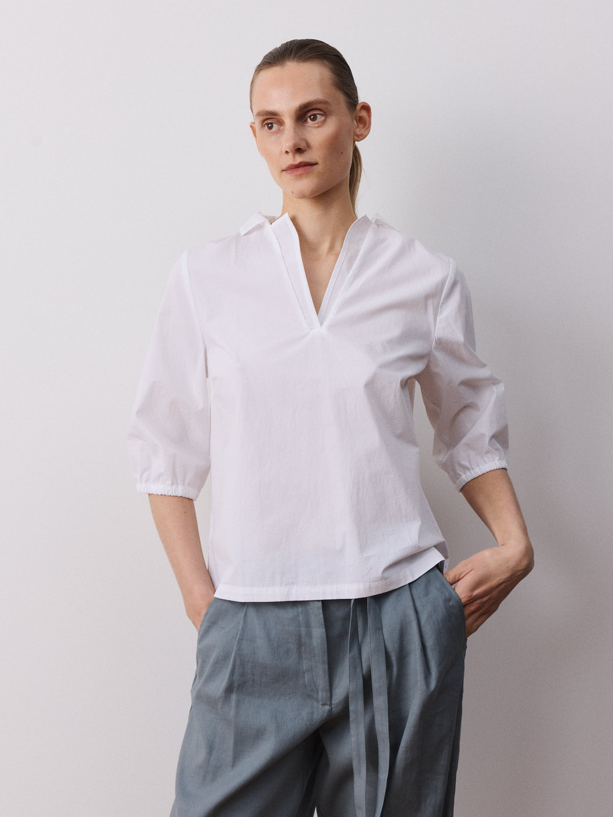 A well-loved design from last season revisited in white cotton, this top returns with the same easy appeal. It features a V-neck with a small polo collar, 3/4 sleeves with elasticated hems and a straight, regular fit.