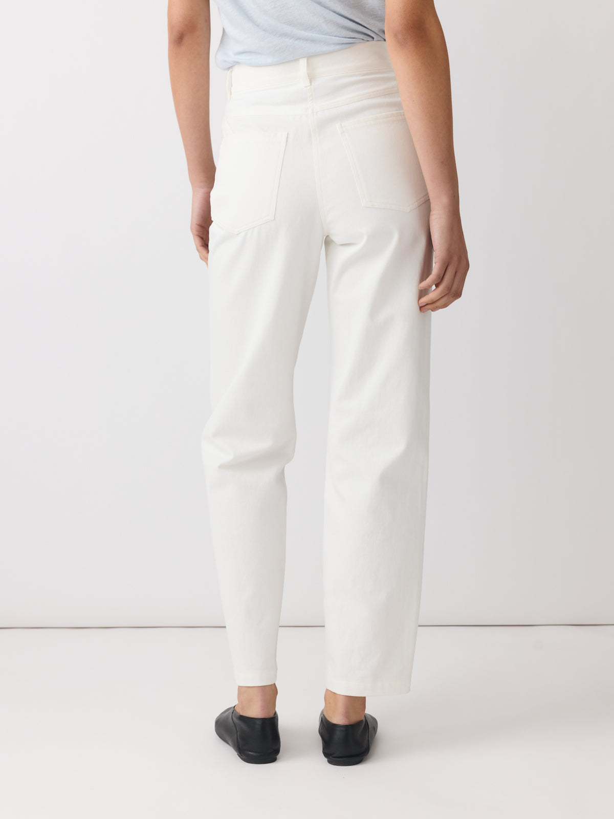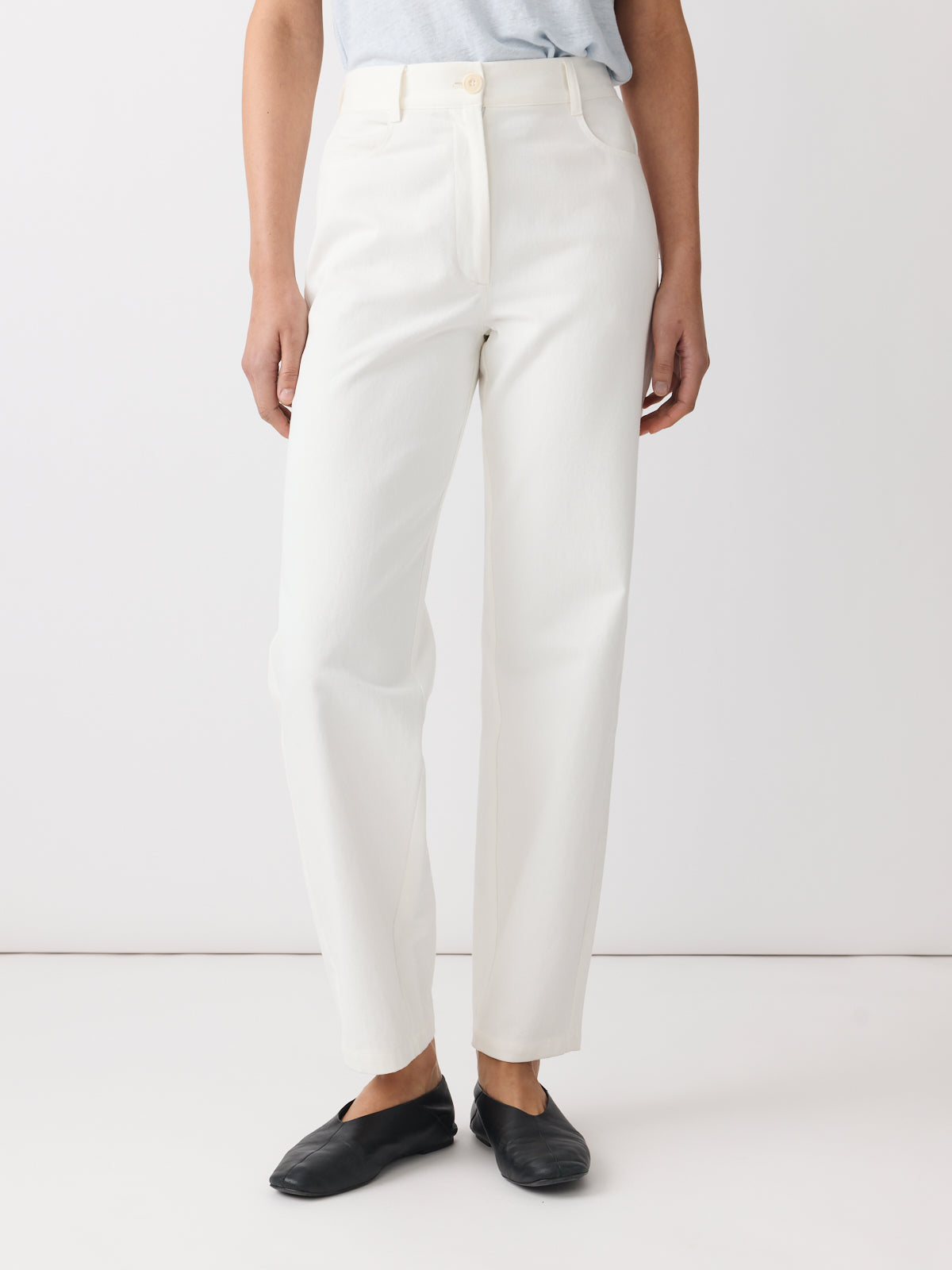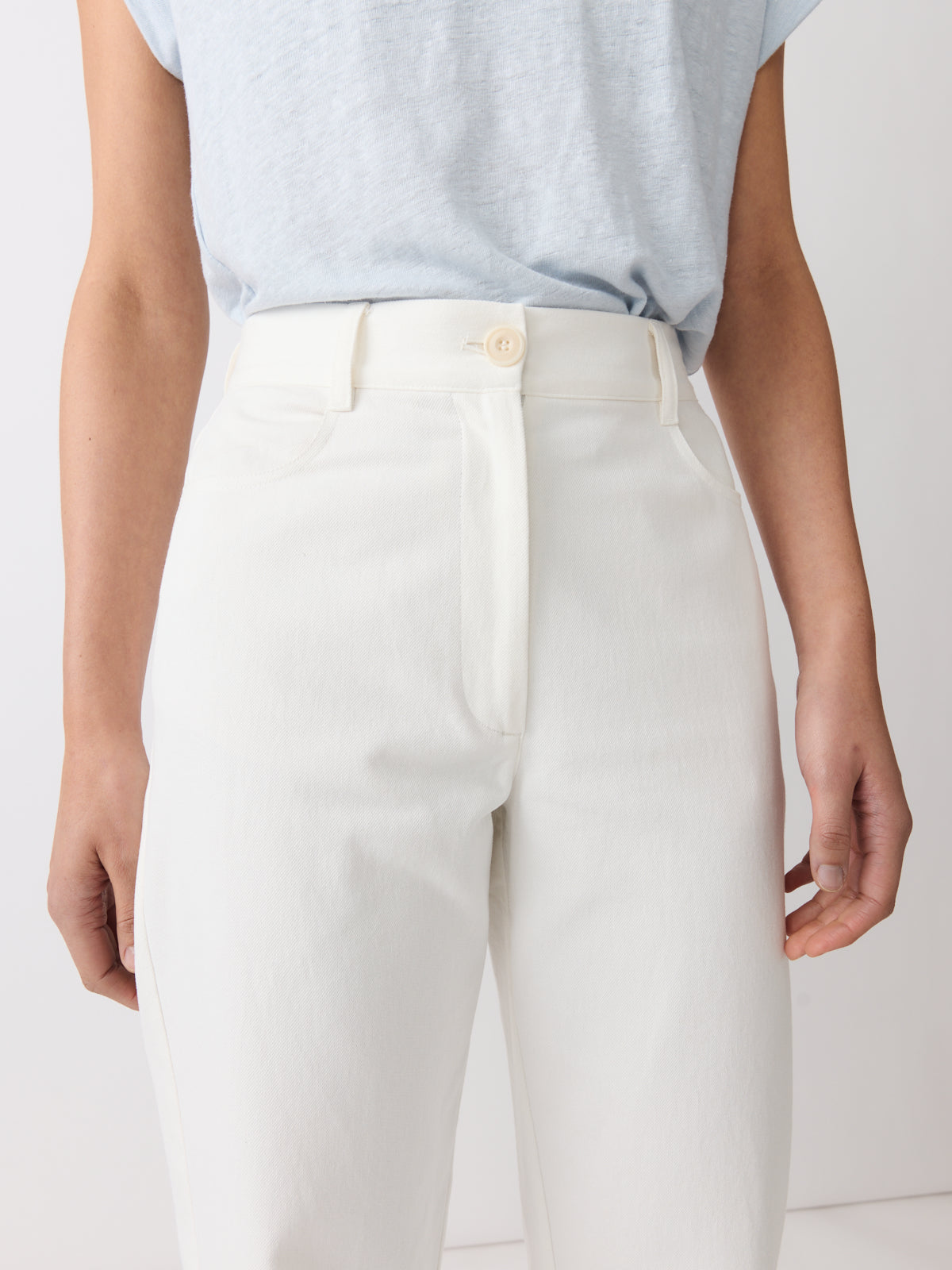 Nothing says summer quite like white trousers, and this pair brings a relaxed denim feel to the season. Crafted from white cotton twill, it features a mid-to-high rise, tapered leg, jeans-inspired detailing and rounded front pockets.