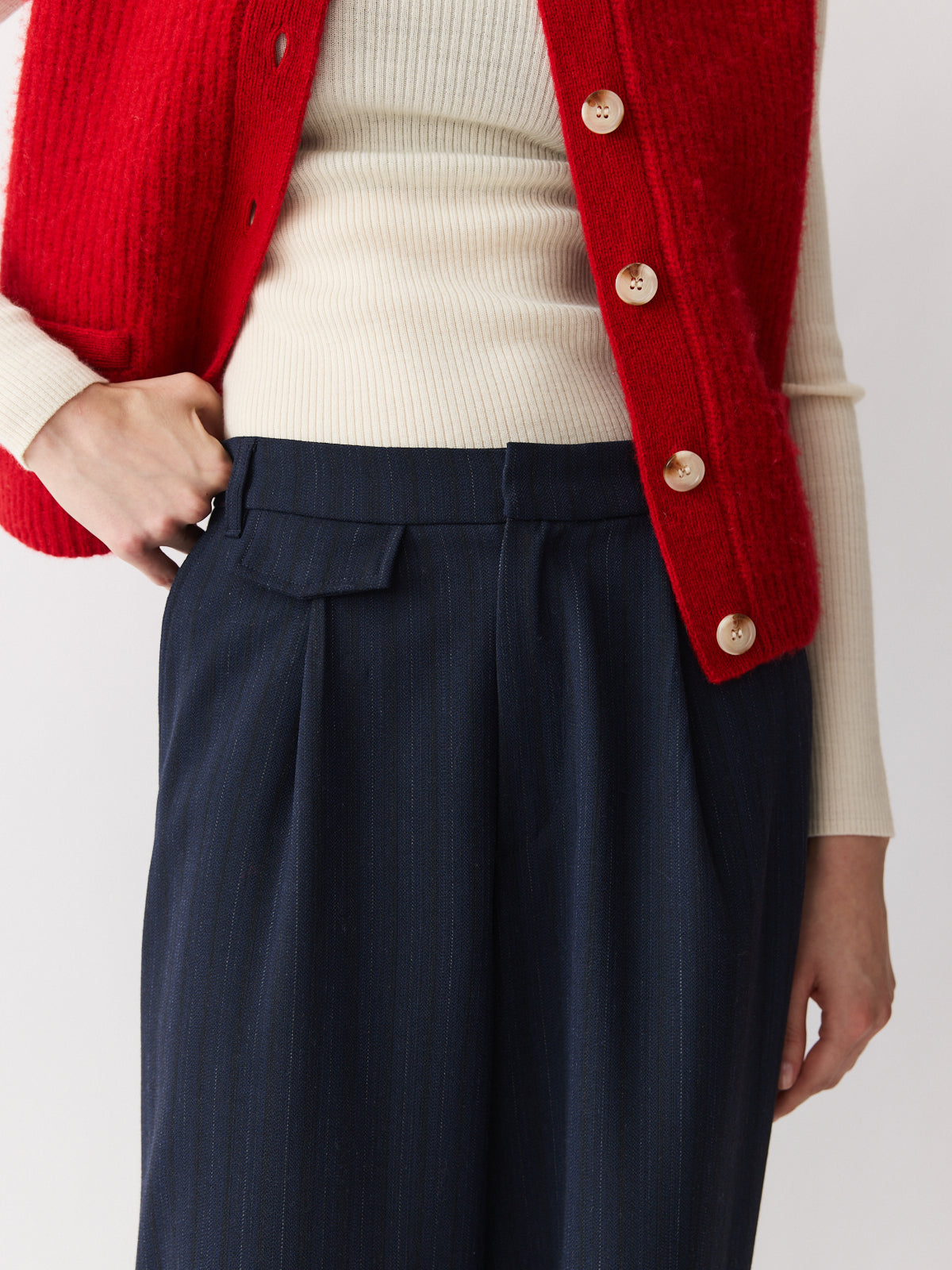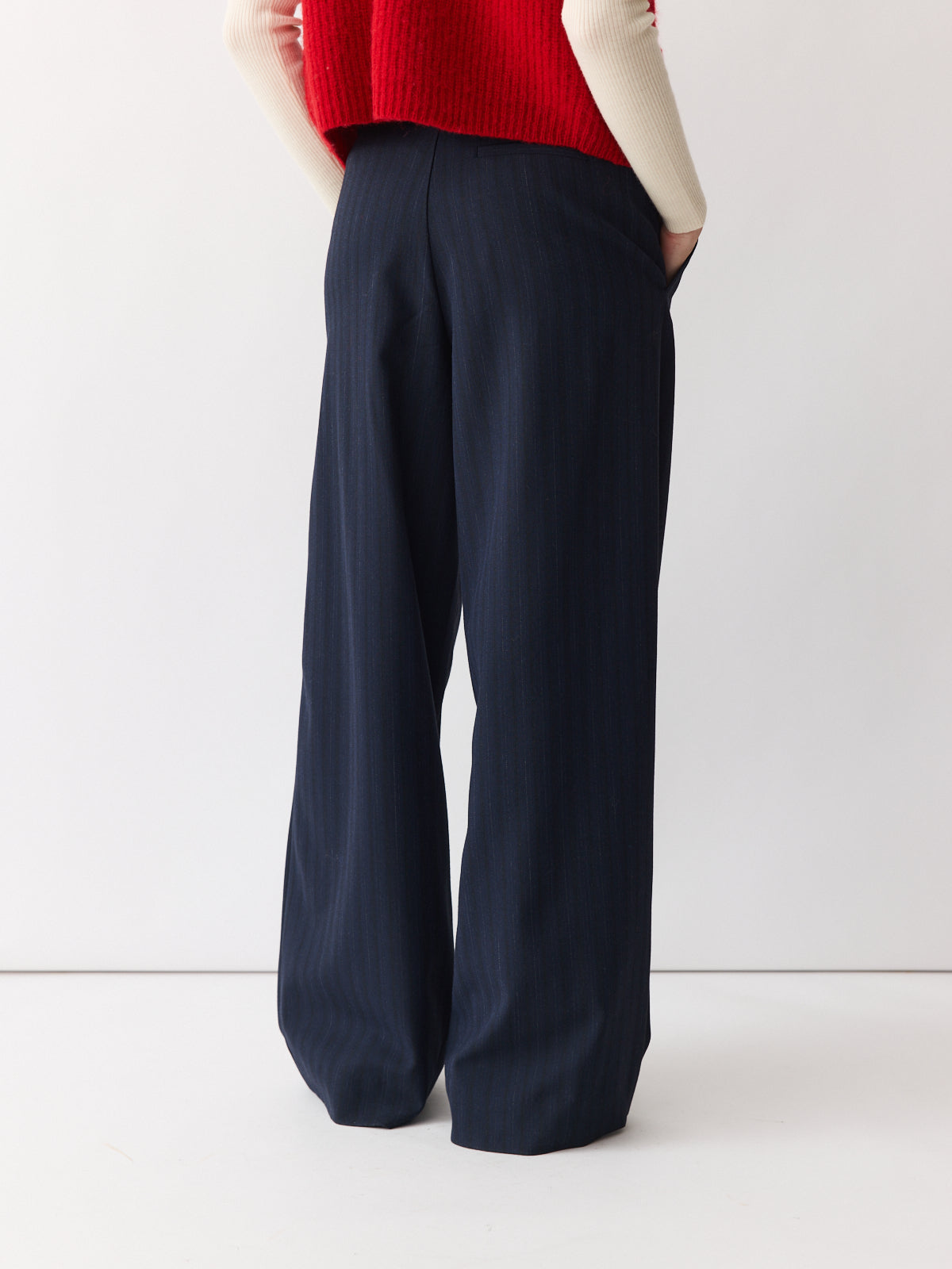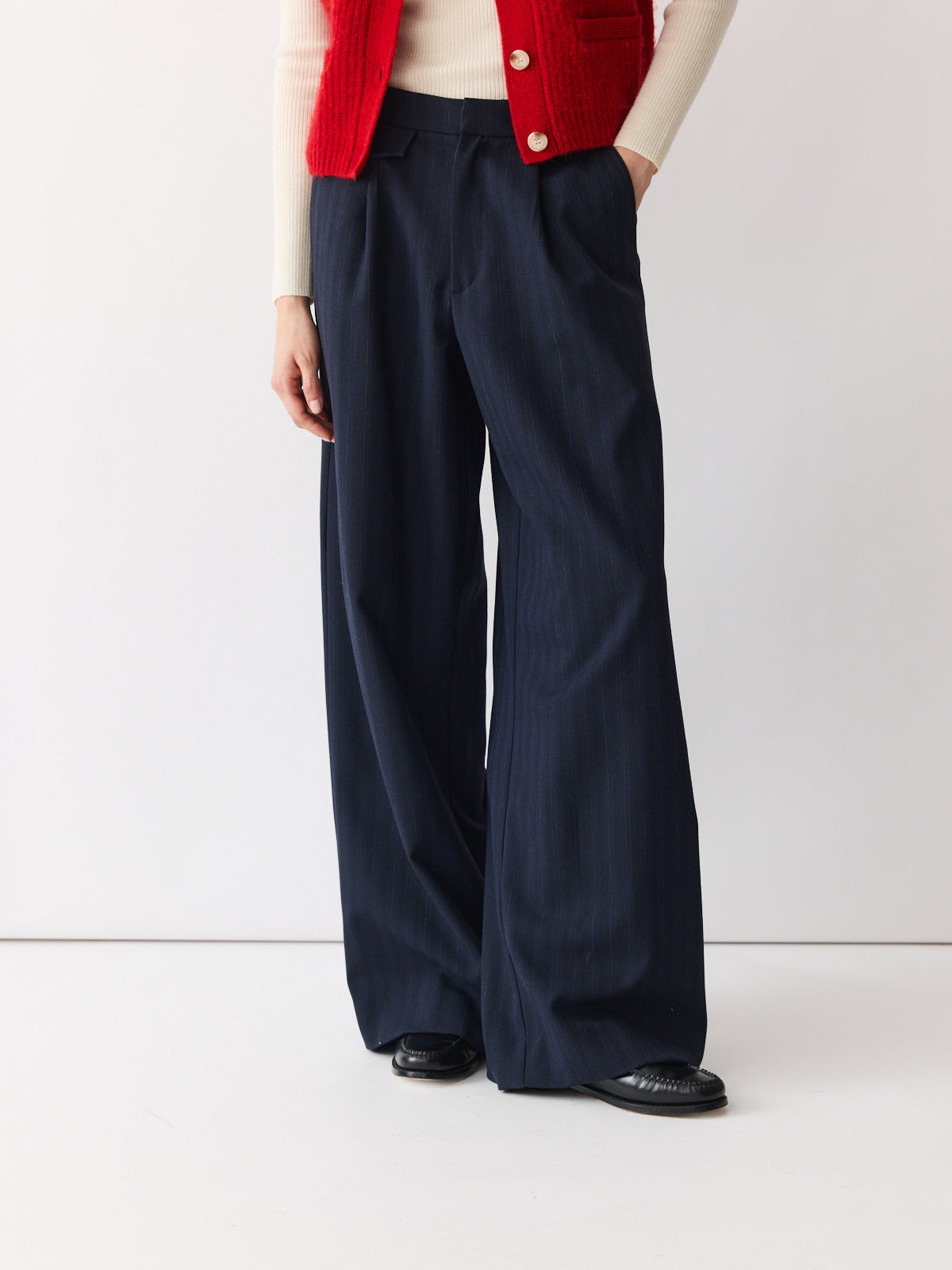 A refined take on a statement trouser. These high-rise, wide-leg trousers feature soft pleats, a flap pocket, and subtle tailoring details. The vertically striped navy fabric adds depth and elongates the silhouette, combining ease with elegance.