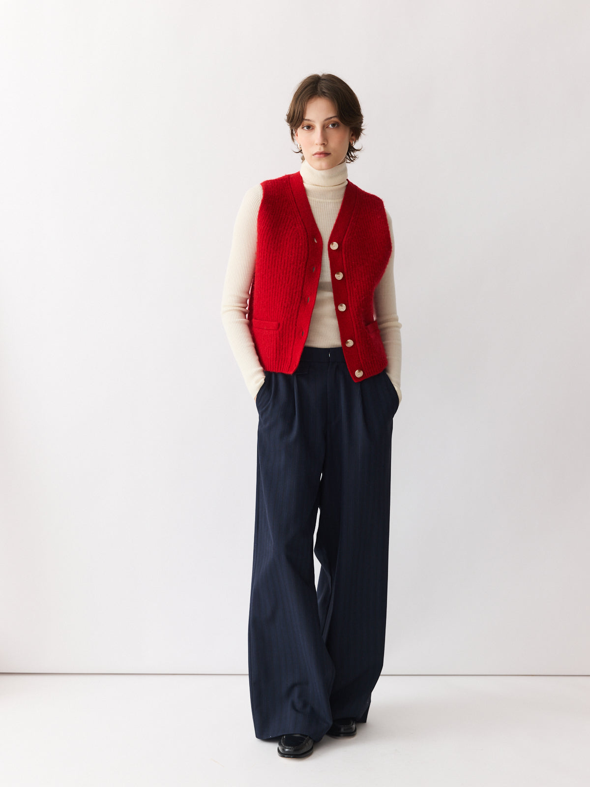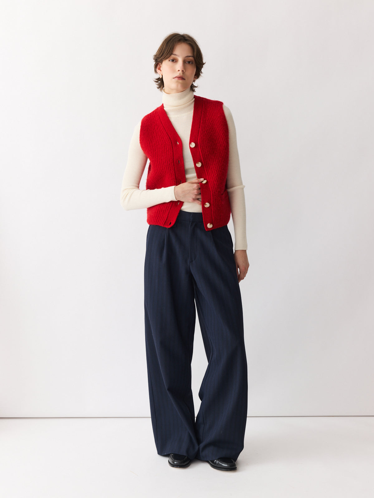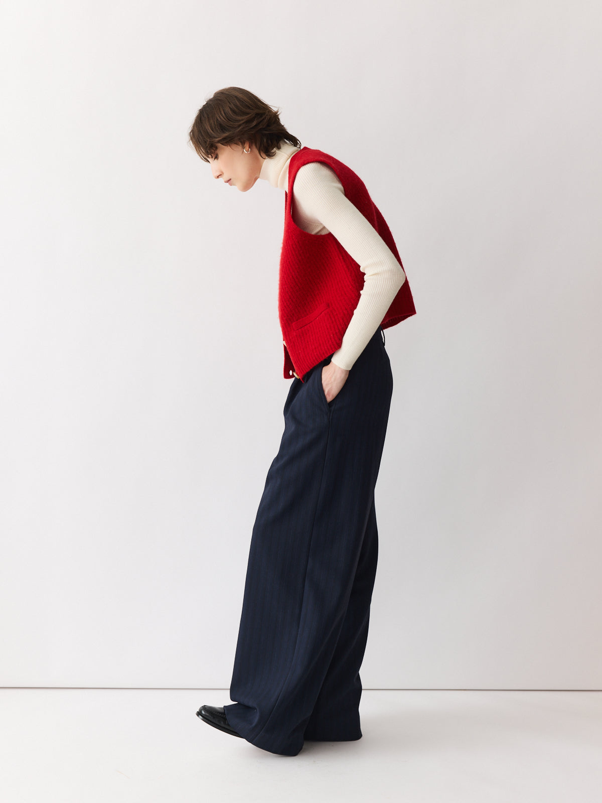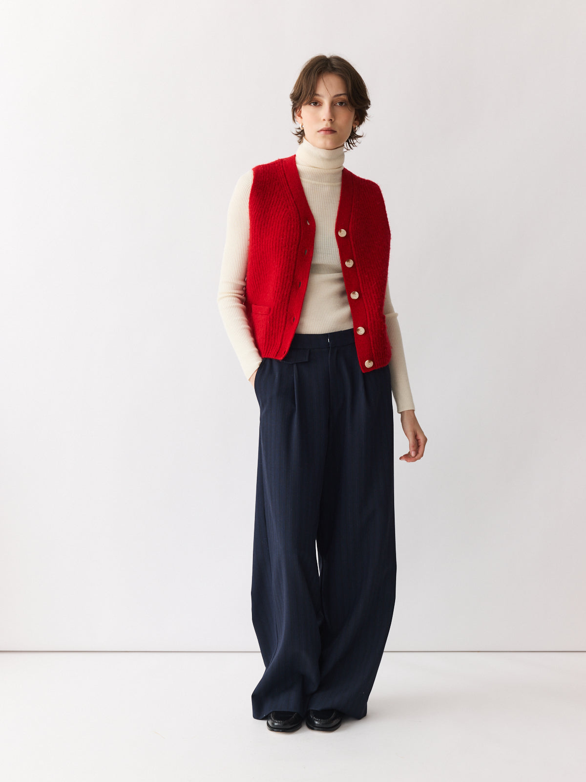 A refined take on a statement trouser. These high-rise, wide-leg trousers feature soft pleats, a flap pocket, and subtle tailoring details. The vertically striped navy fabric adds depth and elongates the silhouette, combining ease with elegance.