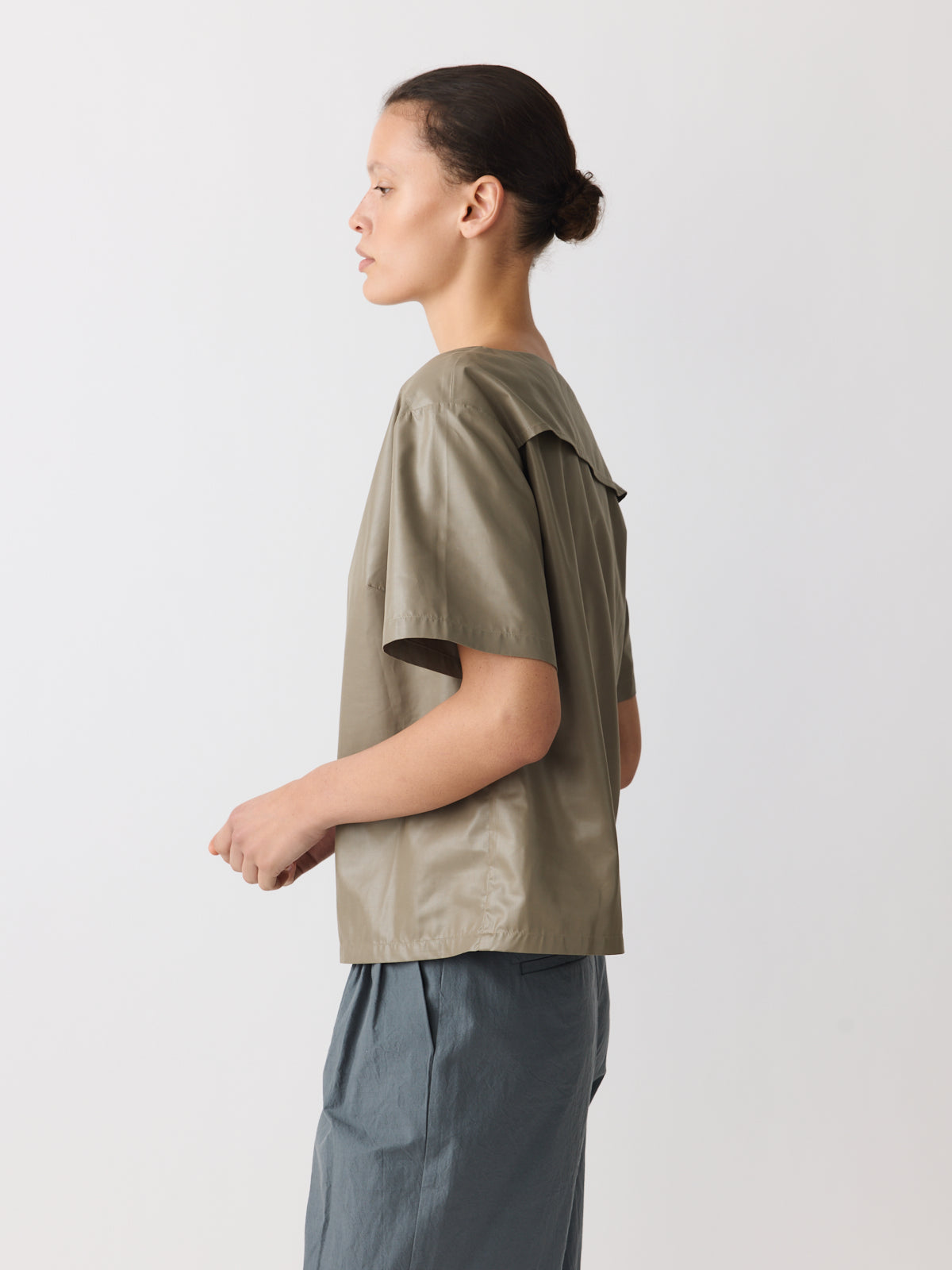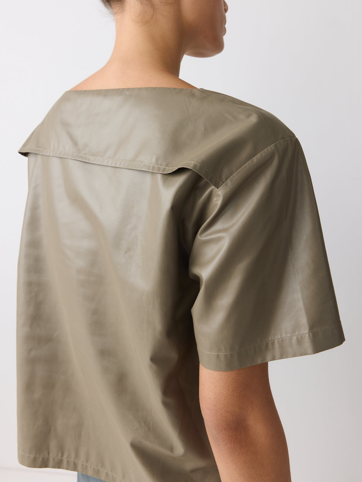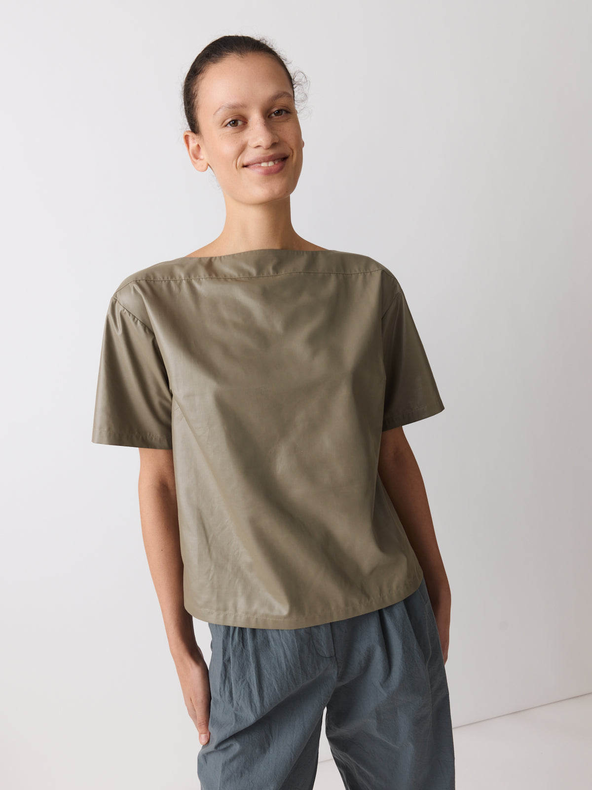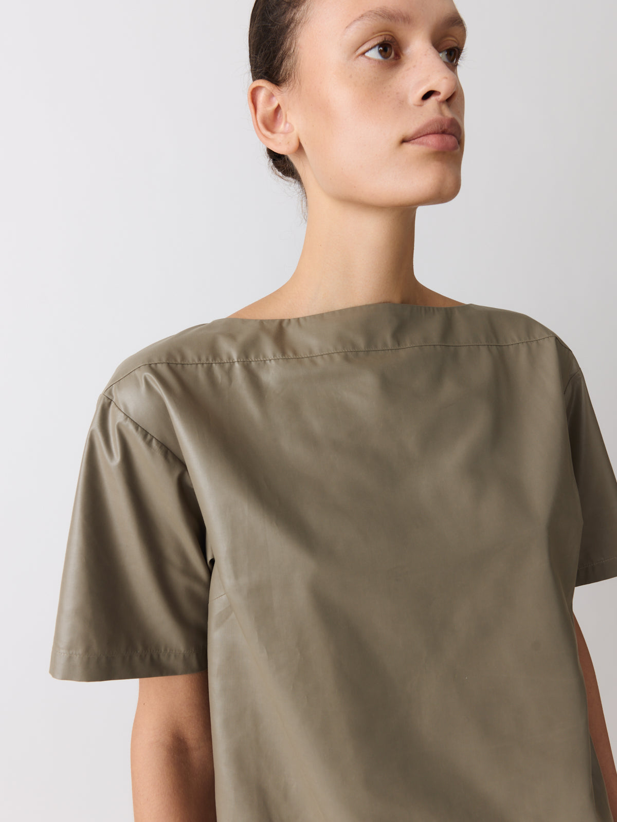 This top stands out through its fabric, crafted from Japanese polyester in a muted khaki clay tone with a lacquered finish. It features a boat neckline, elbow-length sleeves, extended shoulders, a relaxed fit and a back storm flap.